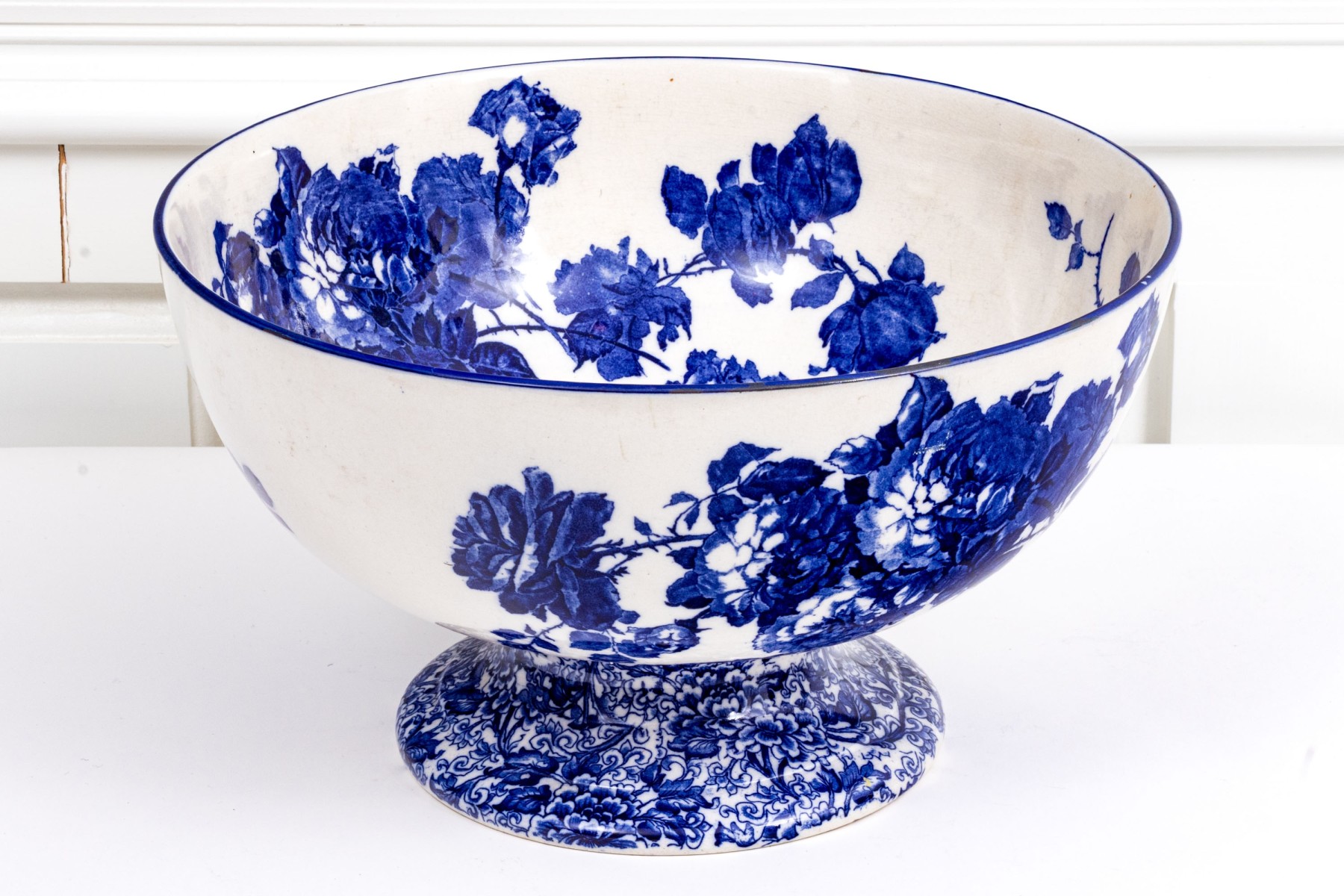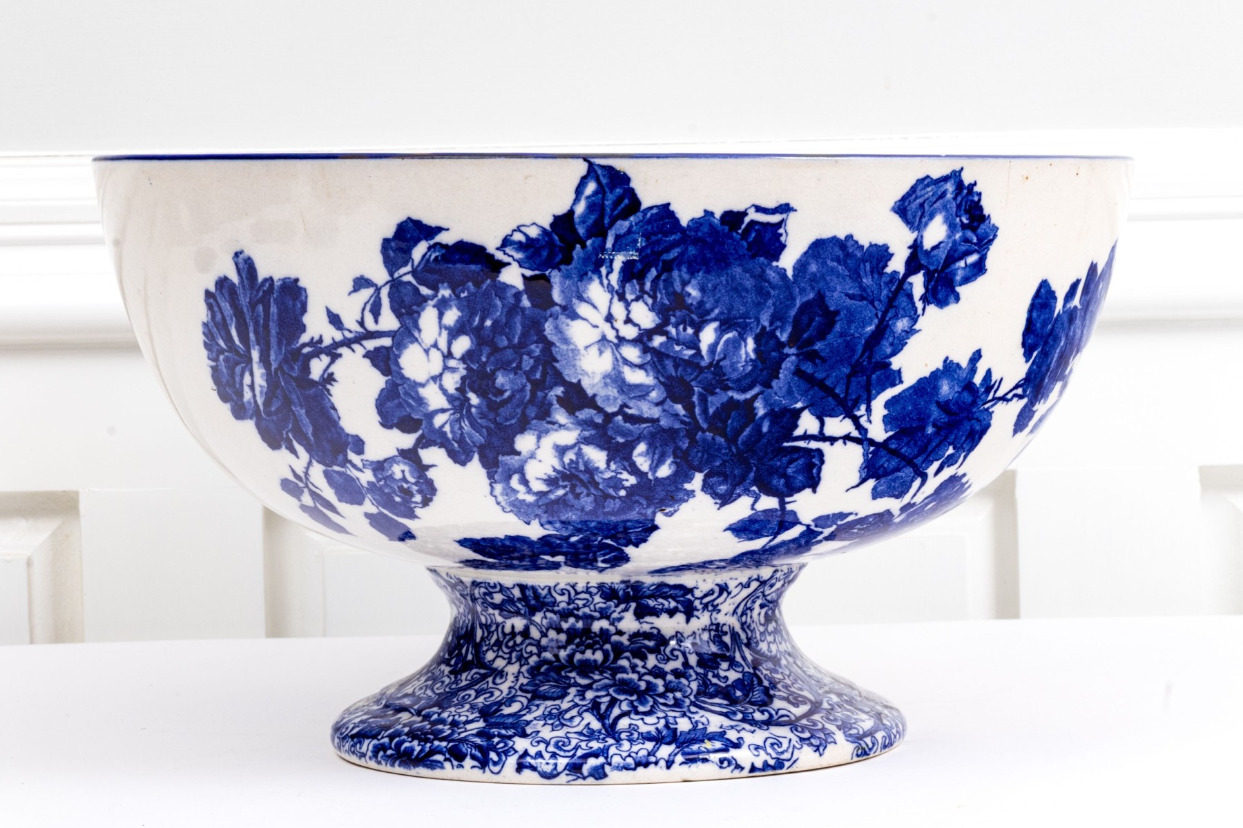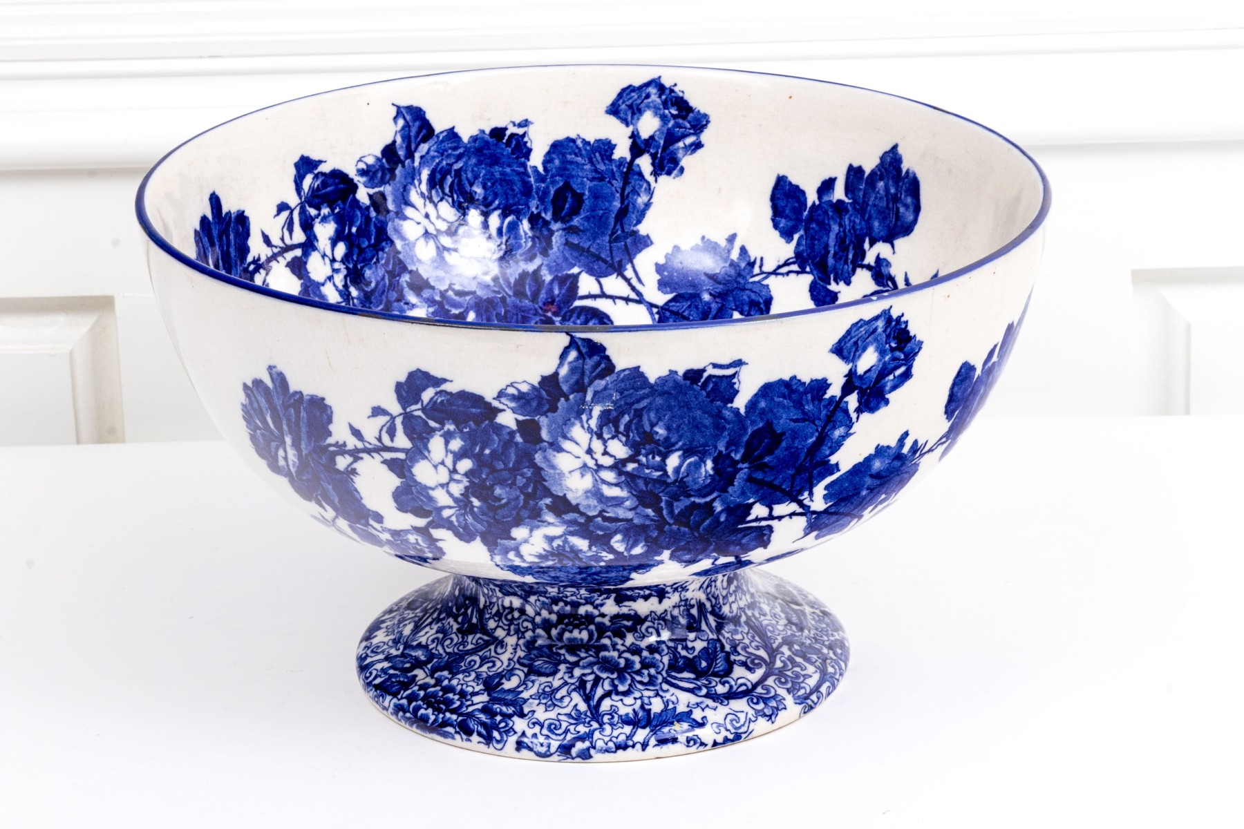 A delightful and well sized antique Royal Doulton centerpiece or punch bowl showcasing a large, deep set bowl with vibrant blue vining florals over a circular pedestal foot with ornate floral designs. Marked underfoot.