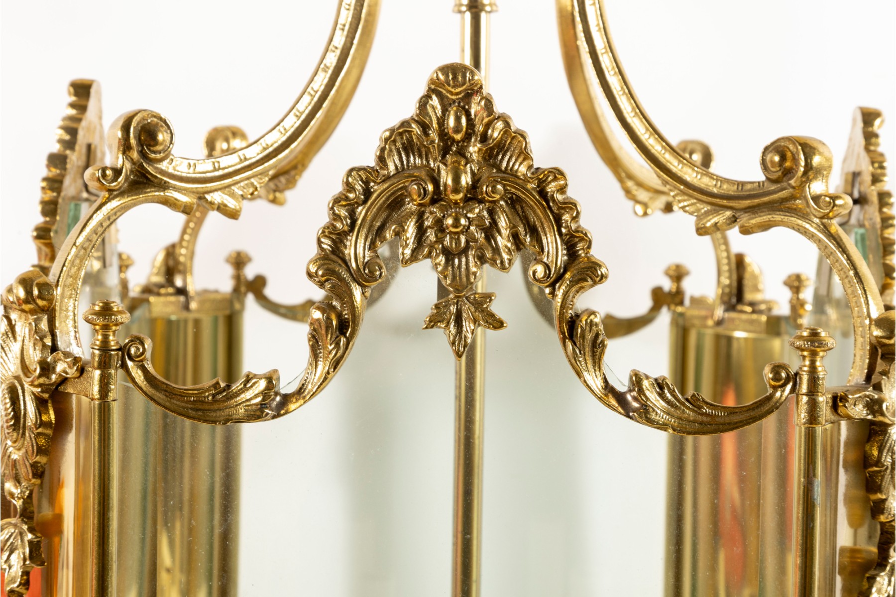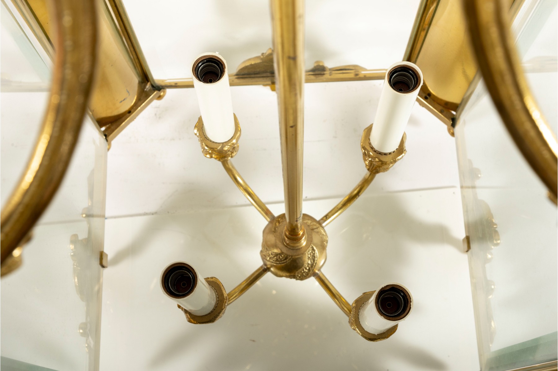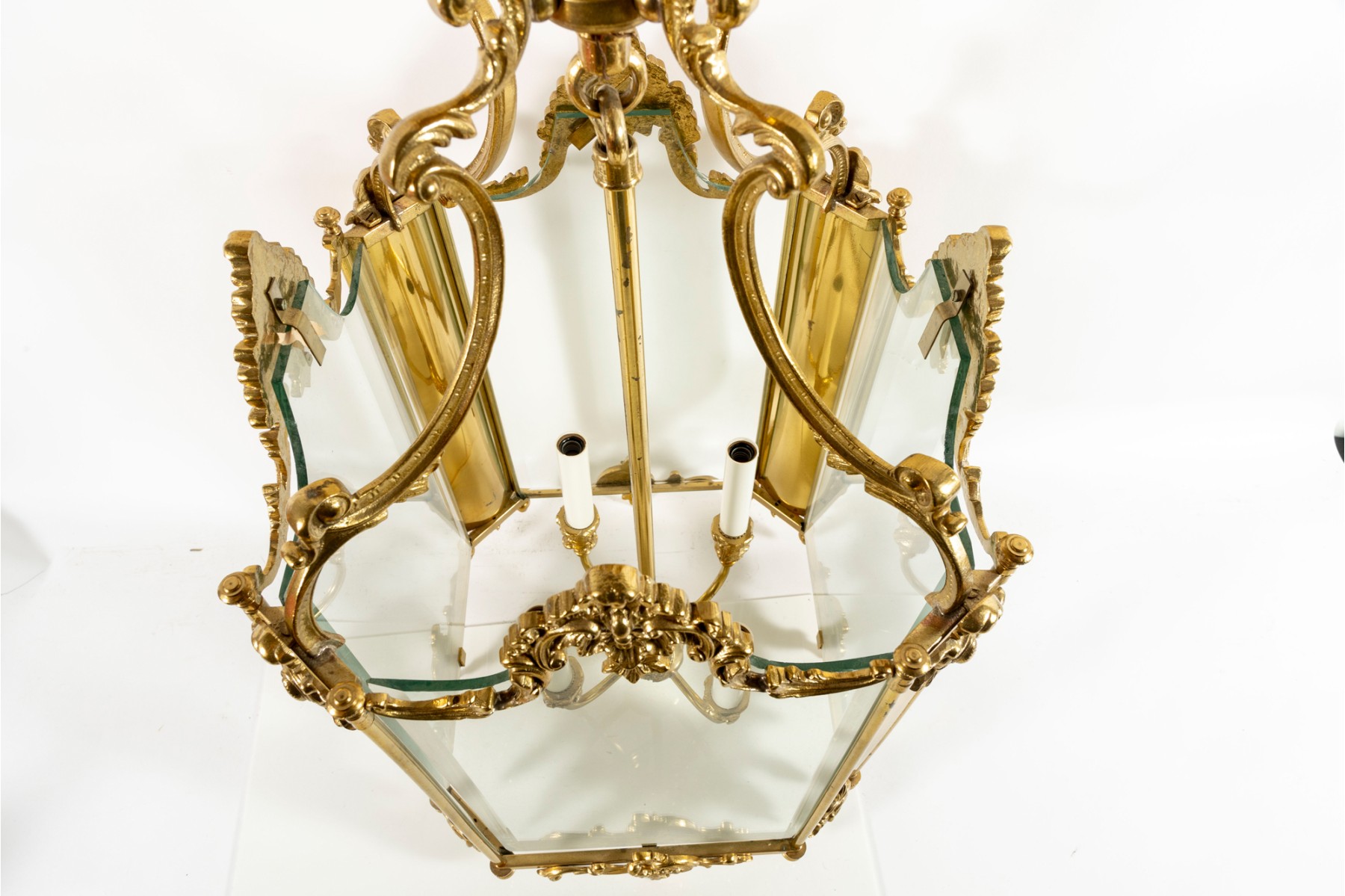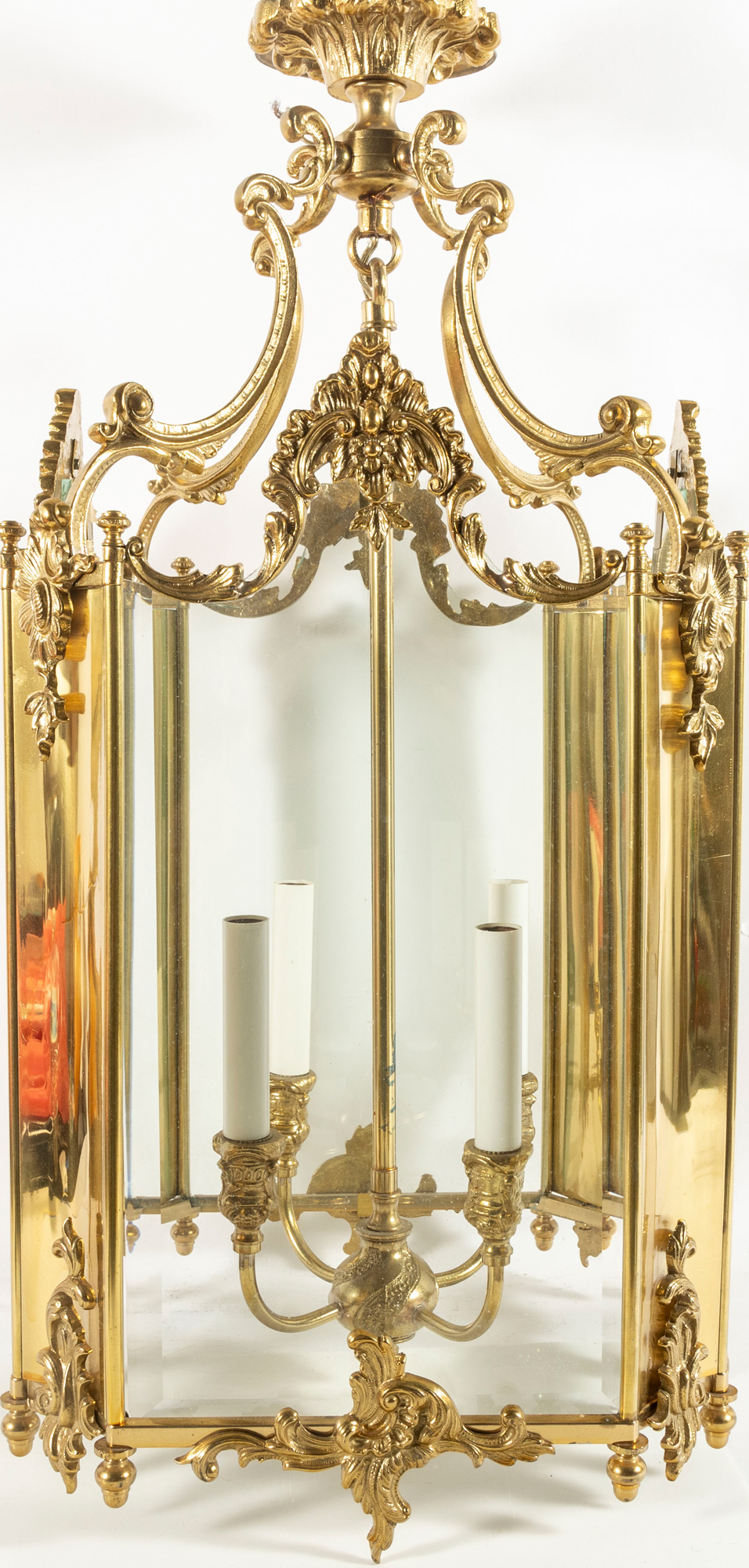 A heavy and well-crafted French style gilt brass lantern chandelier in the Louis XV or Rococo style. Square form with four inset glass panels containing a four-arm drop cluster with scrolling arms and candle sleeves.