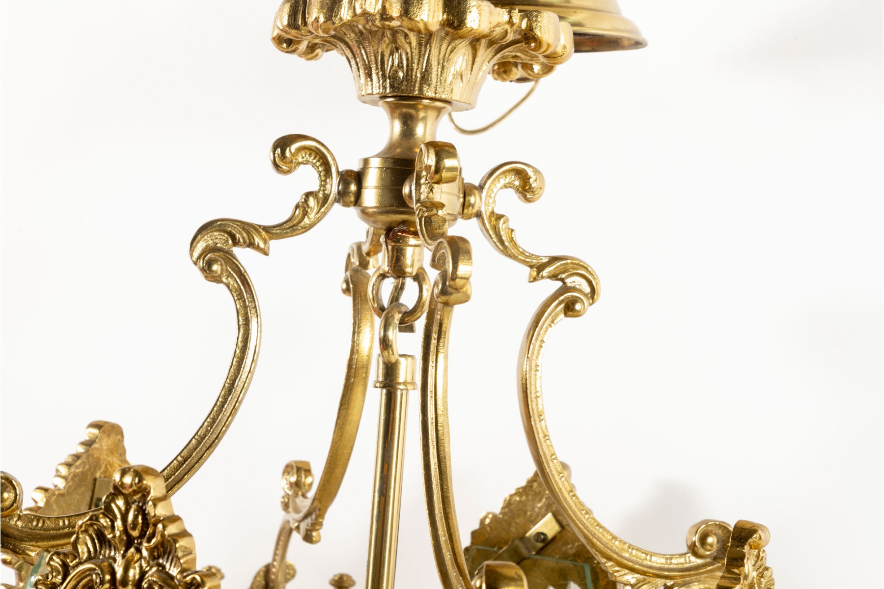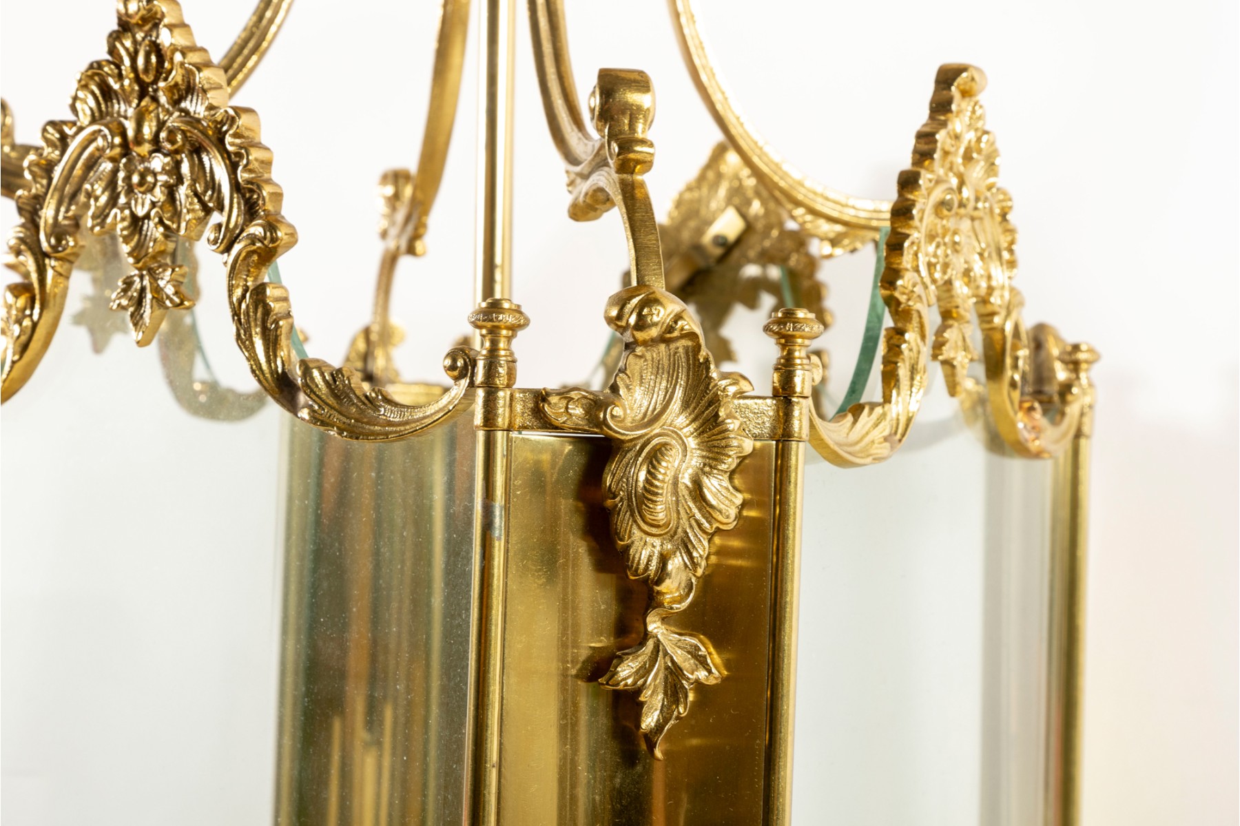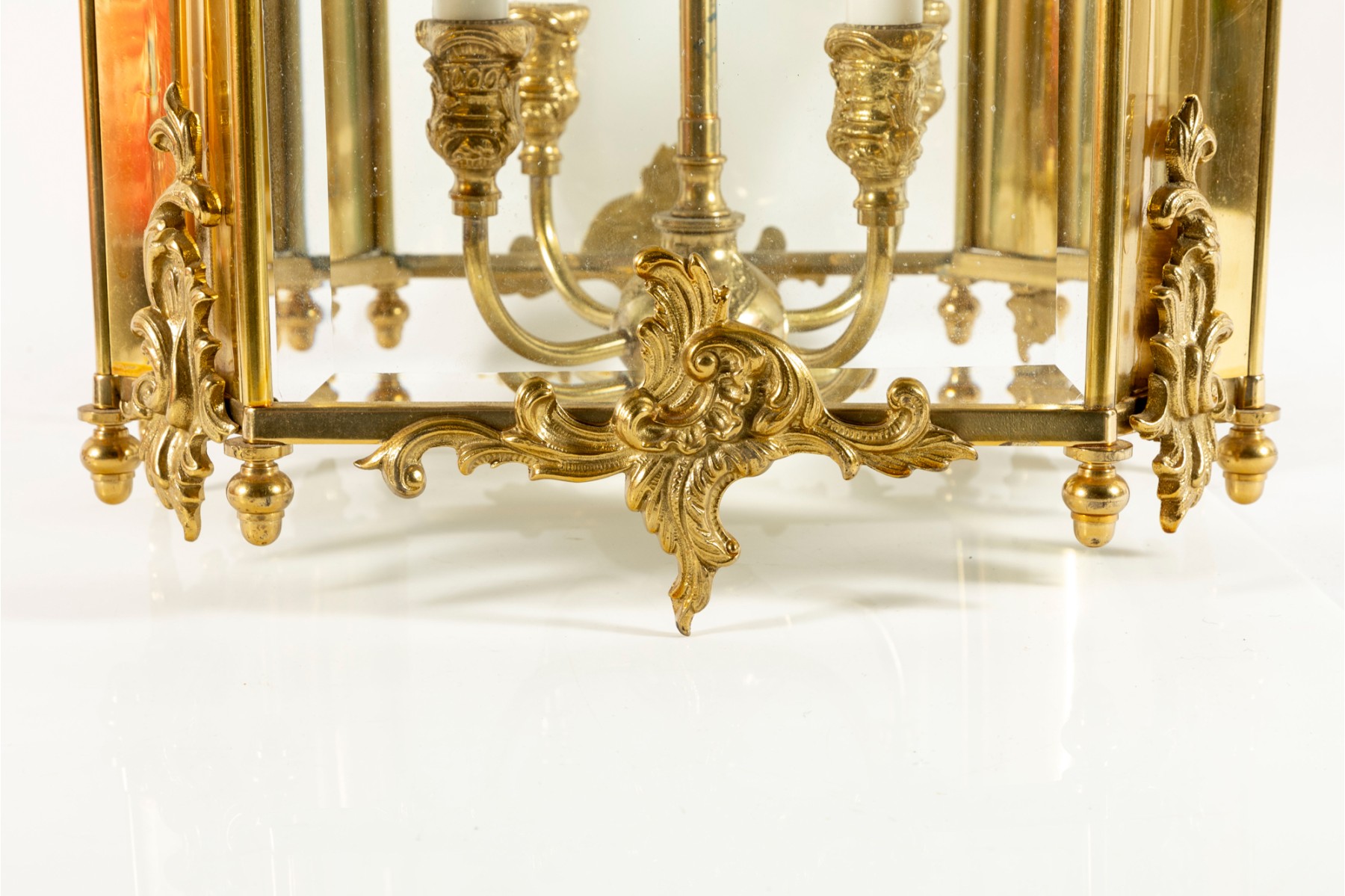A heavy and well-crafted French style gilt brass lantern chandelier in the Louis XV or Rococo style. Square form with four inset glass panels containing a four-arm drop cluster with scrolling arms and candle sleeves.