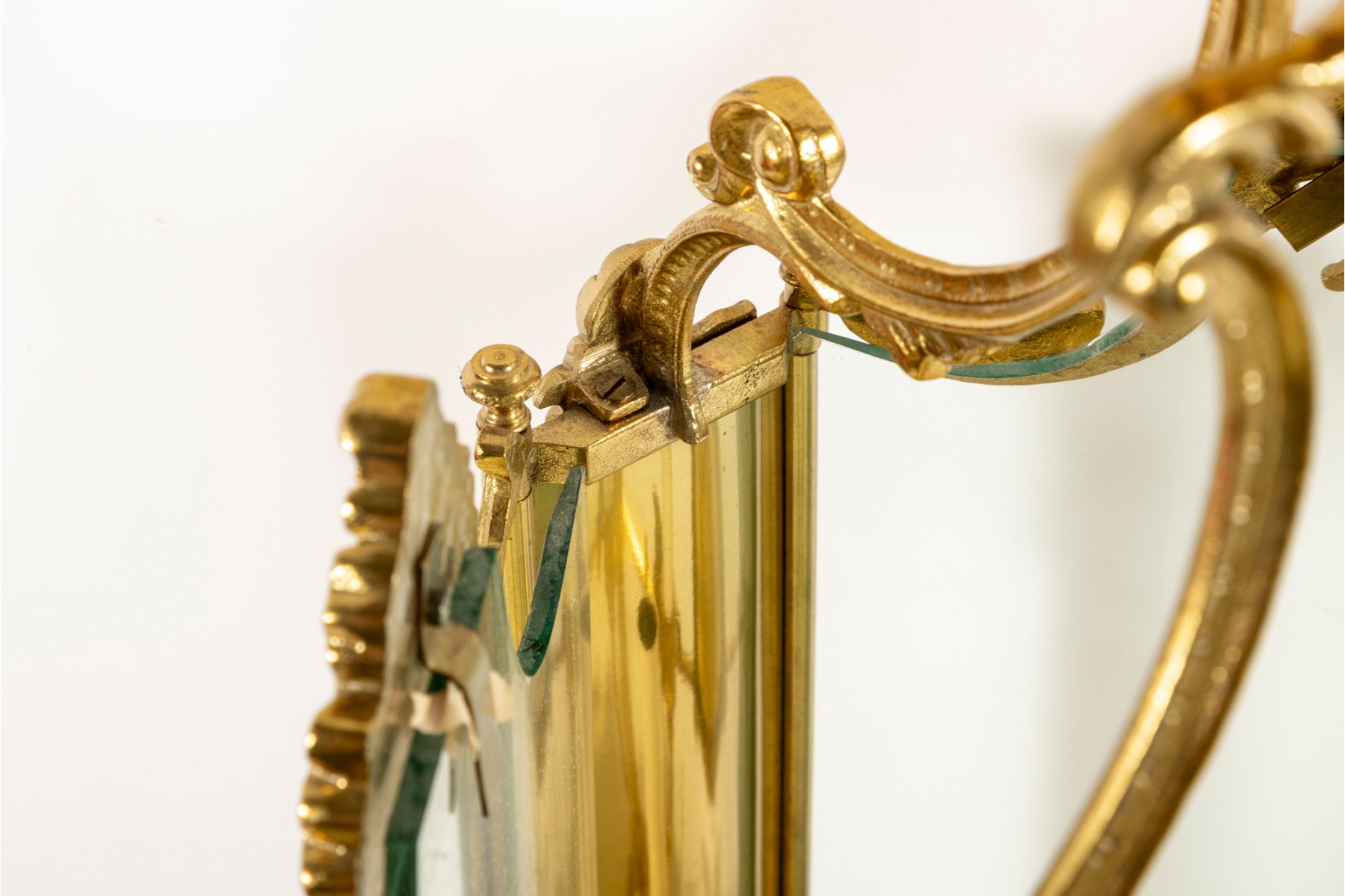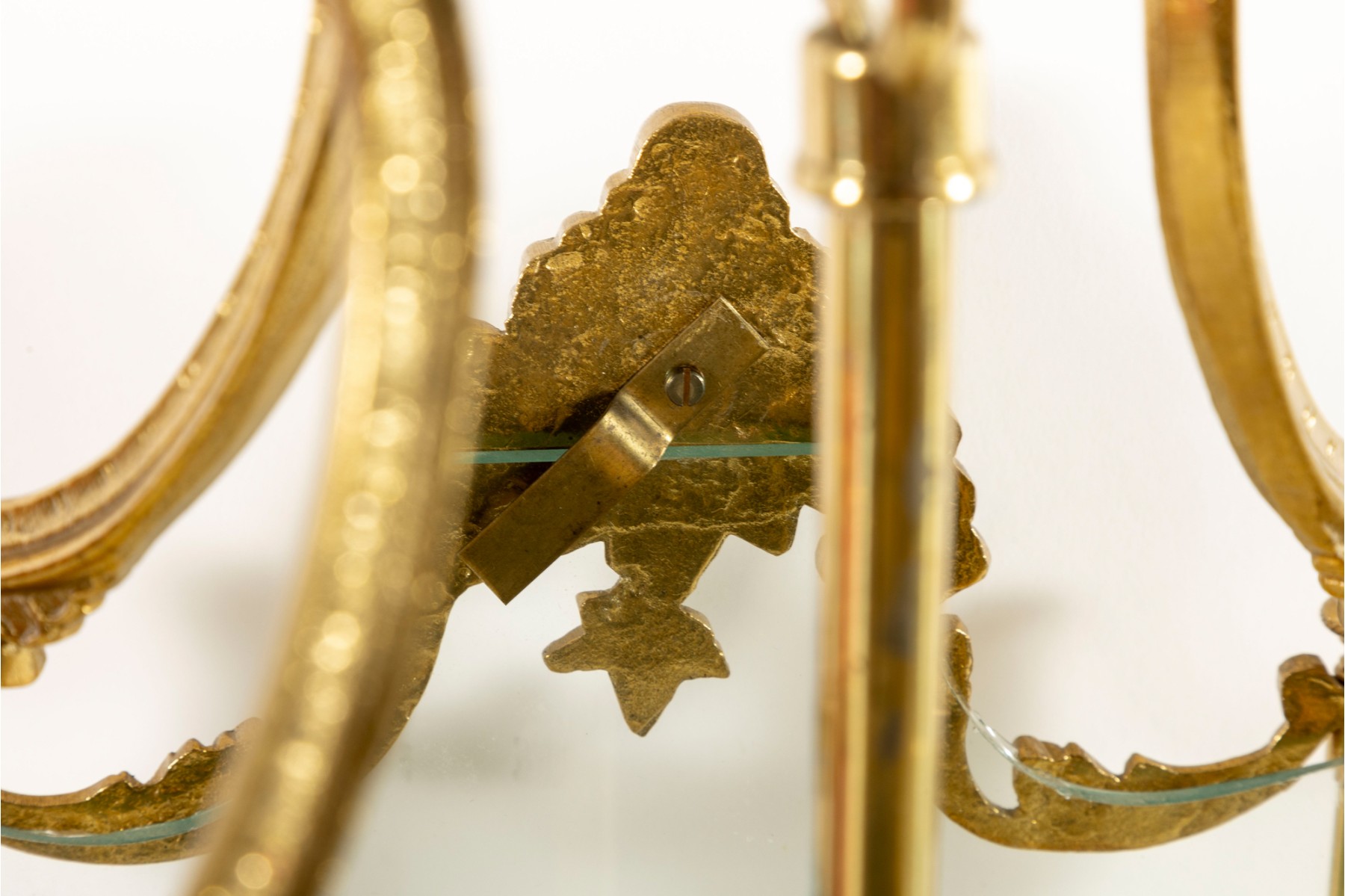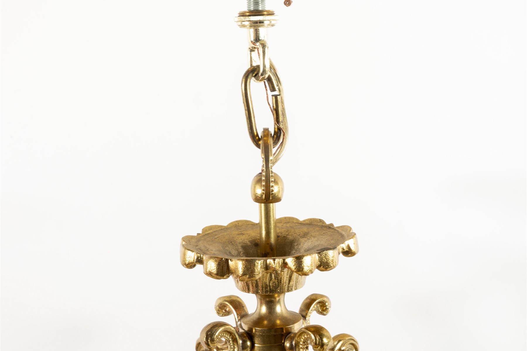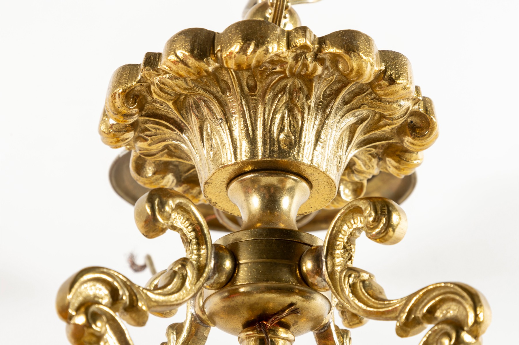 A heavy and well-crafted French style gilt brass lantern chandelier in the Louis XV or Rococo style. Square form with four inset glass panels containing a four-arm drop cluster with scrolling arms and candle sleeves.