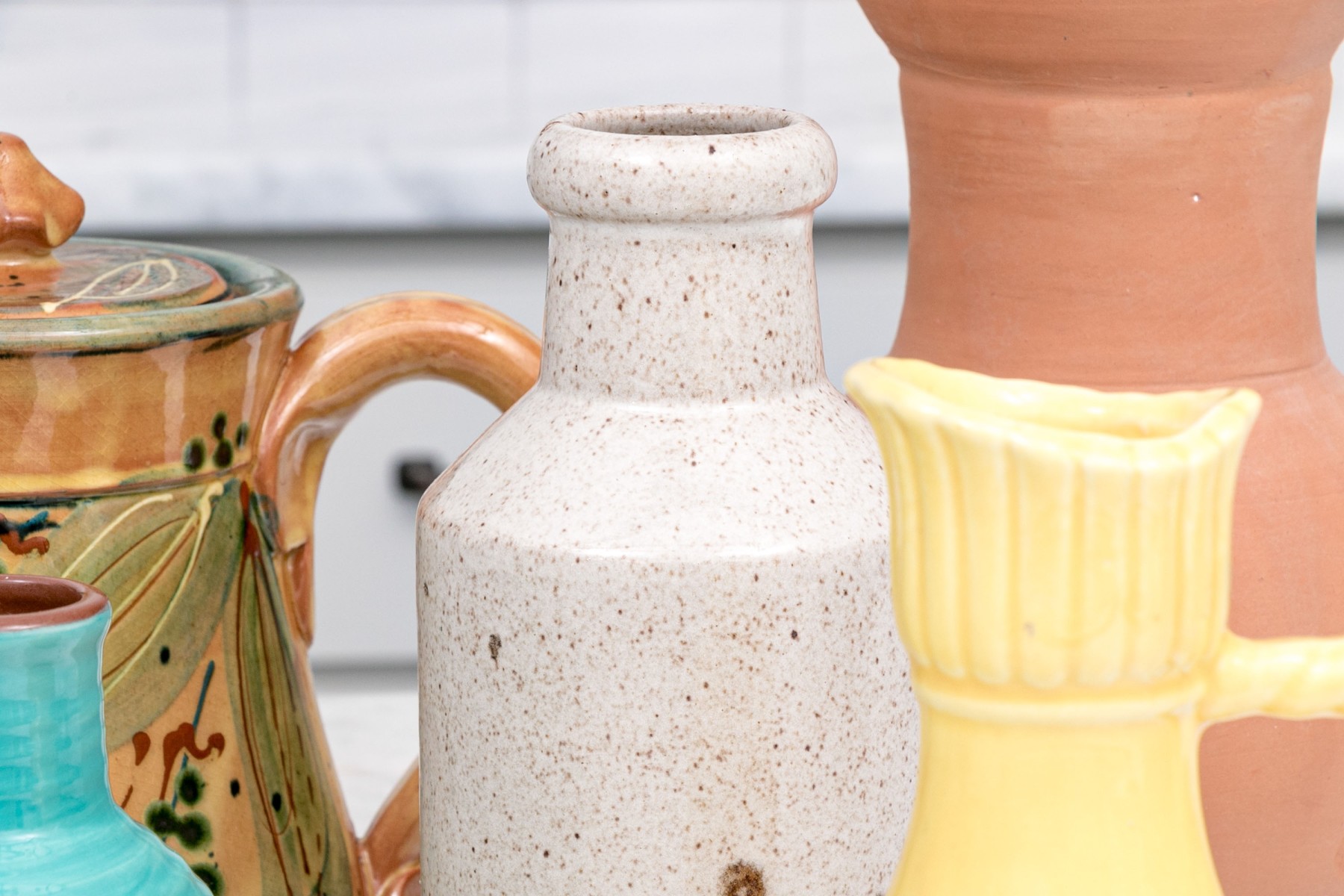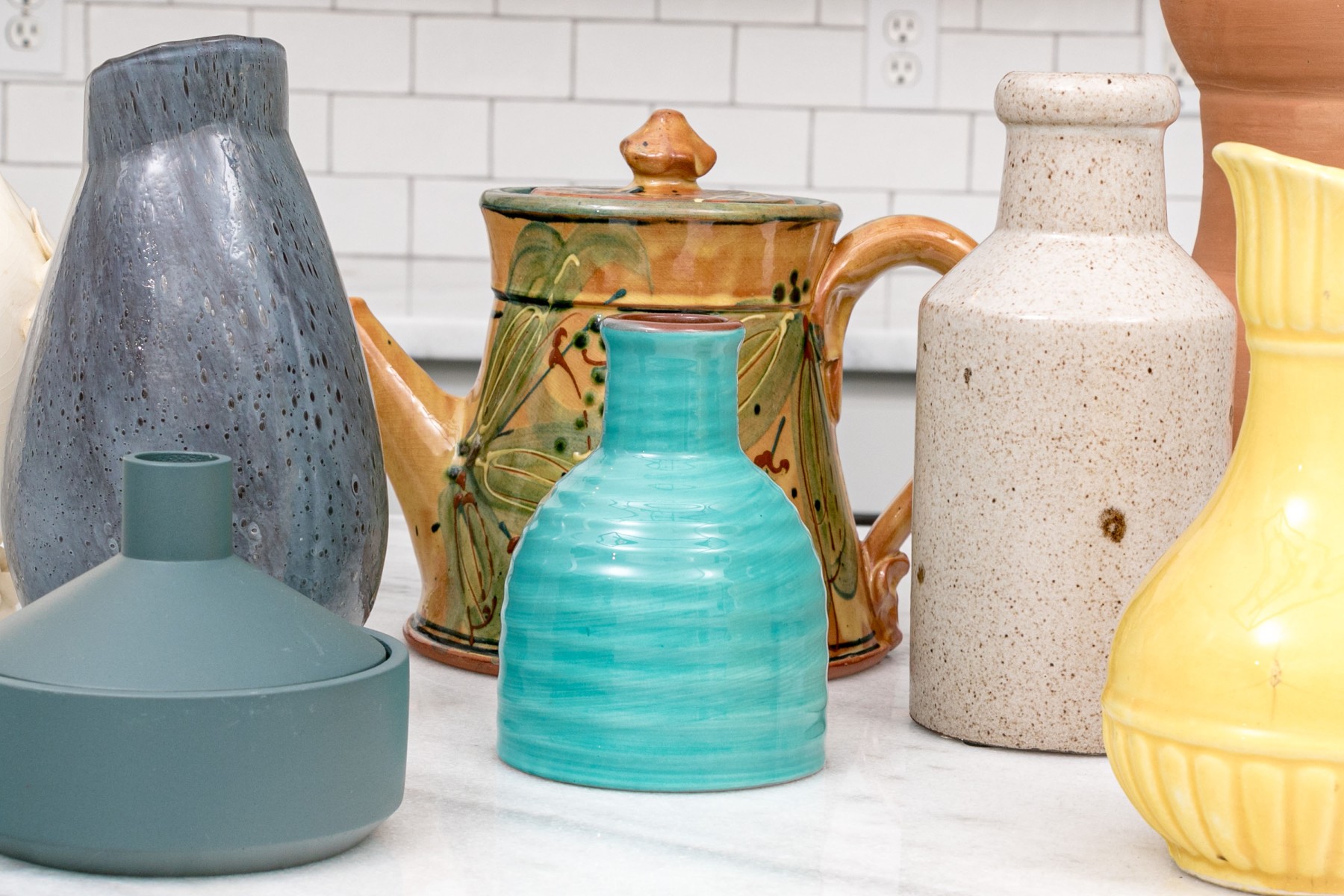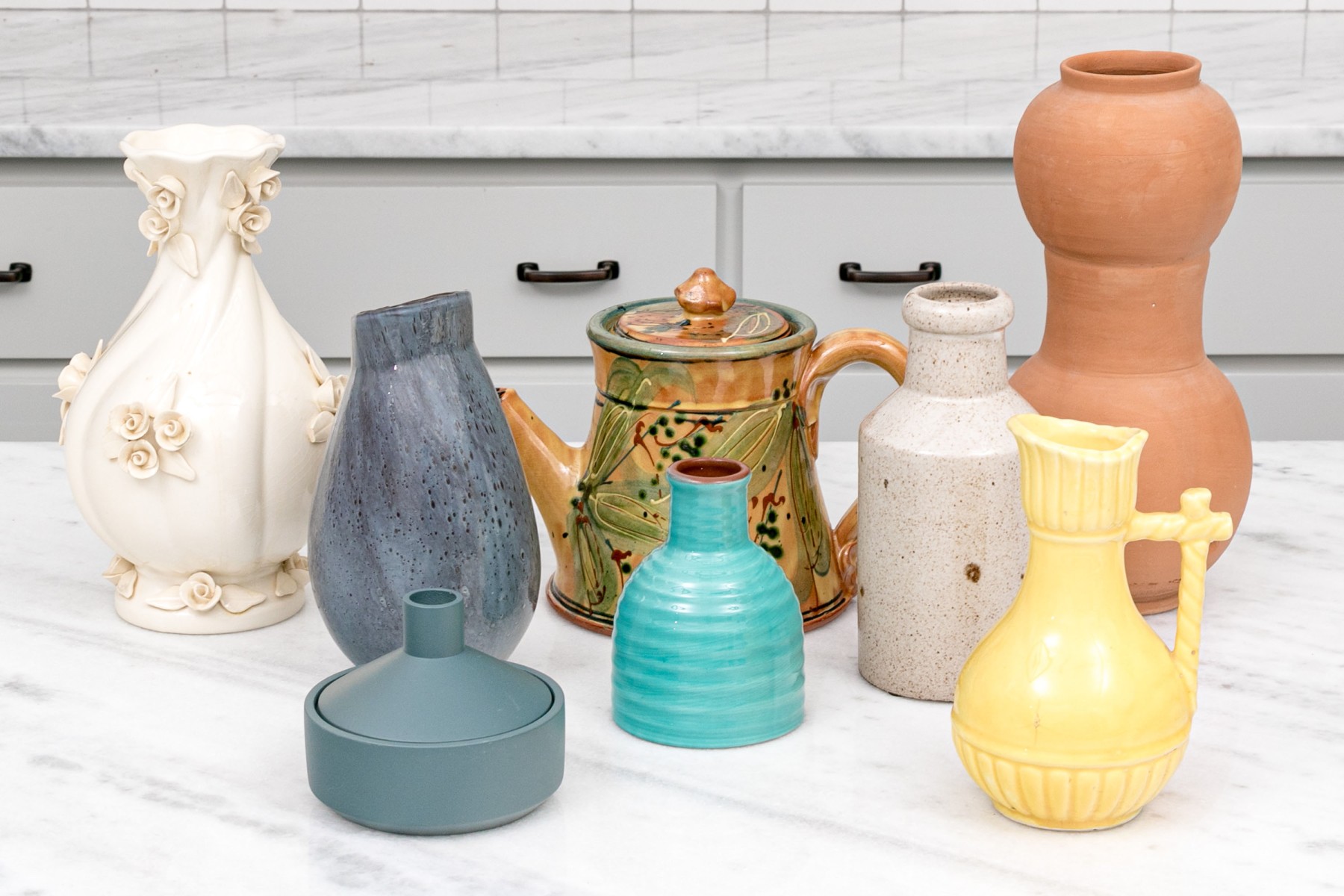 Includes a lidded mortar, ewers, vases, lidded teapots all with mixed glaze.