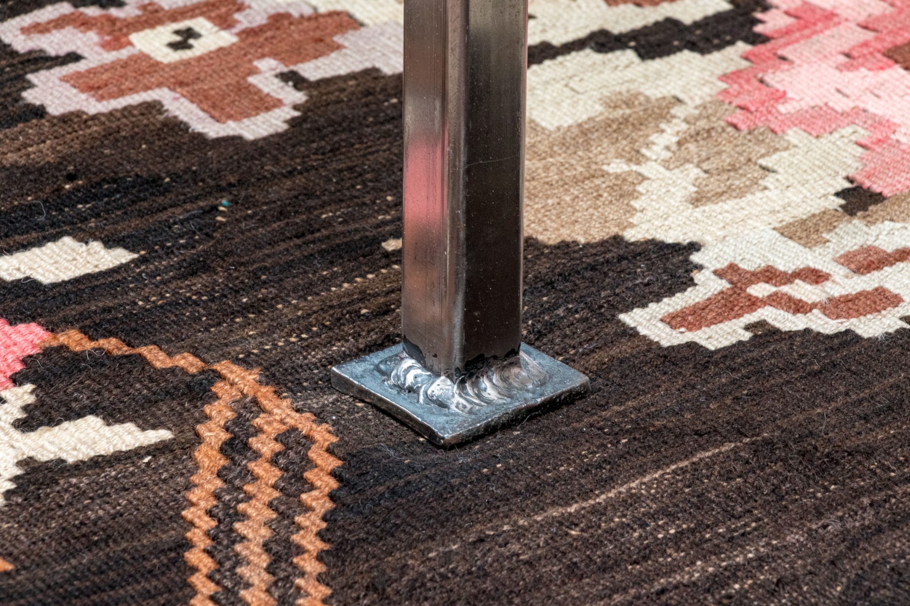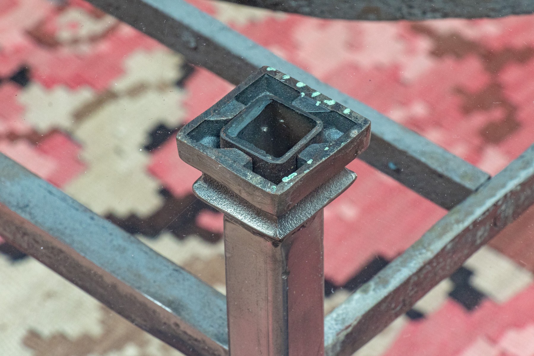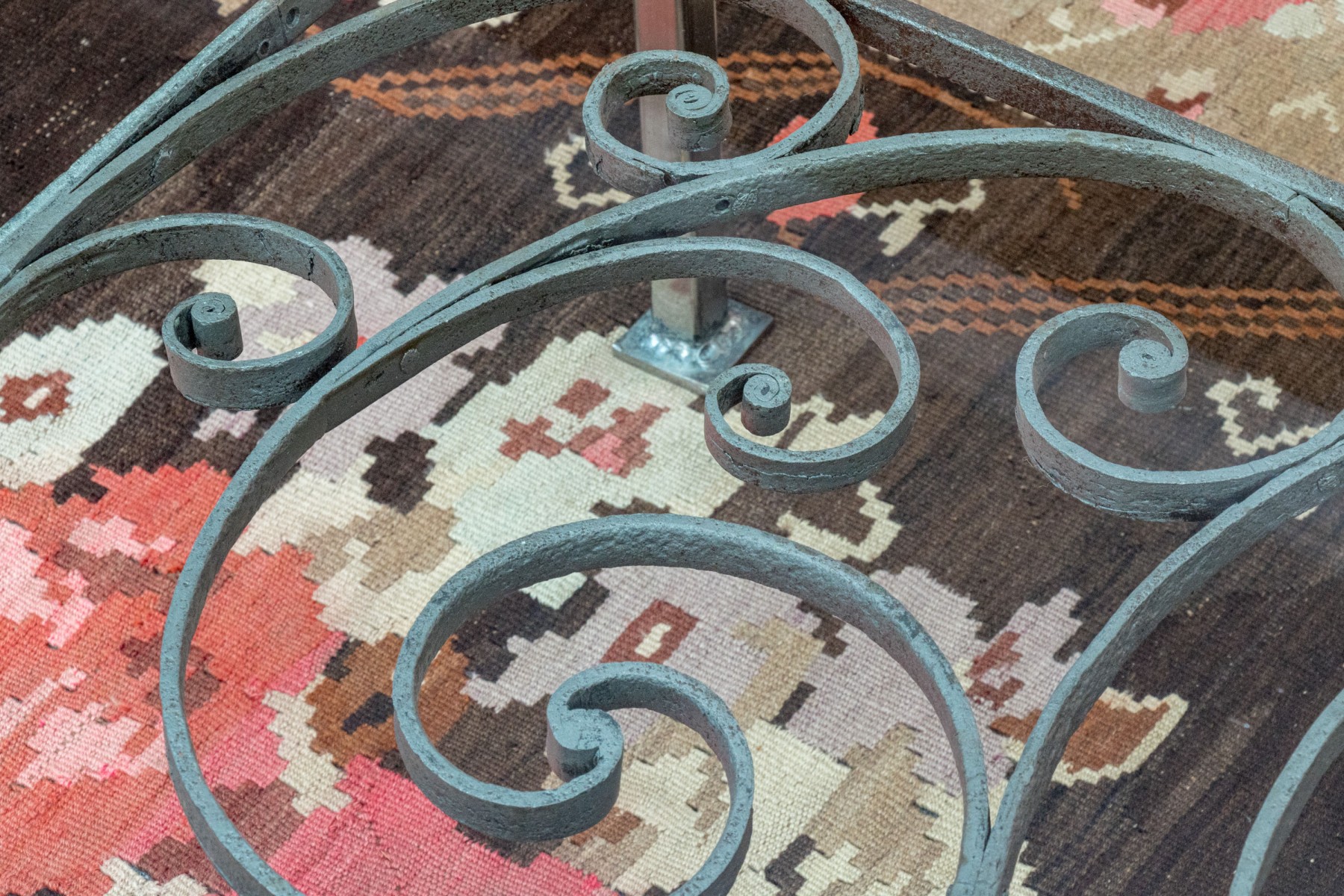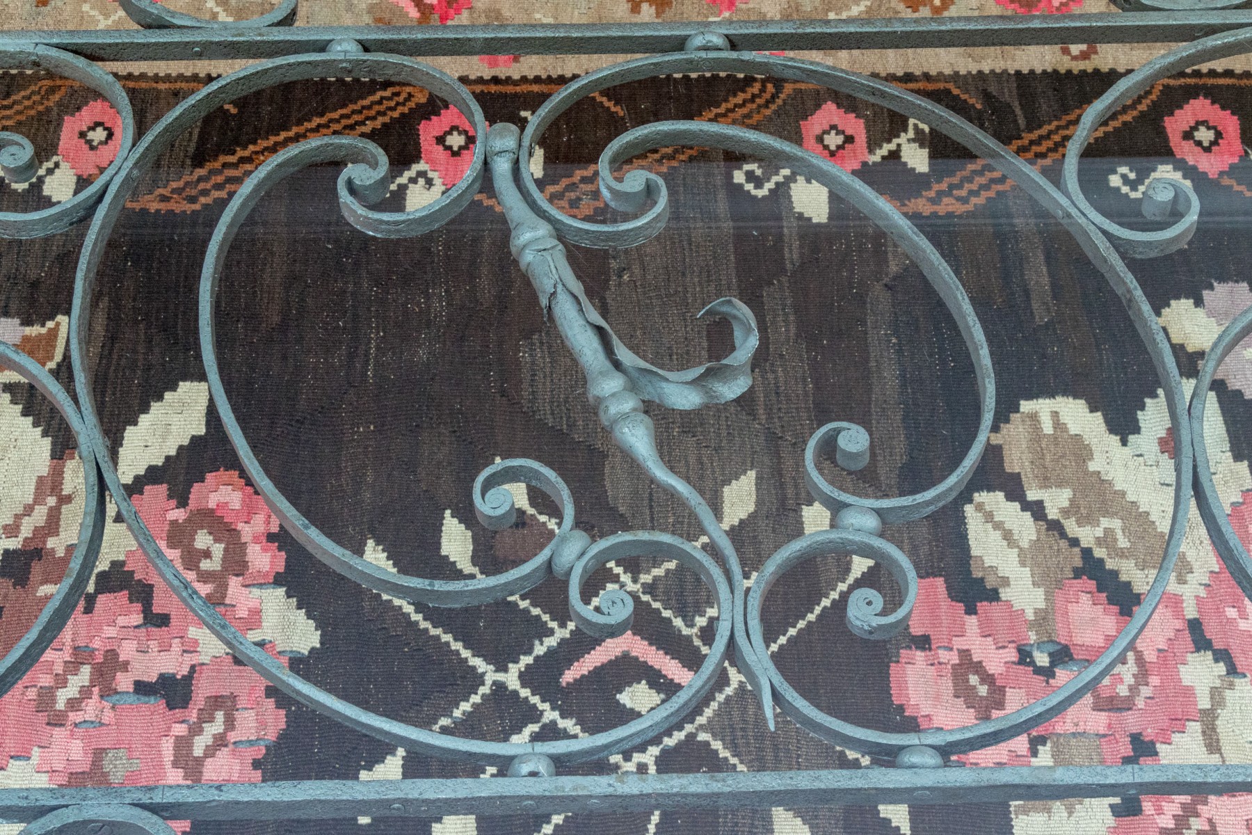 18.75" H [old fence section with scroll, and central dager, with steel legs] x 42" D [glass top] x 72" L [glass top]