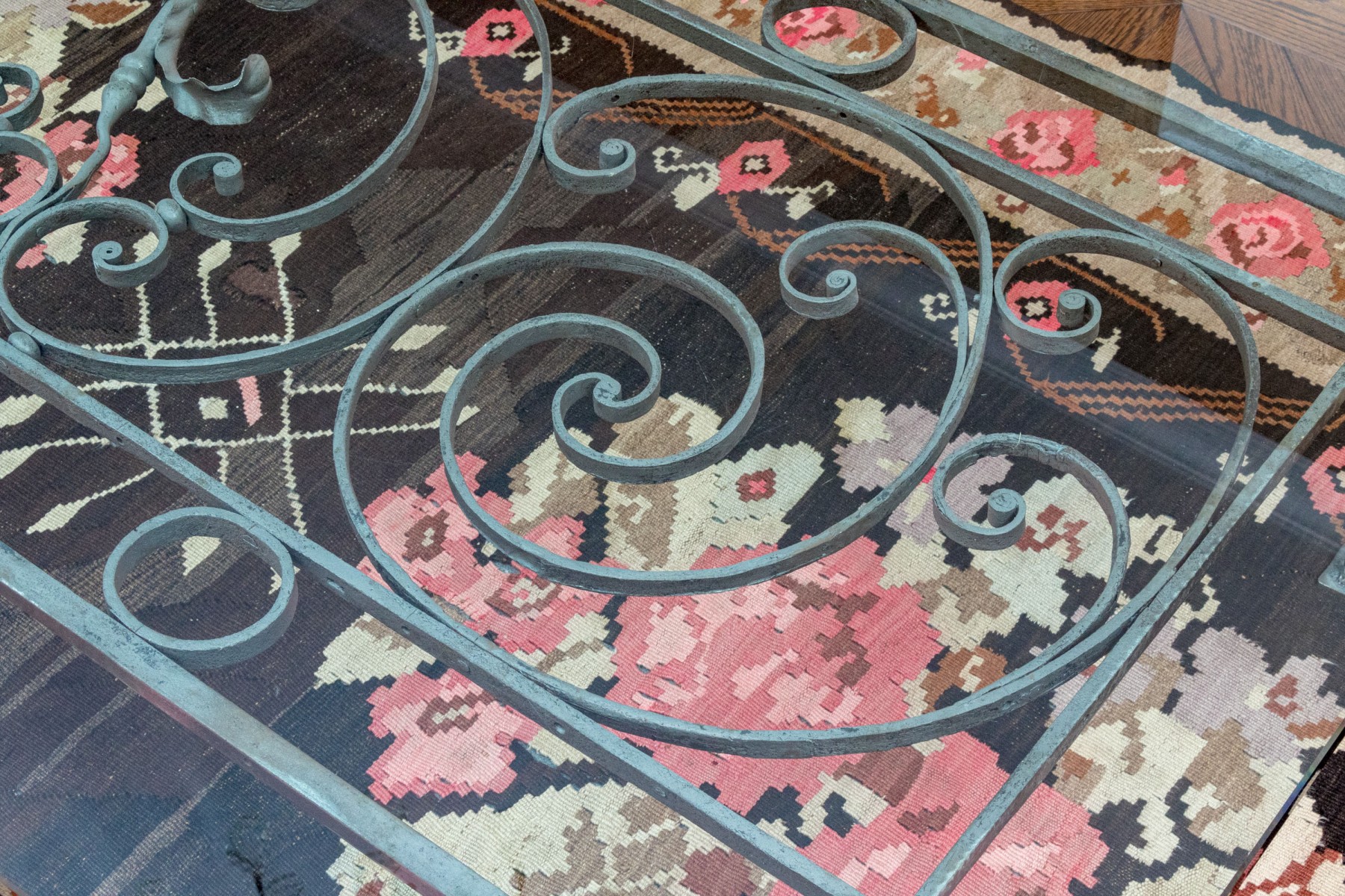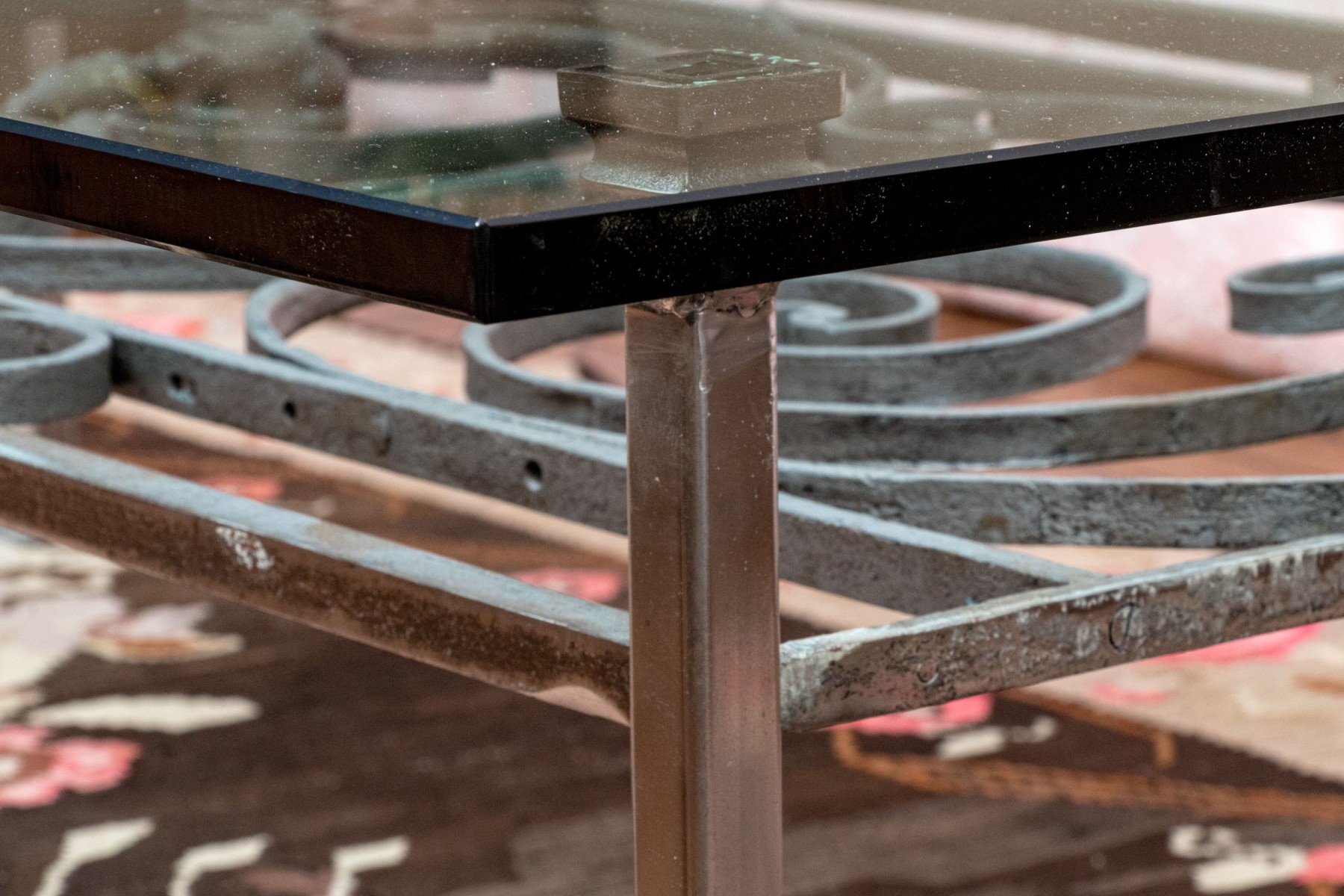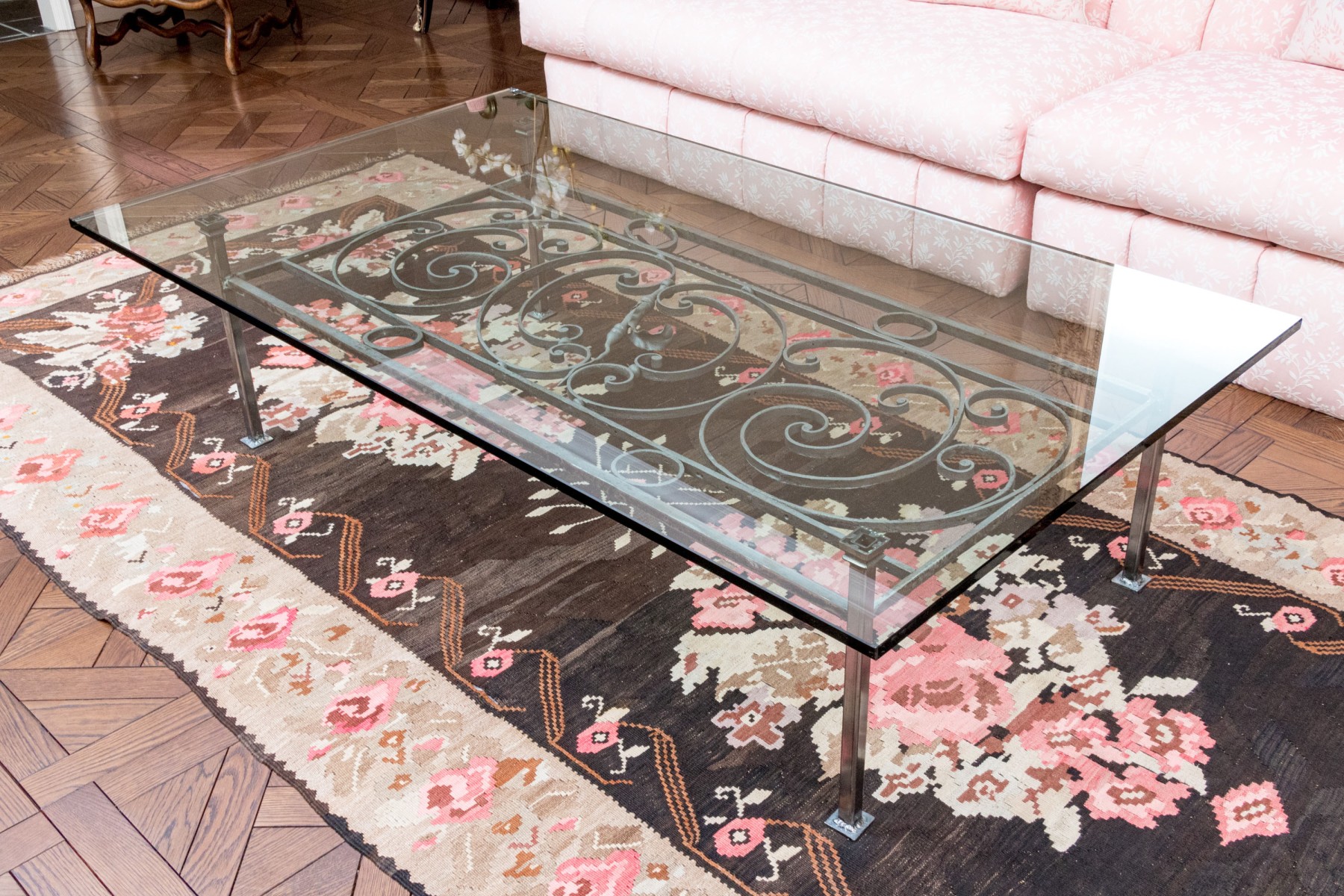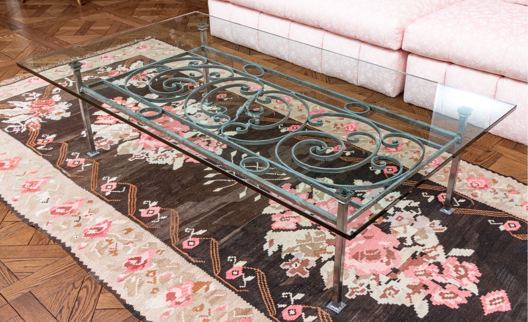 Large glass and iron cocktail table fabricated from a scrolled iron fence section, now with applied iron legs and supports, and having a thick, custom glass topper (42 x 72 x 3/4" thick). Iron stand 31.5 x 60.75 x 18"H.