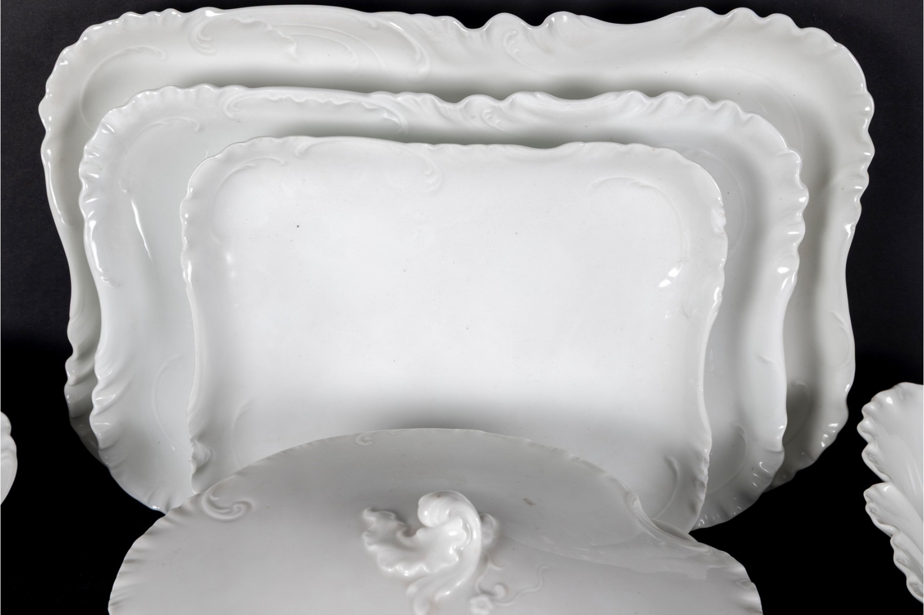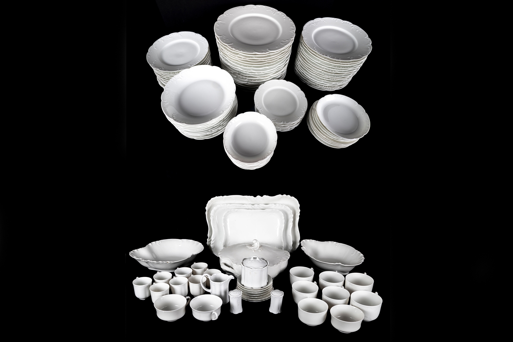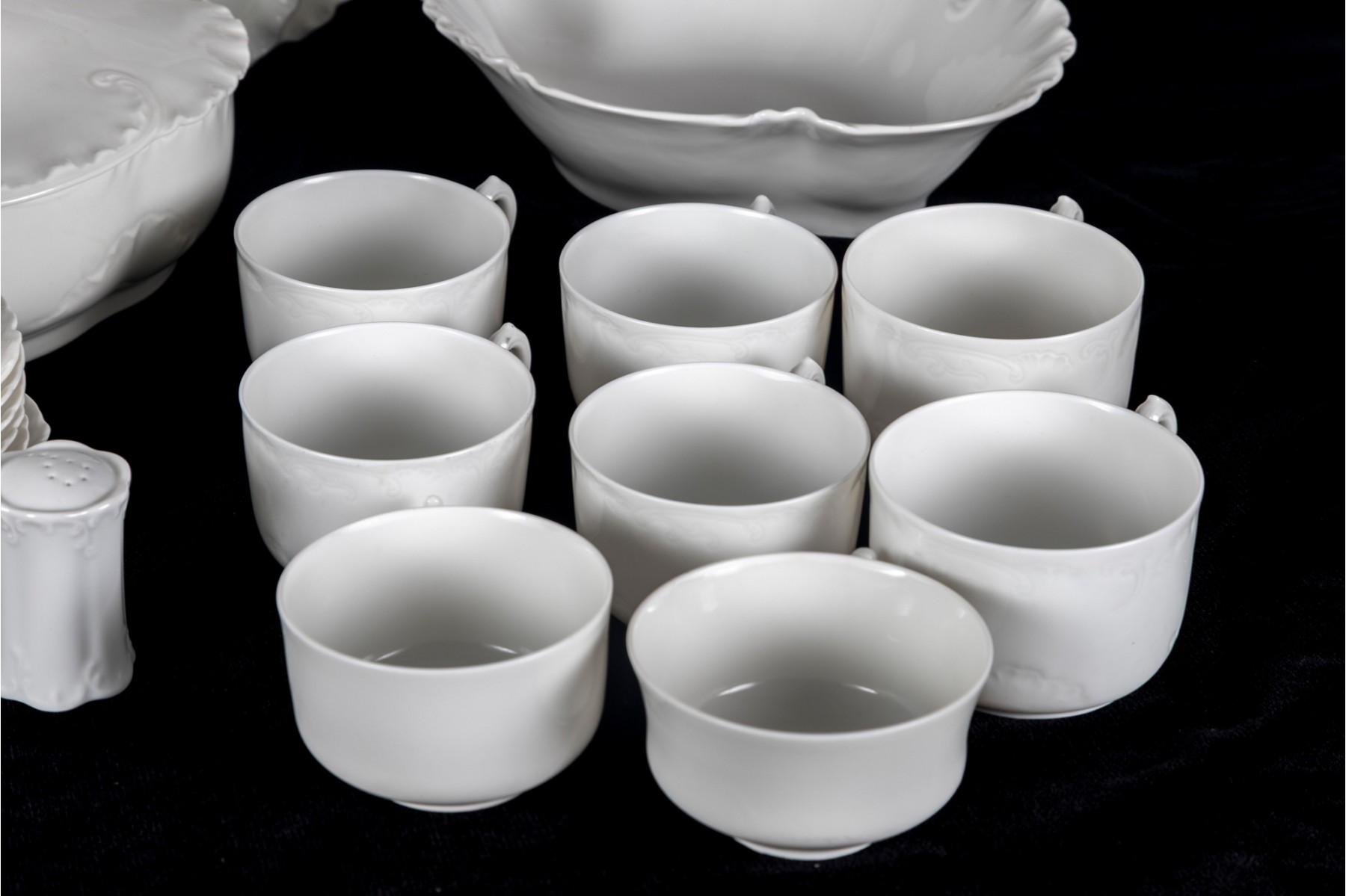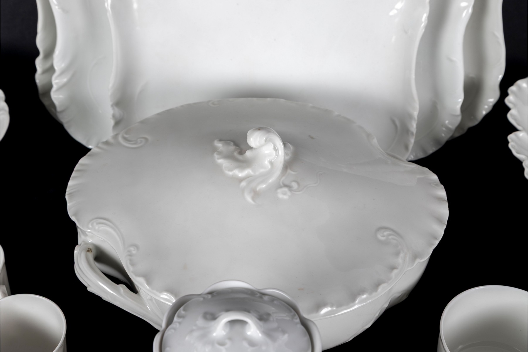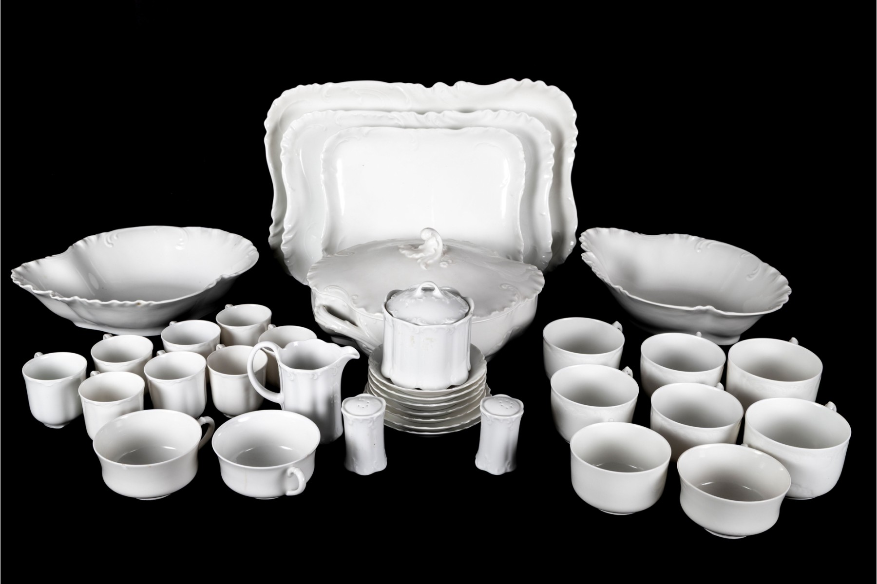 Extensive mixed set of French and German white porcelain dishes, including dinner plates, salad plates, soup bowls, serving pieces, cups, saucers, and accessories from Haviland's "Ranson" collection and others — as well as Rosenthal's "Classic Rose".