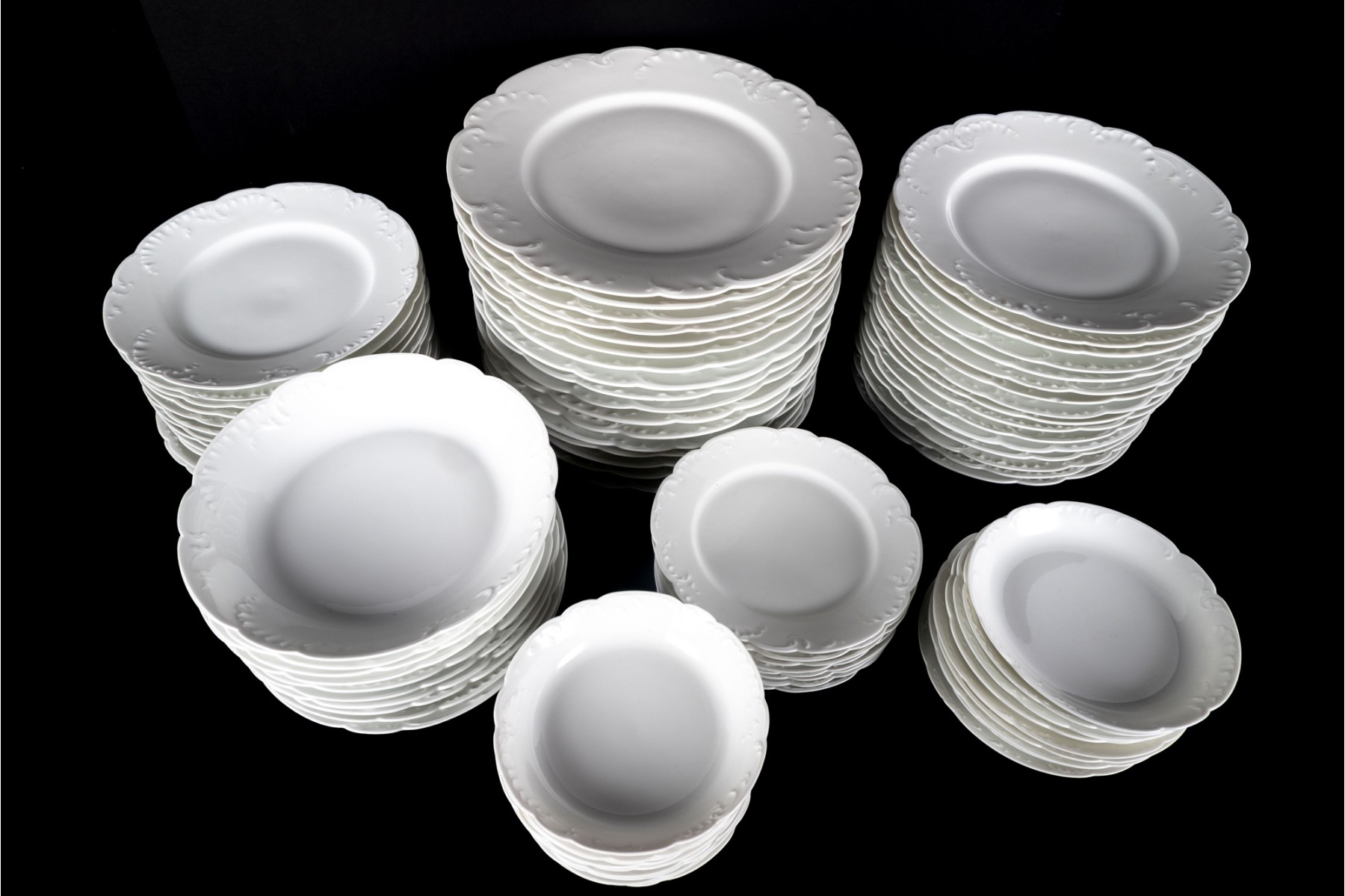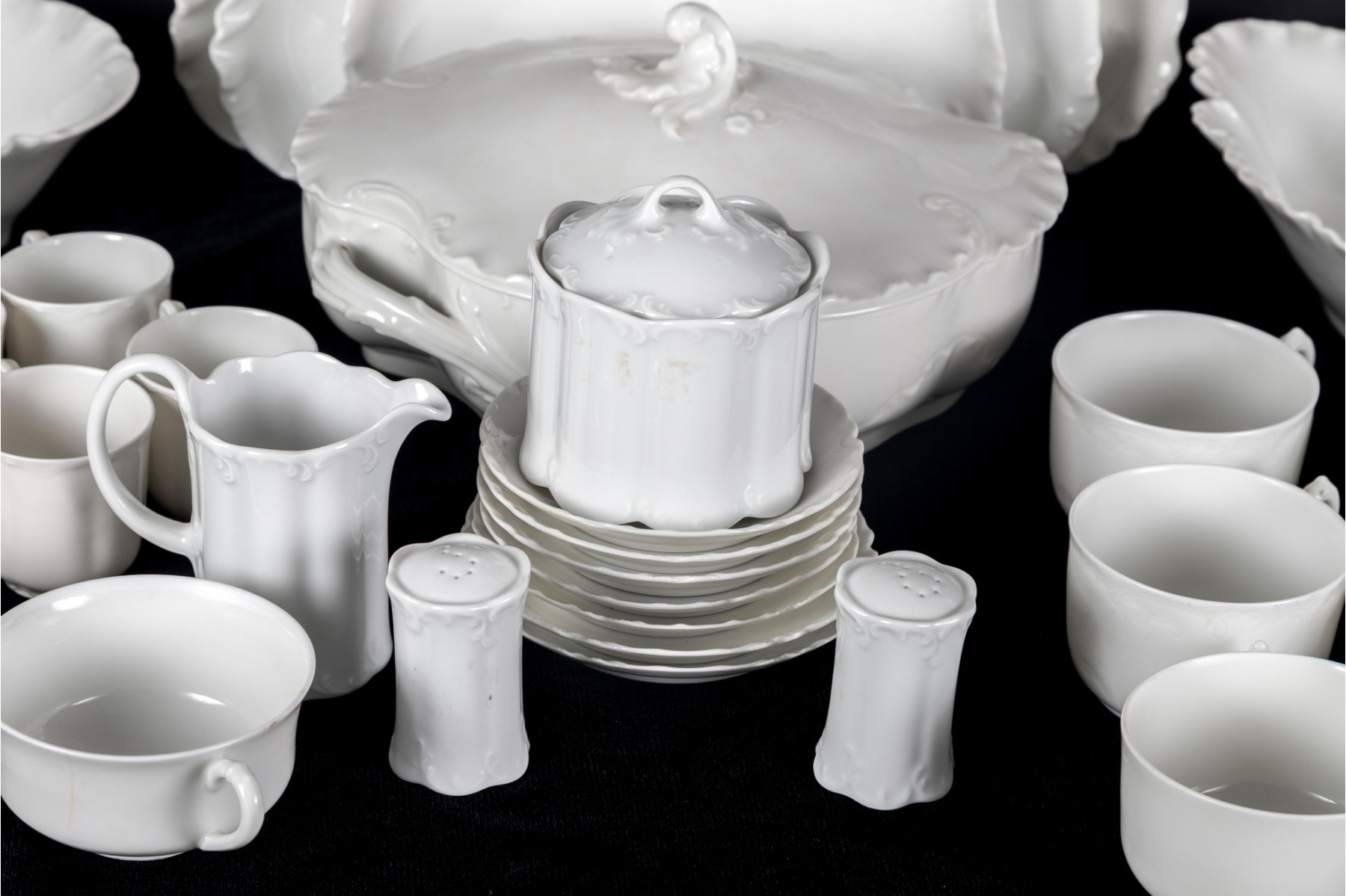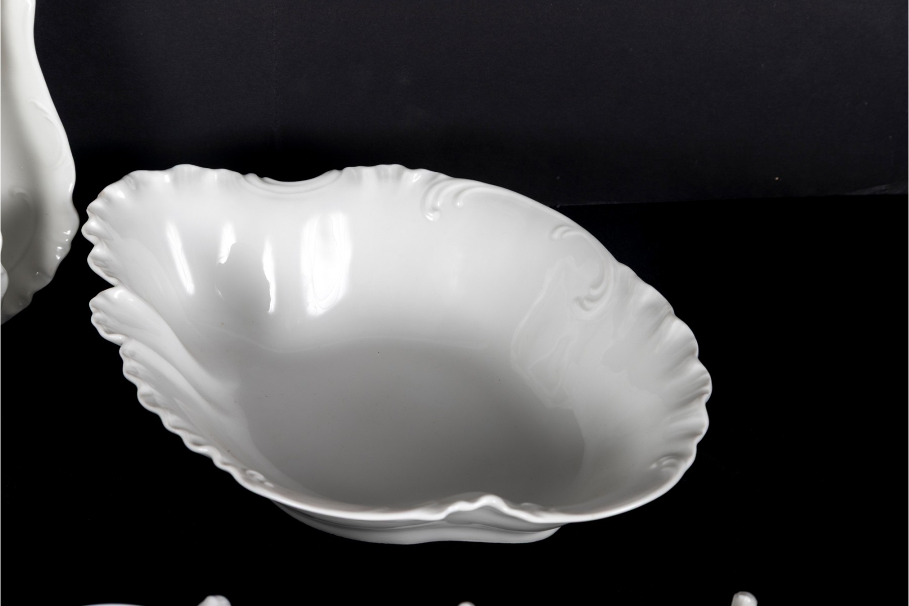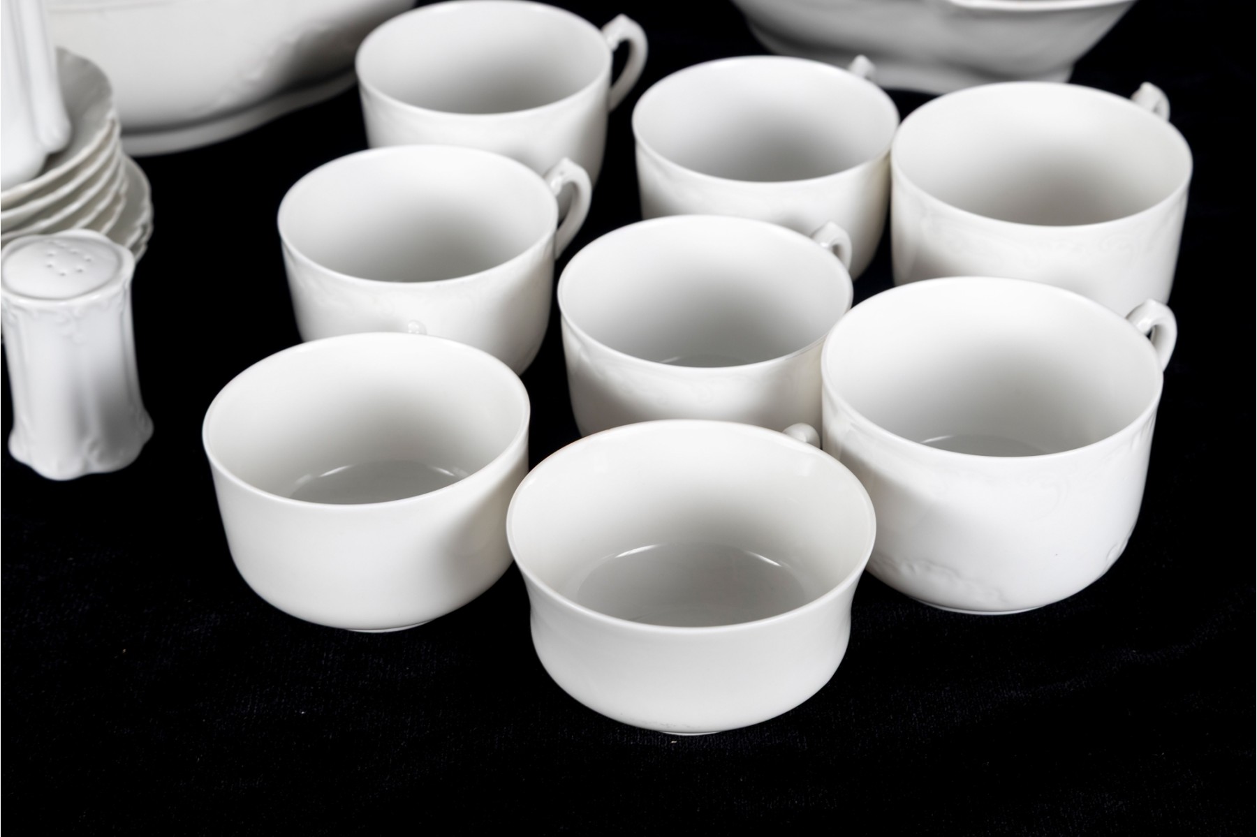 Extensive mixed set of French and German white porcelain dishes, including dinner plates, salad plates, soup bowls, serving pieces, cups, saucers, and accessories from Haviland's "Ranson" collection and others — as well as Rosenthal's "Classic Rose".