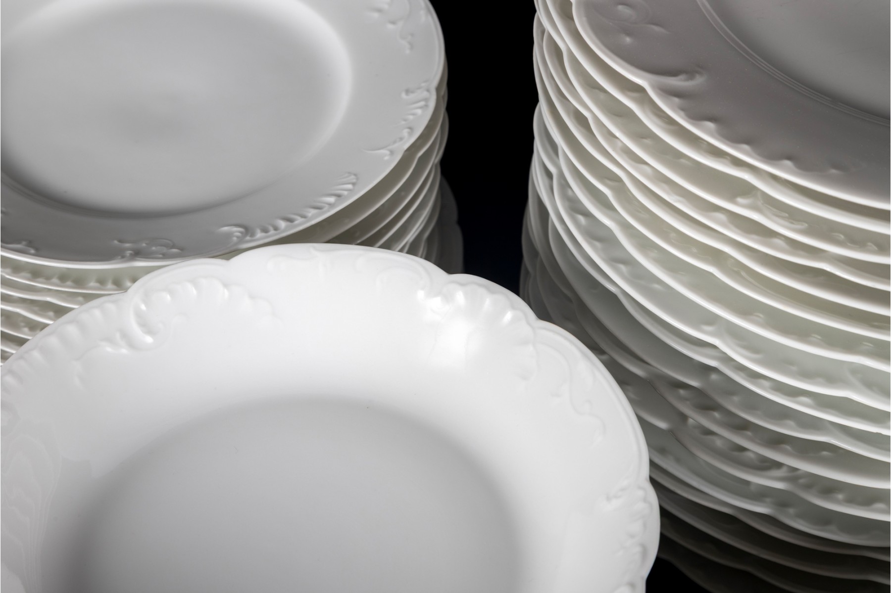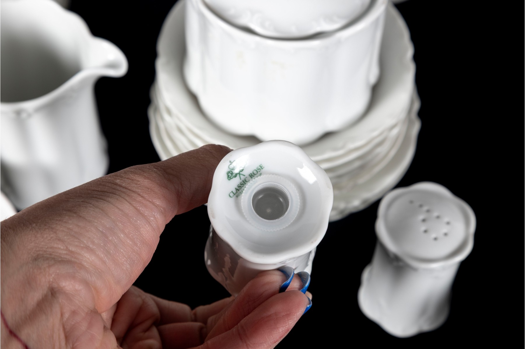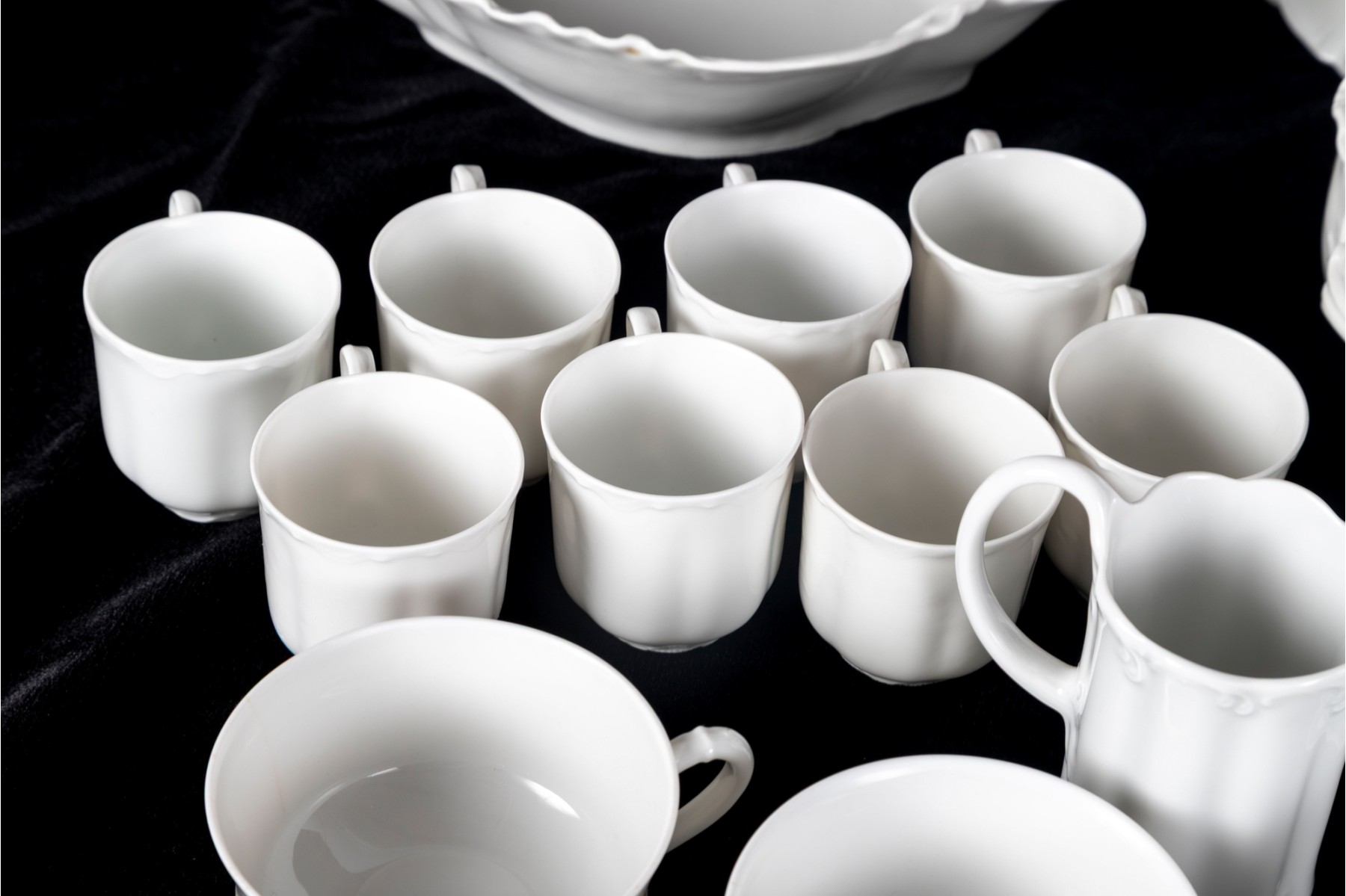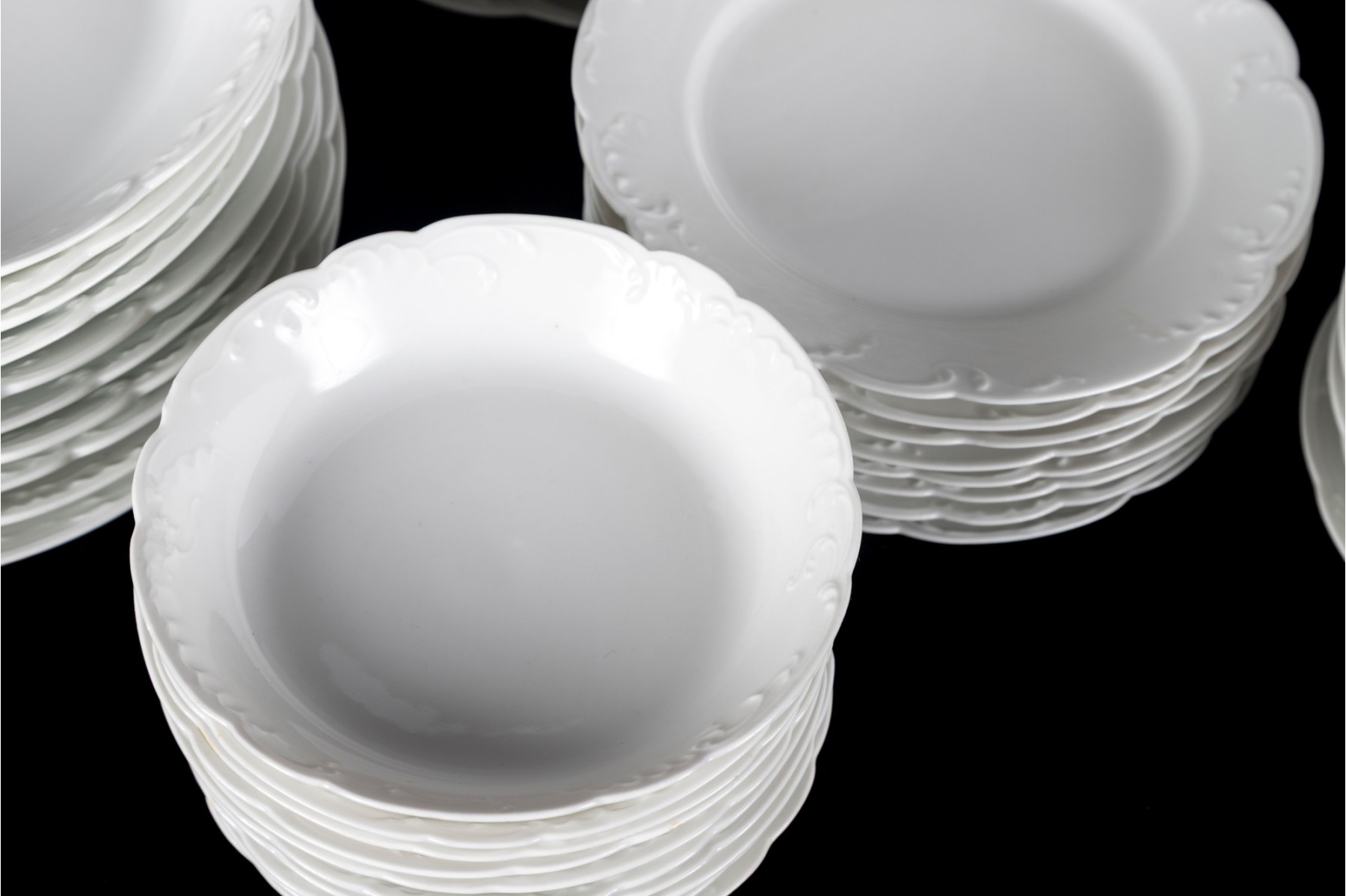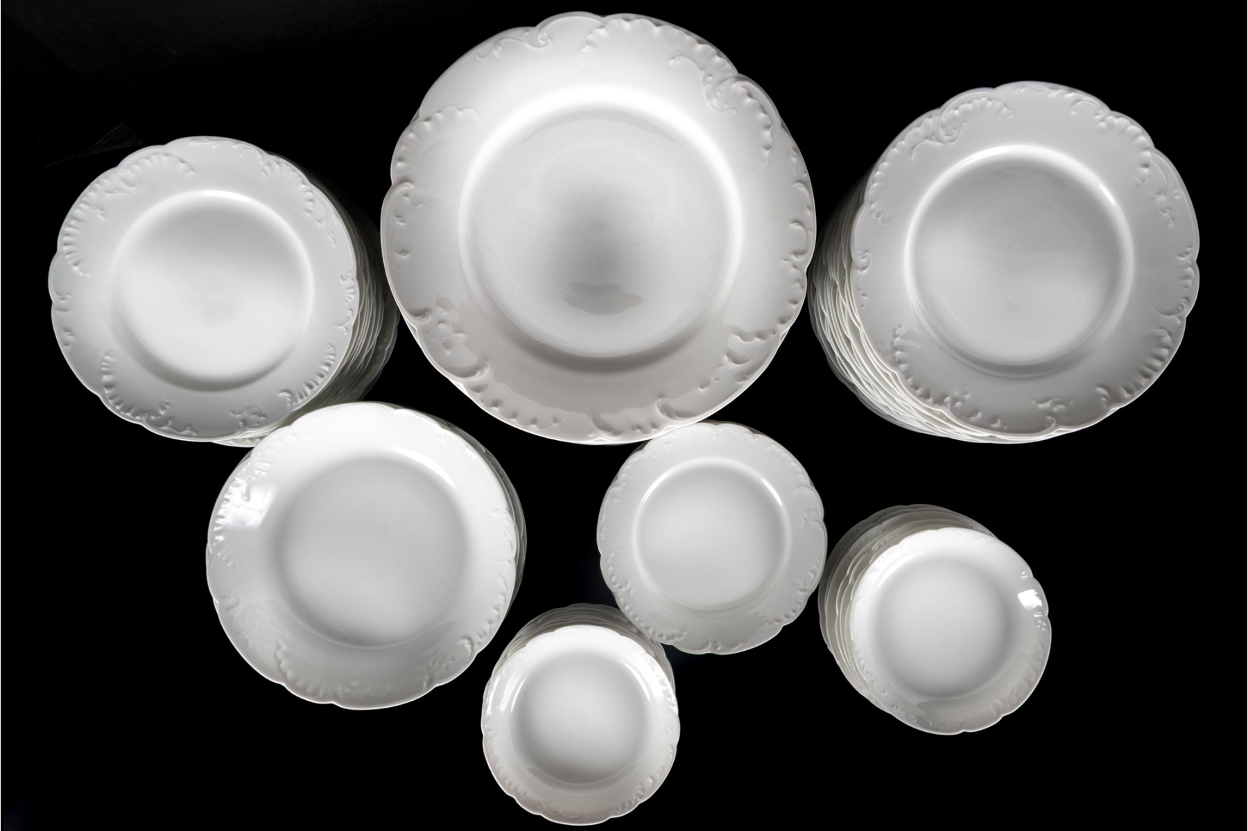 Extensive mixed set of French and German white porcelain dishes, including dinner plates, salad plates, soup bowls, serving pieces, cups, saucers, and accessories from Haviland's "Ranson" collection and others — as well as Rosenthal's "Classic Rose".