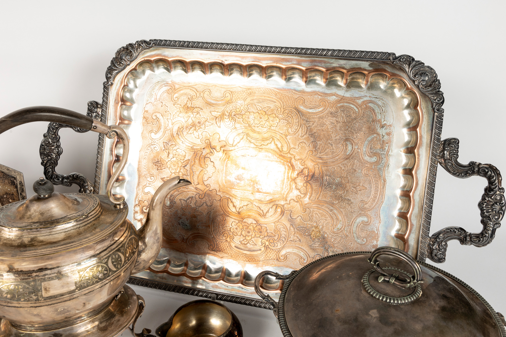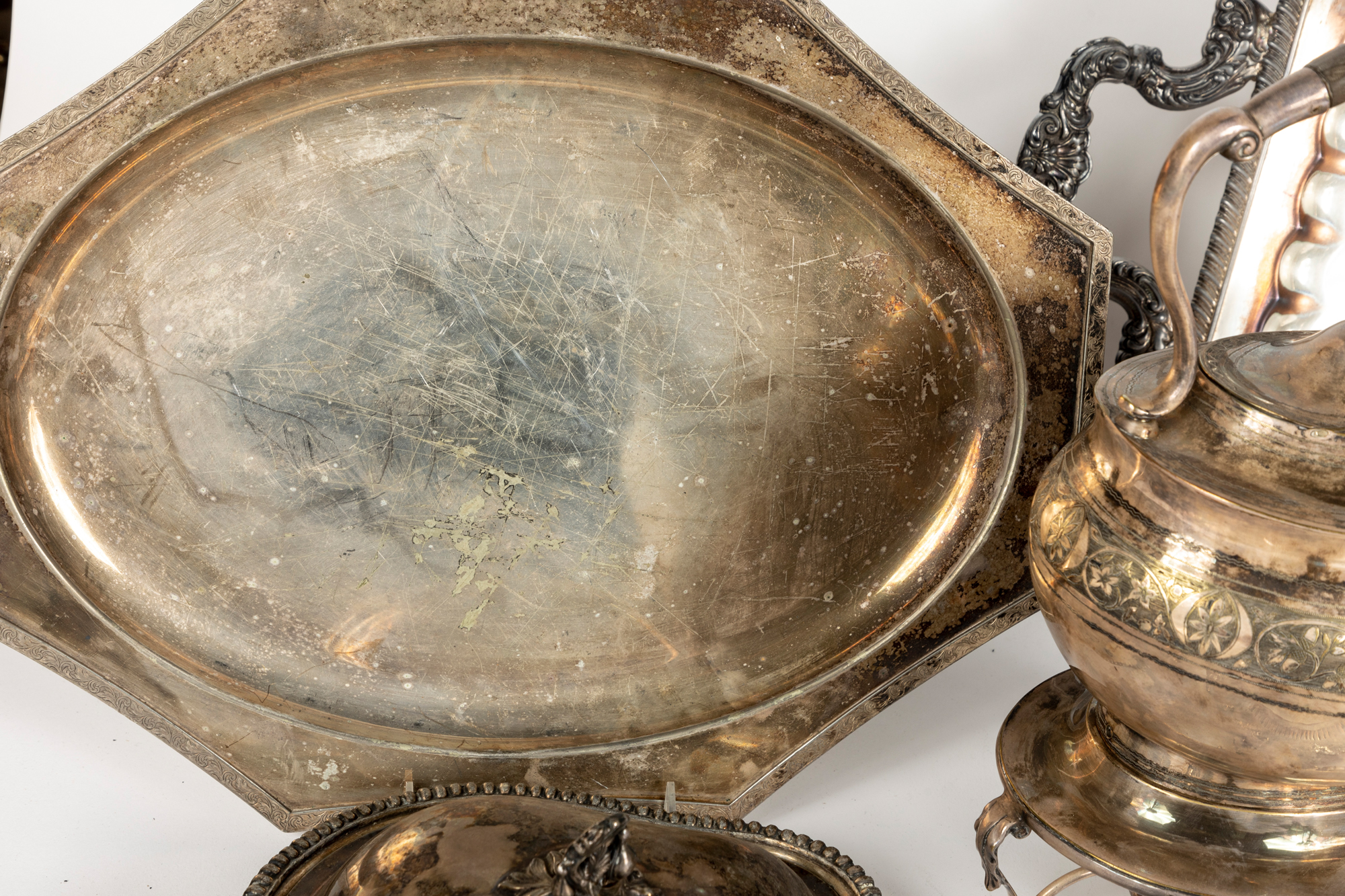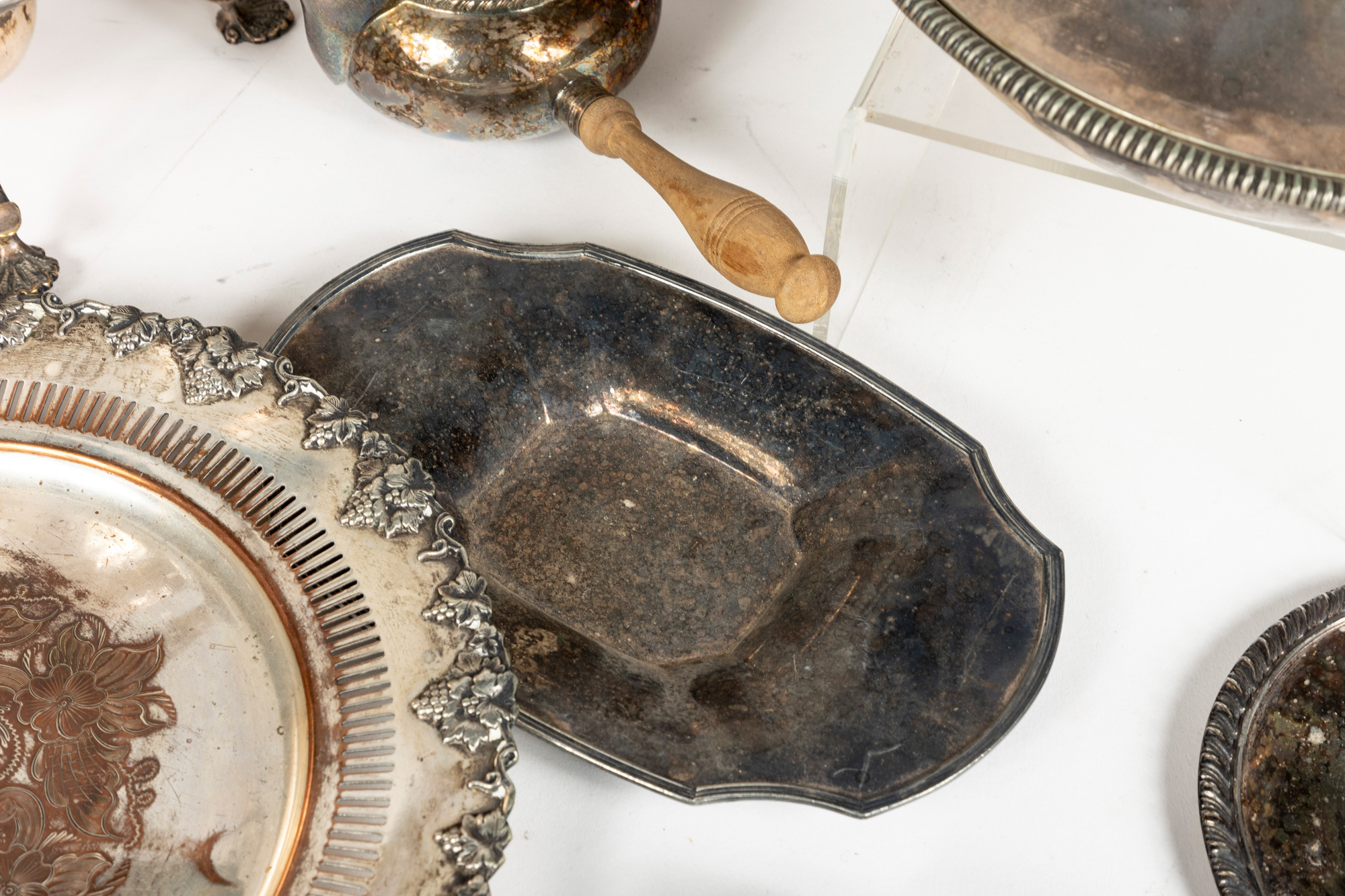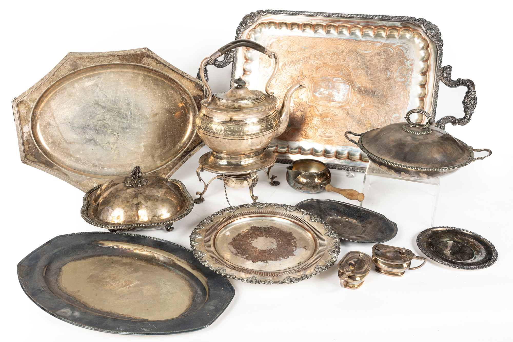 A large collection of vintage silver plate items. All pieces may display signs of wear with scratching, denting or missing pieces. Items can use a polish/cleaning. Largest item (rectangular handled tray) measures- 25"L x 14 1/2"W including length of handles.