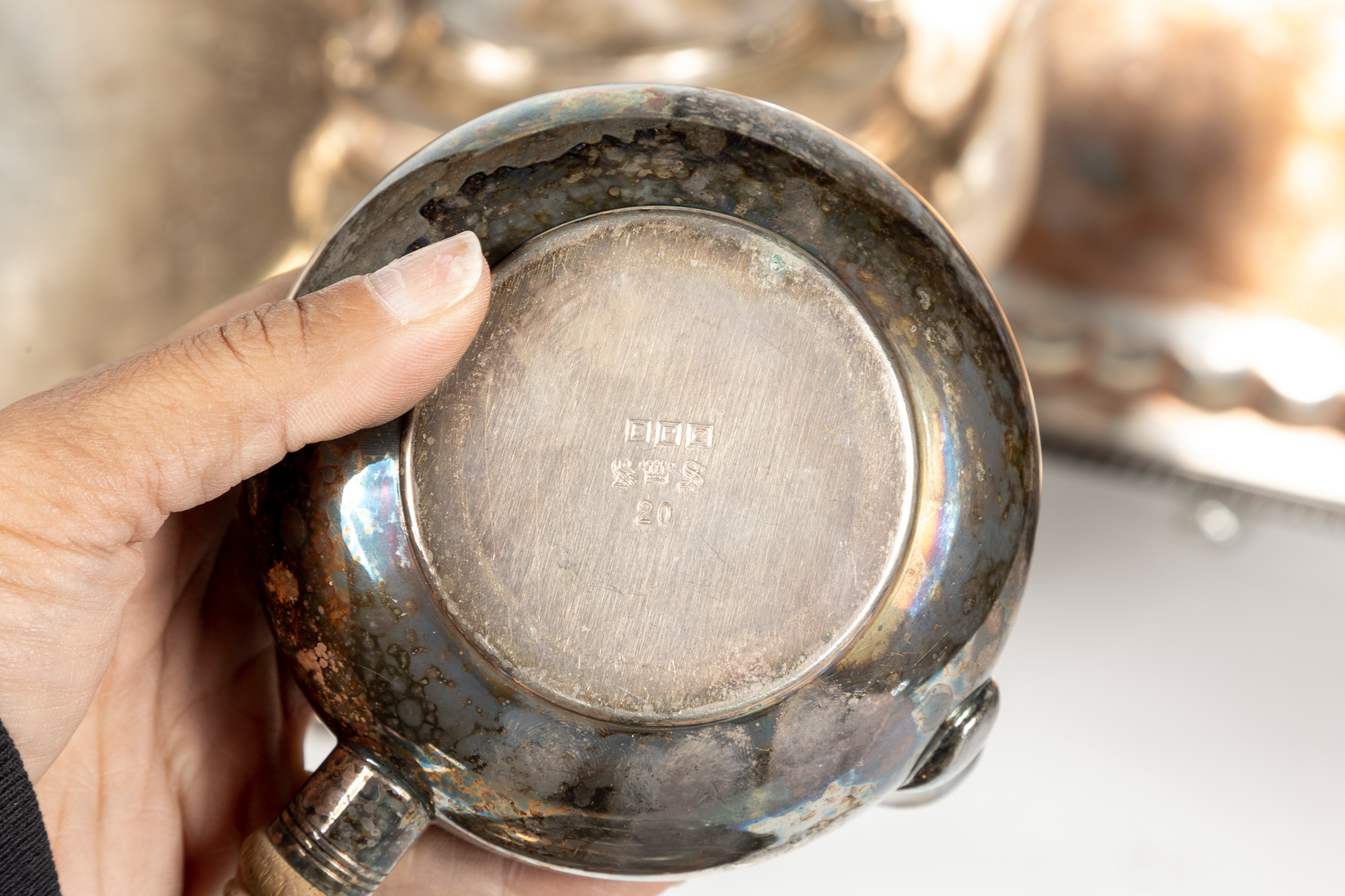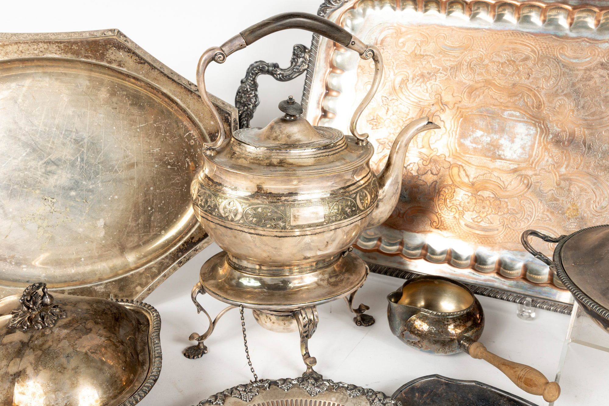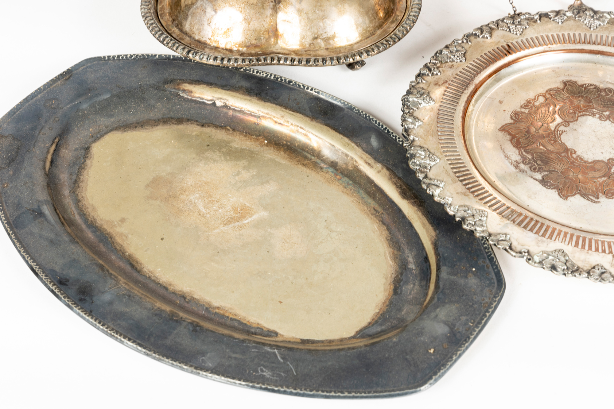 A large collection of vintage silver plate items. All pieces may display signs of wear with scratching, denting or missing pieces. Items can use a polish/cleaning. Largest item (rectangular handled tray) measures- 25"L x 14 1/2"W including length of handles.