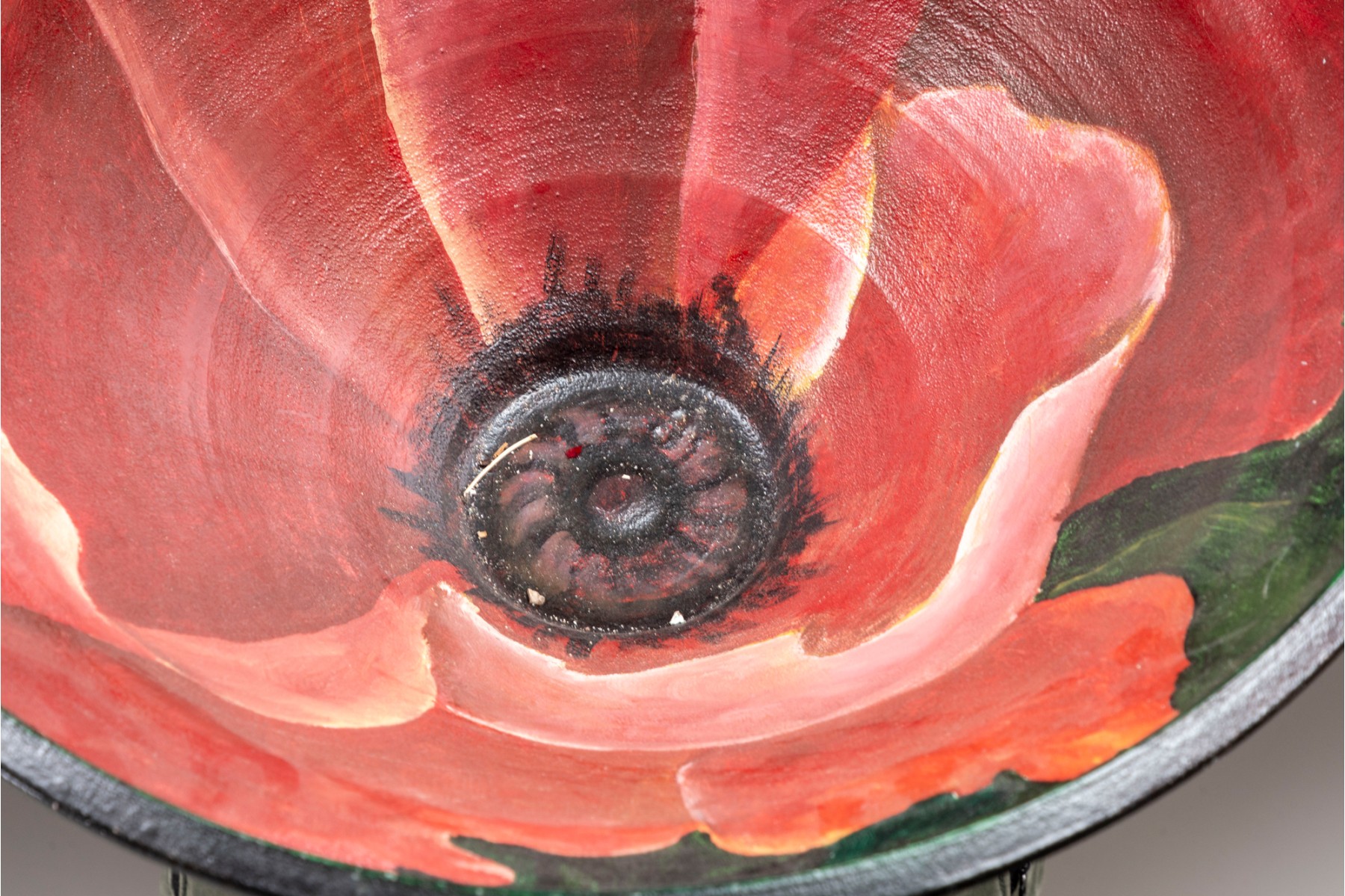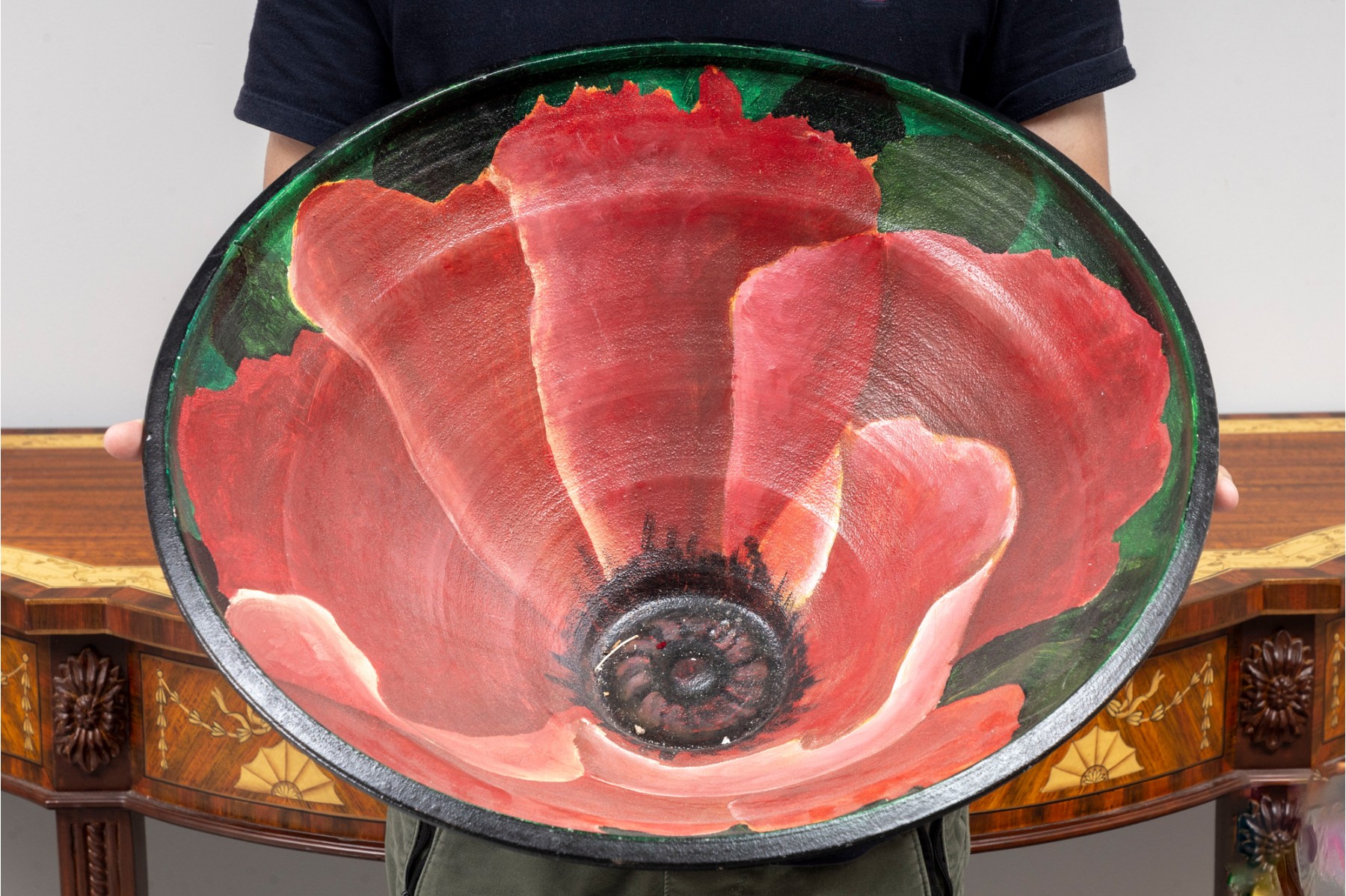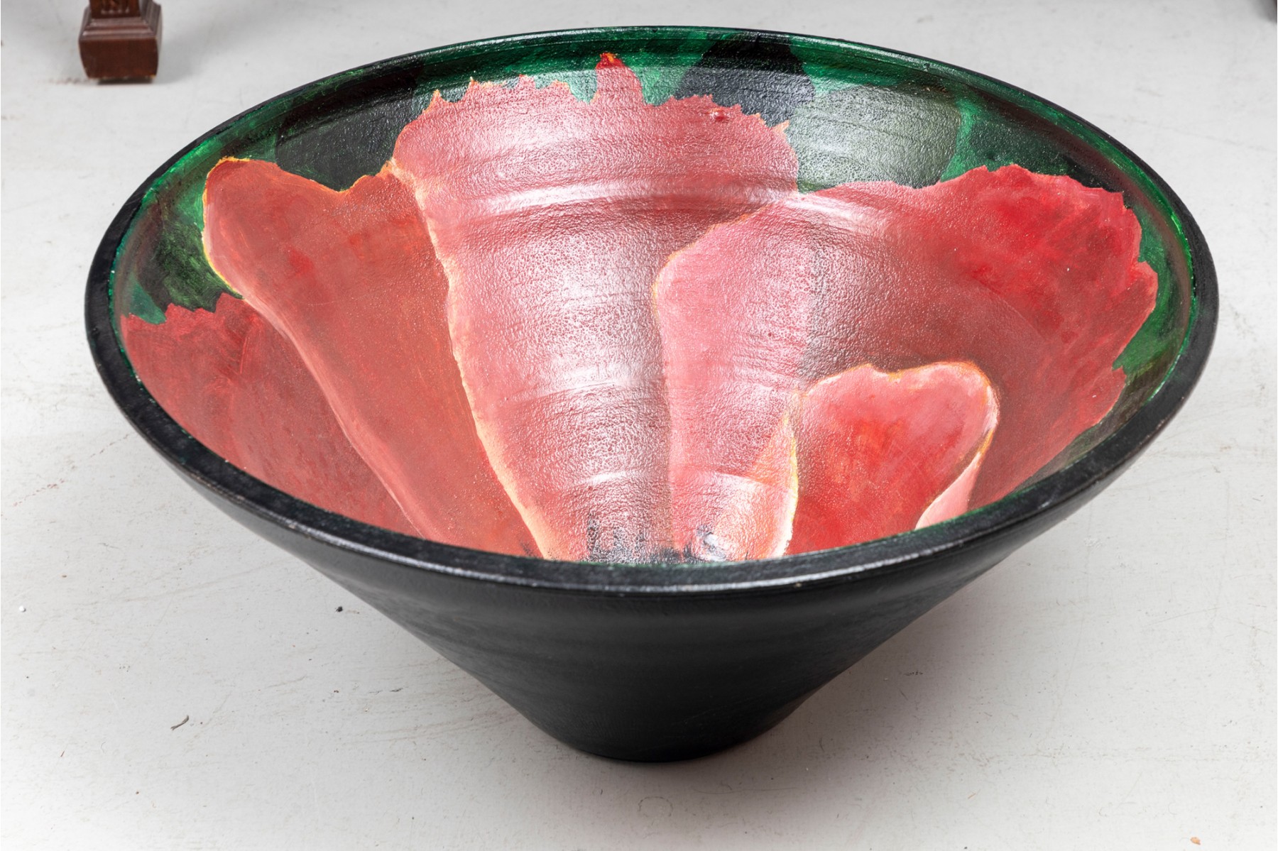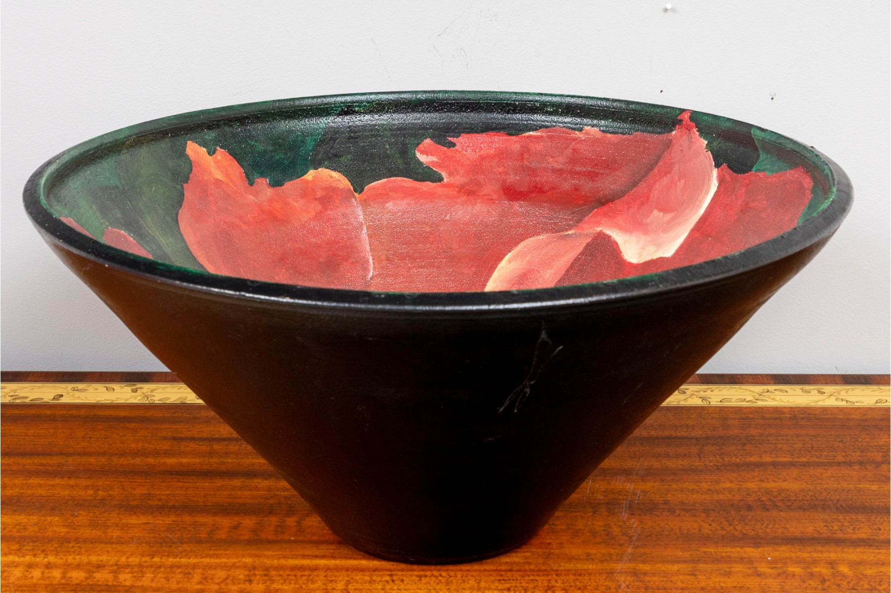A large, hand-painted ceramic peony flower centerpiece bowl with a black exterior, perfect for decoration.