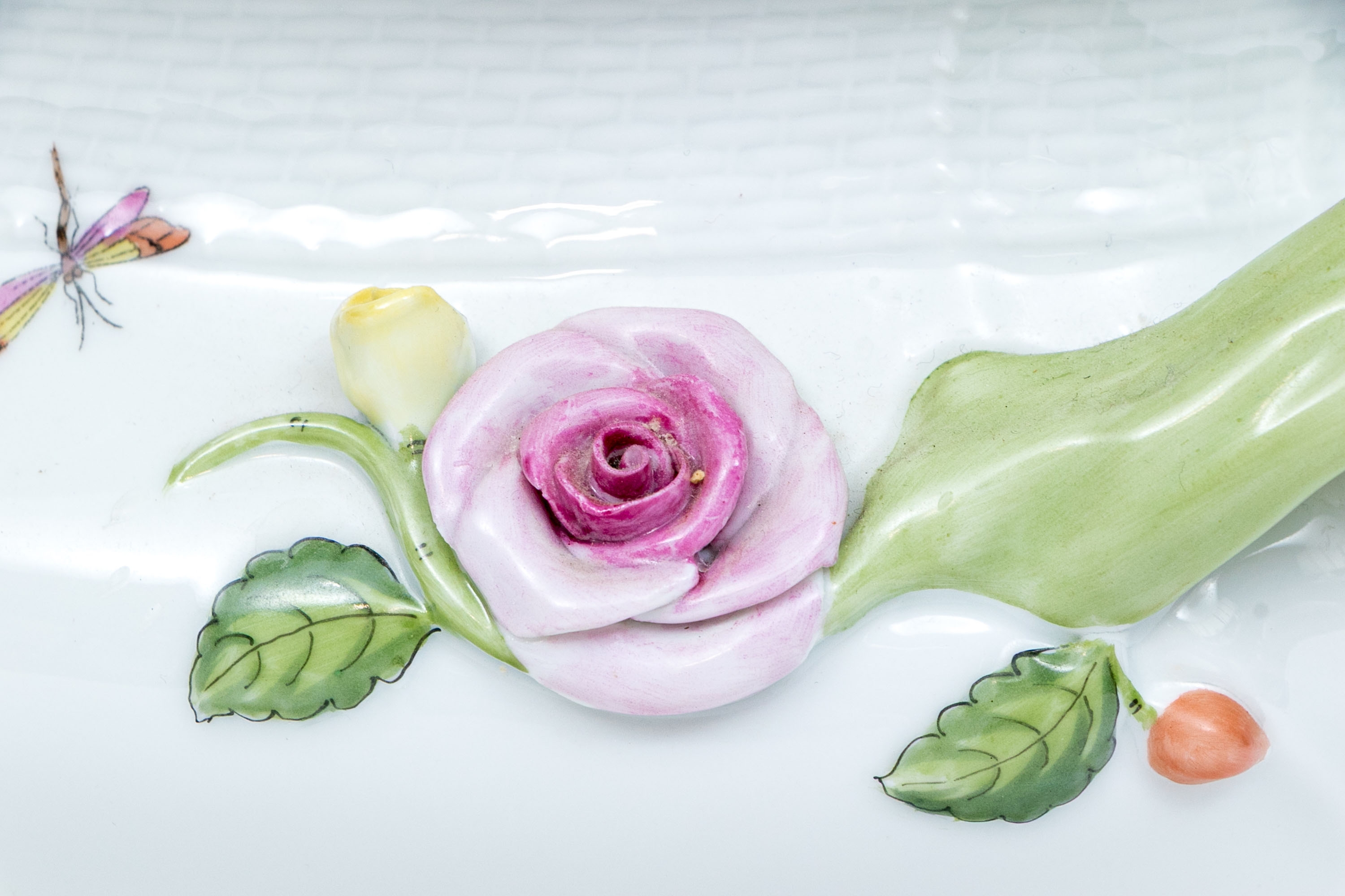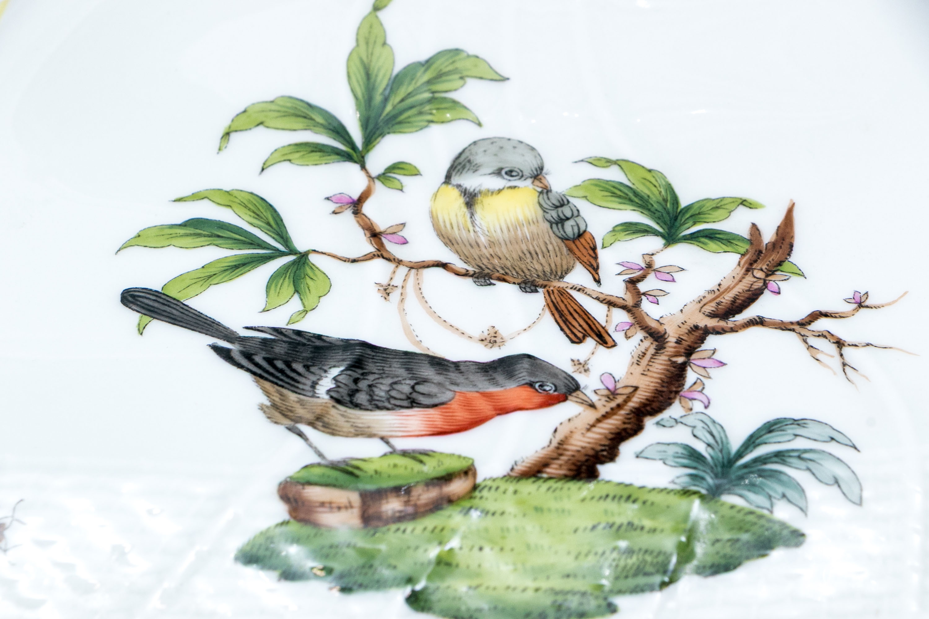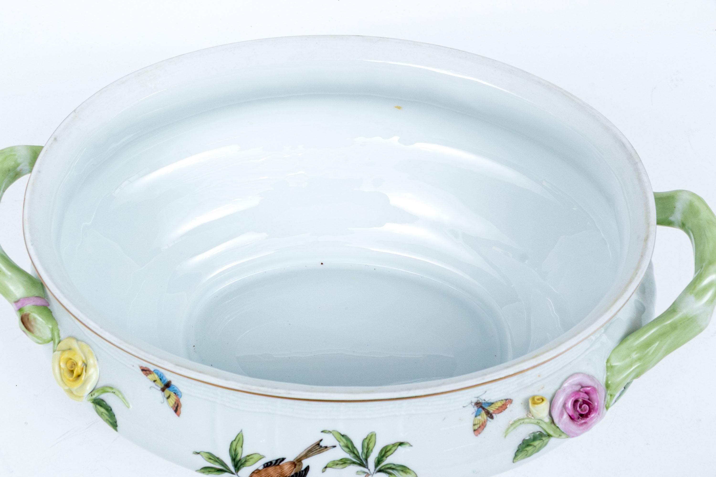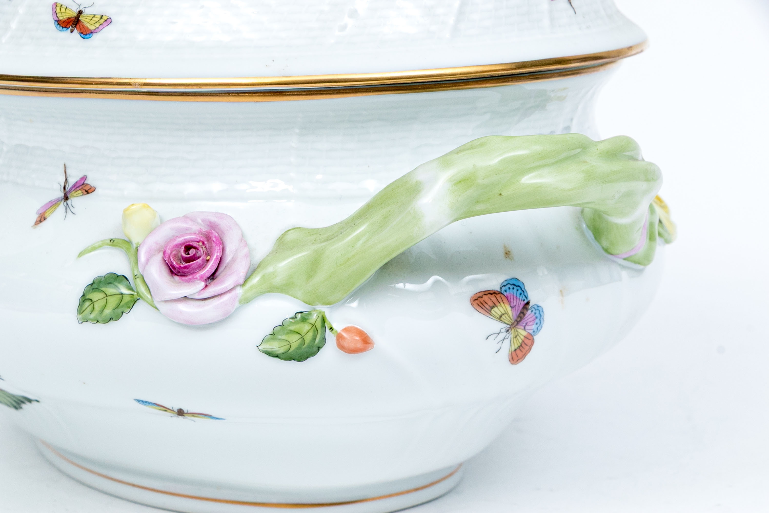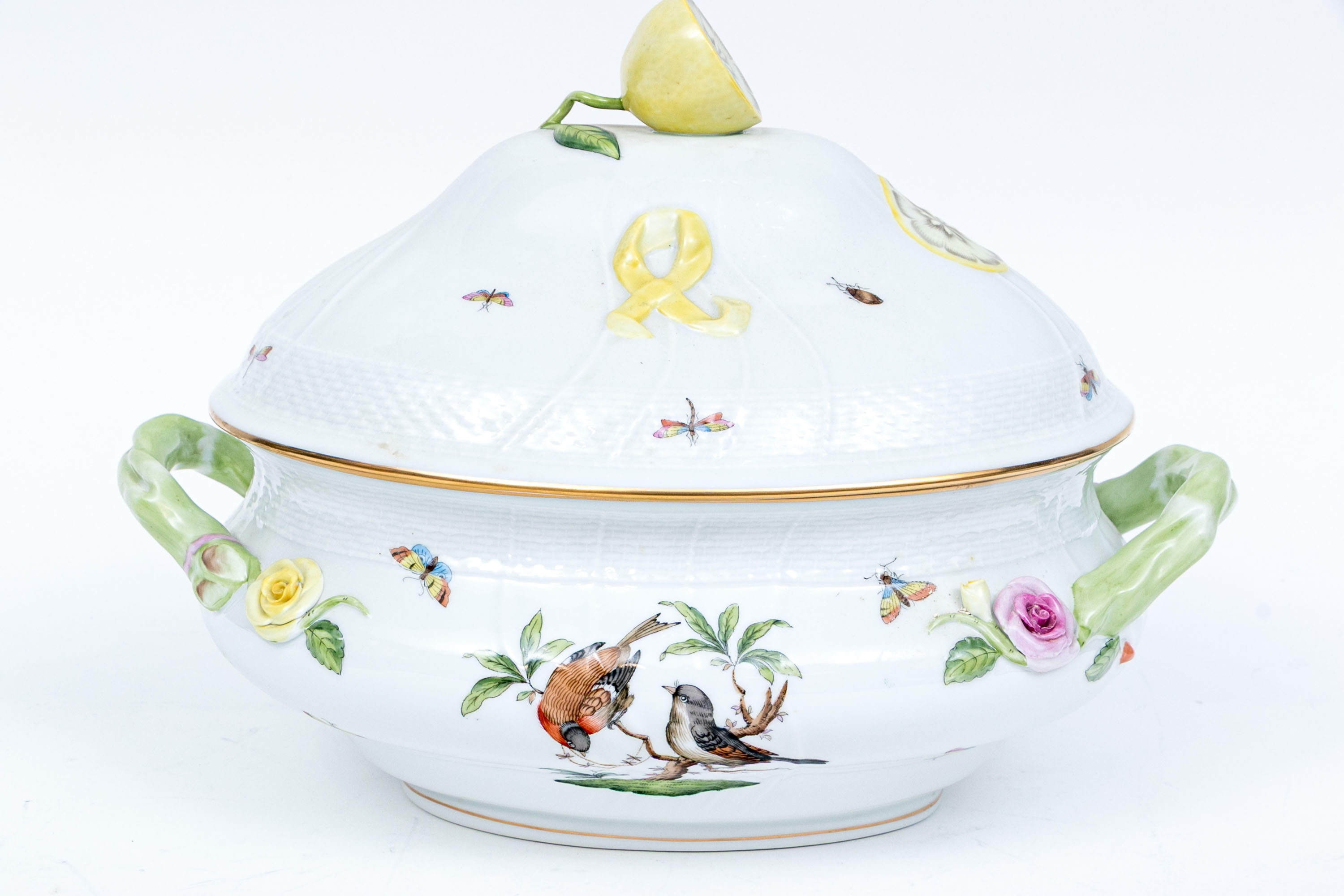 Herend porcelain tureen features a gently lobed body and domed lid, hand-painted with the Rothschild Bird (RO) motif—pairs of vividly detailed birds perched upon flowering branches with necklace, encircled by playful butterflies and insects. The painting is done in rich, naturalistic tones of rust, green, and yellow, accented with delicate shading and fine gilt borders. The tureen’s applied handles are modeled as curling green branches entwined with hand-sculpted pink and yellow roses, while the lemon finial lid adds a playful, lifelike touch. The interior is smooth and glossy, suitable for serving or display. The form rests elegantly balanced on its footed base, the design enhanced by Herend’s signature basketweave relief pattern along the upper body. Underside bears the Herend blue shield mark reading HEREND HUNGARY HANDPAINTED, along with the impressed and painted pattern and form numbers 1002/RO
