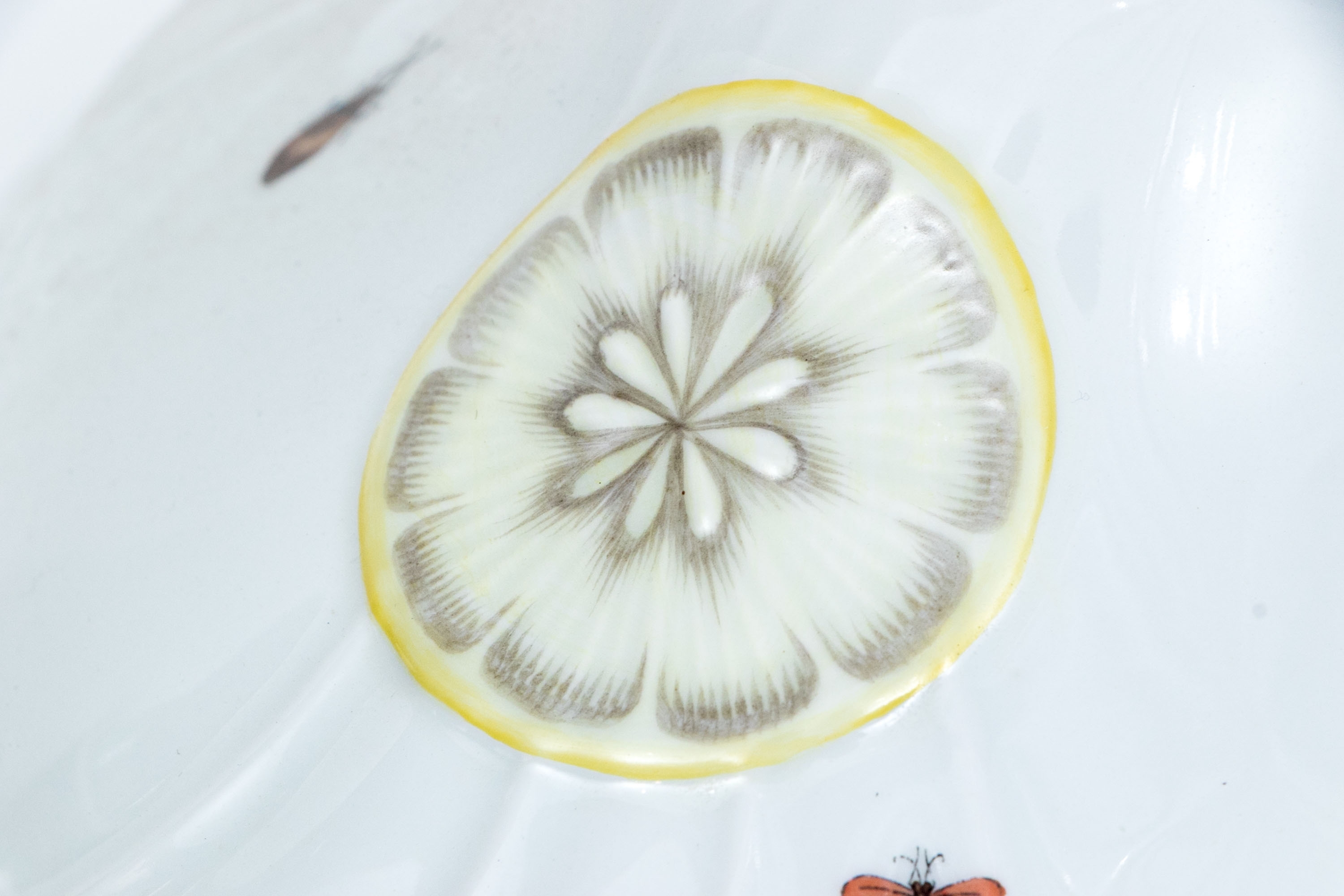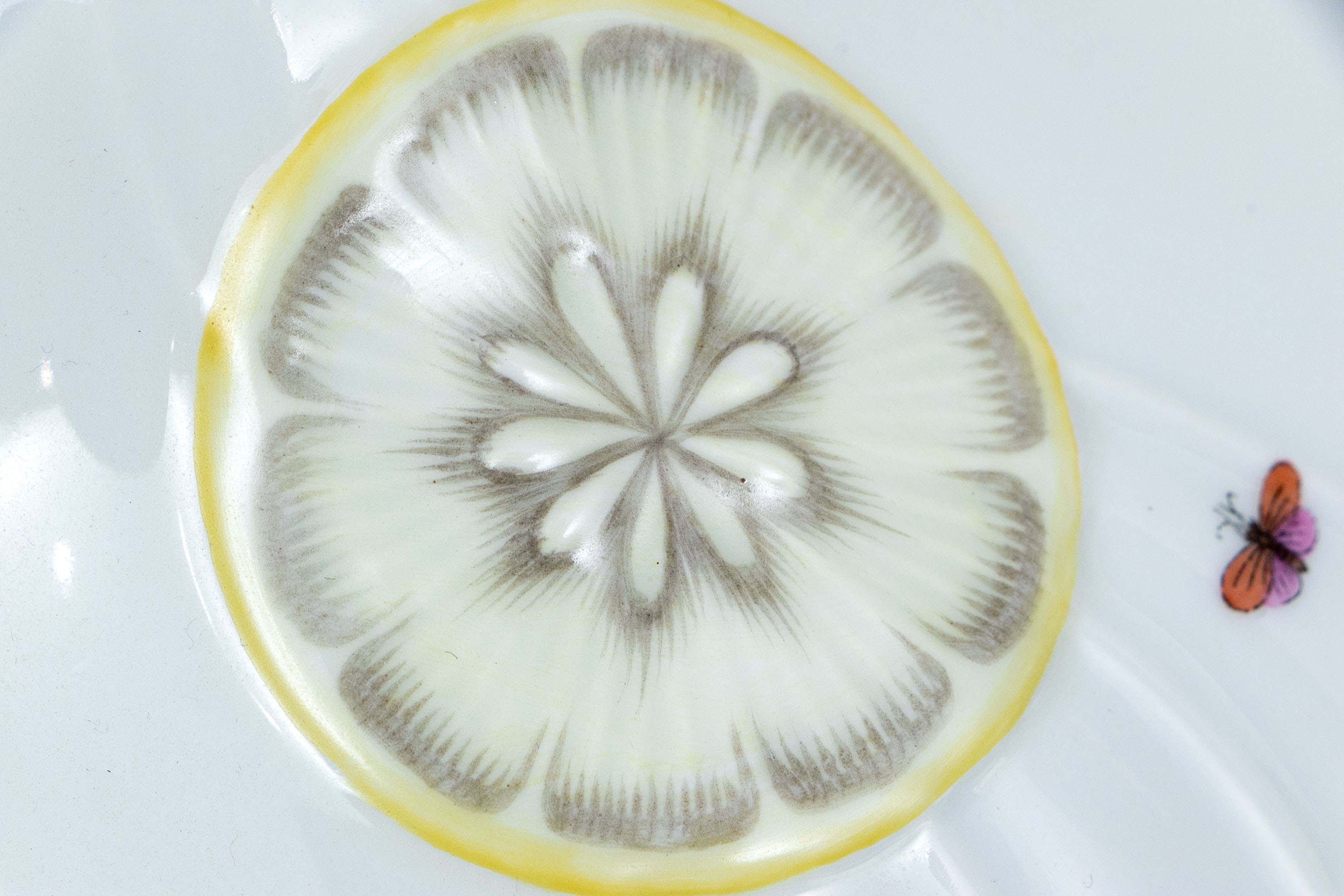 Condition: Excellent overall condition. The porcelain is clean and free of cracks, chips, or restorations. The paintwork is crisp and vibrant, with no fading or discoloration. The applied flowers and lemon finial are fully intact.. The gilded edging is bright and continuous, with only minimal, expected wear from handling. Could use a gently cleaning - a few spots.
