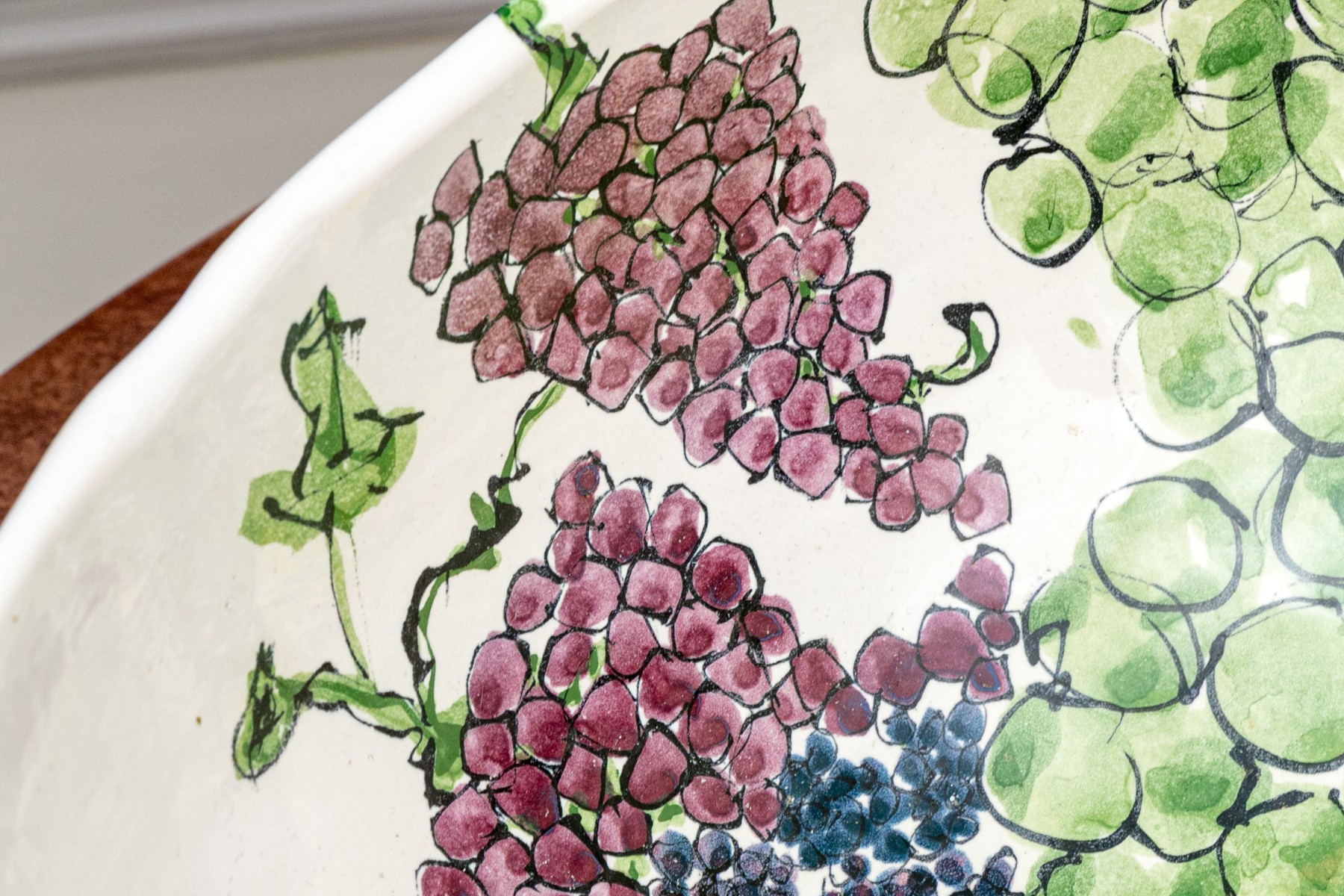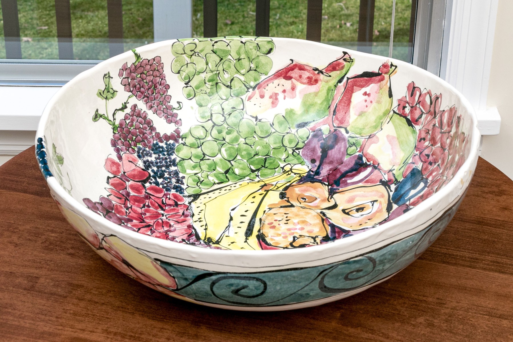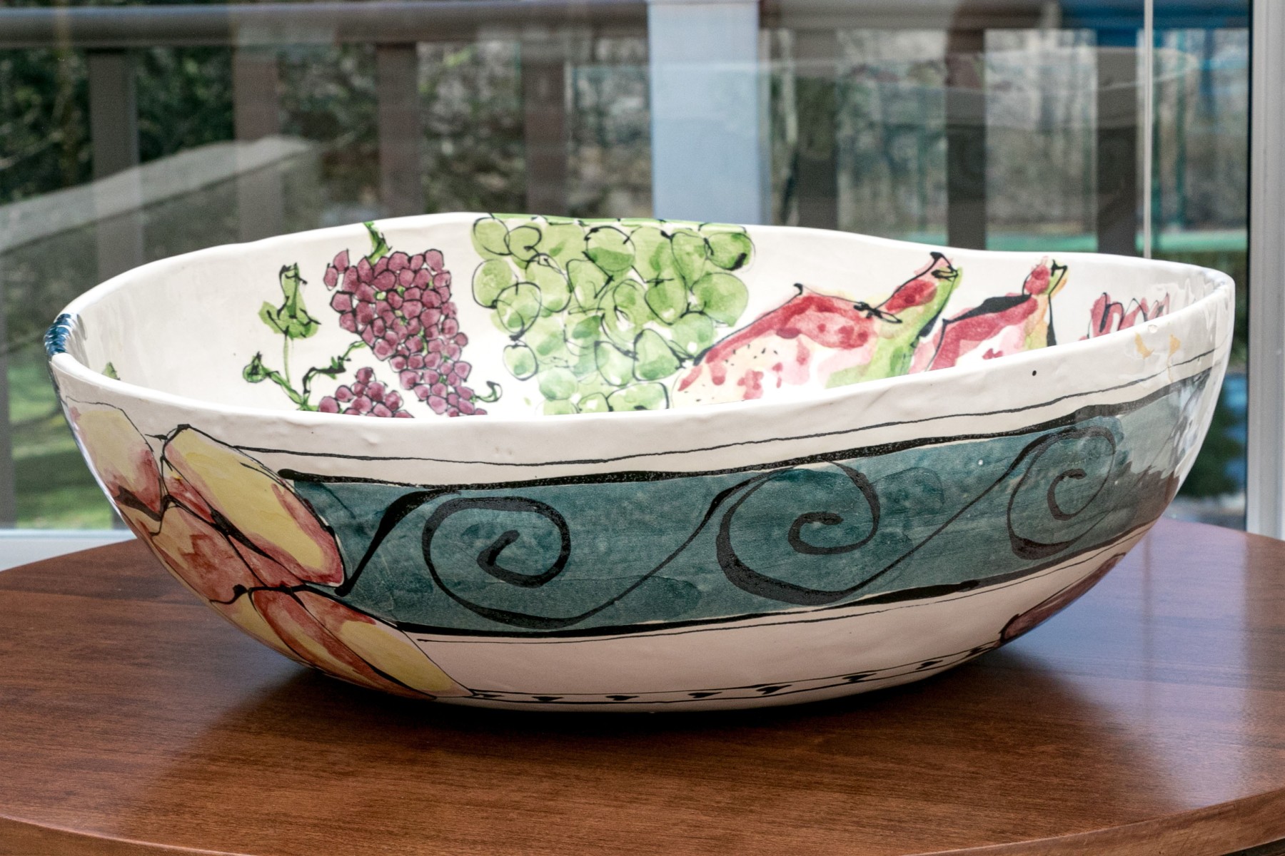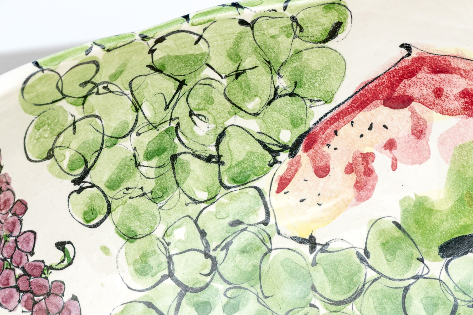 A beautiful fruit bowl with hand painted fruit decorations. Signed Hancock and dated 1997 underfoot. A great and large bowl perfect for displaying fruit or display on its on!