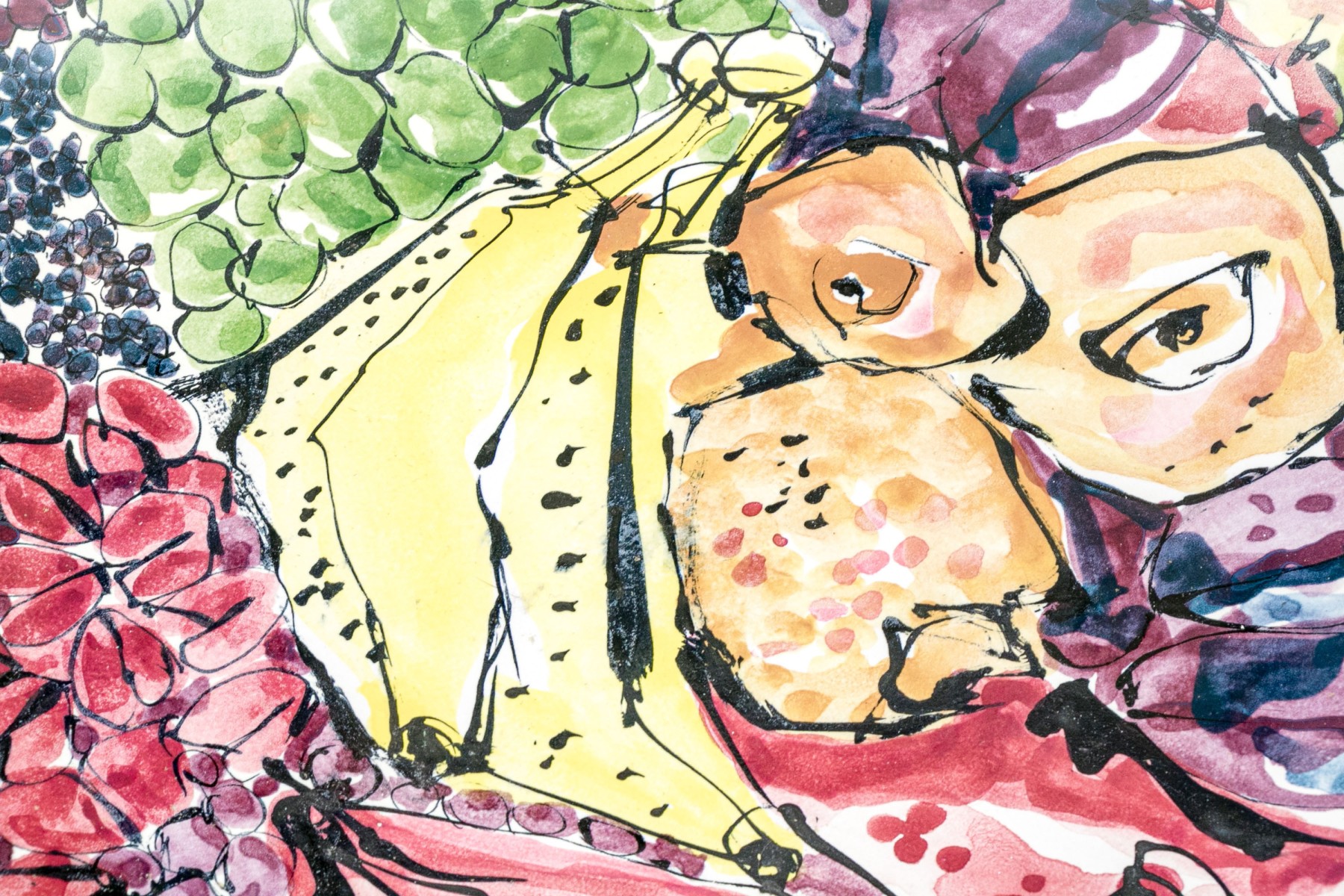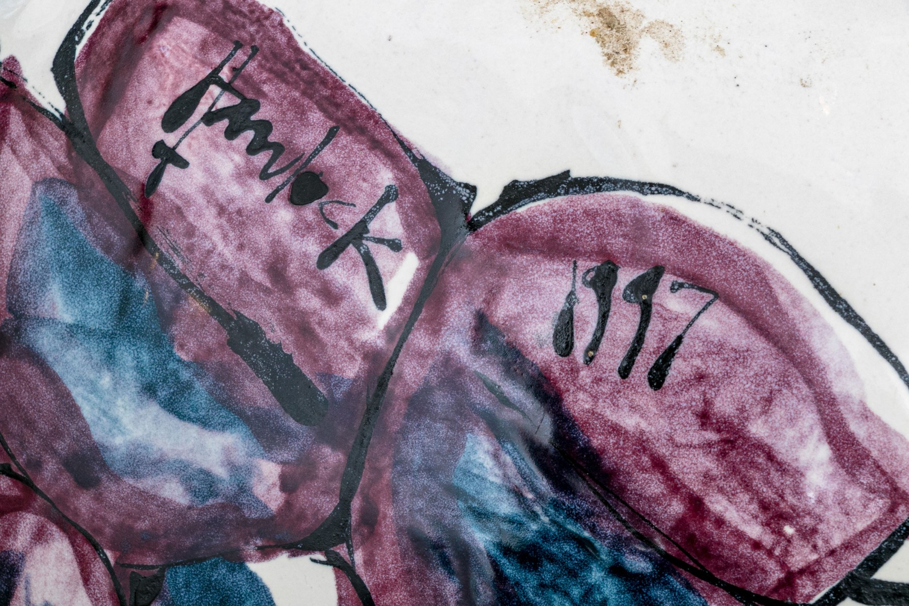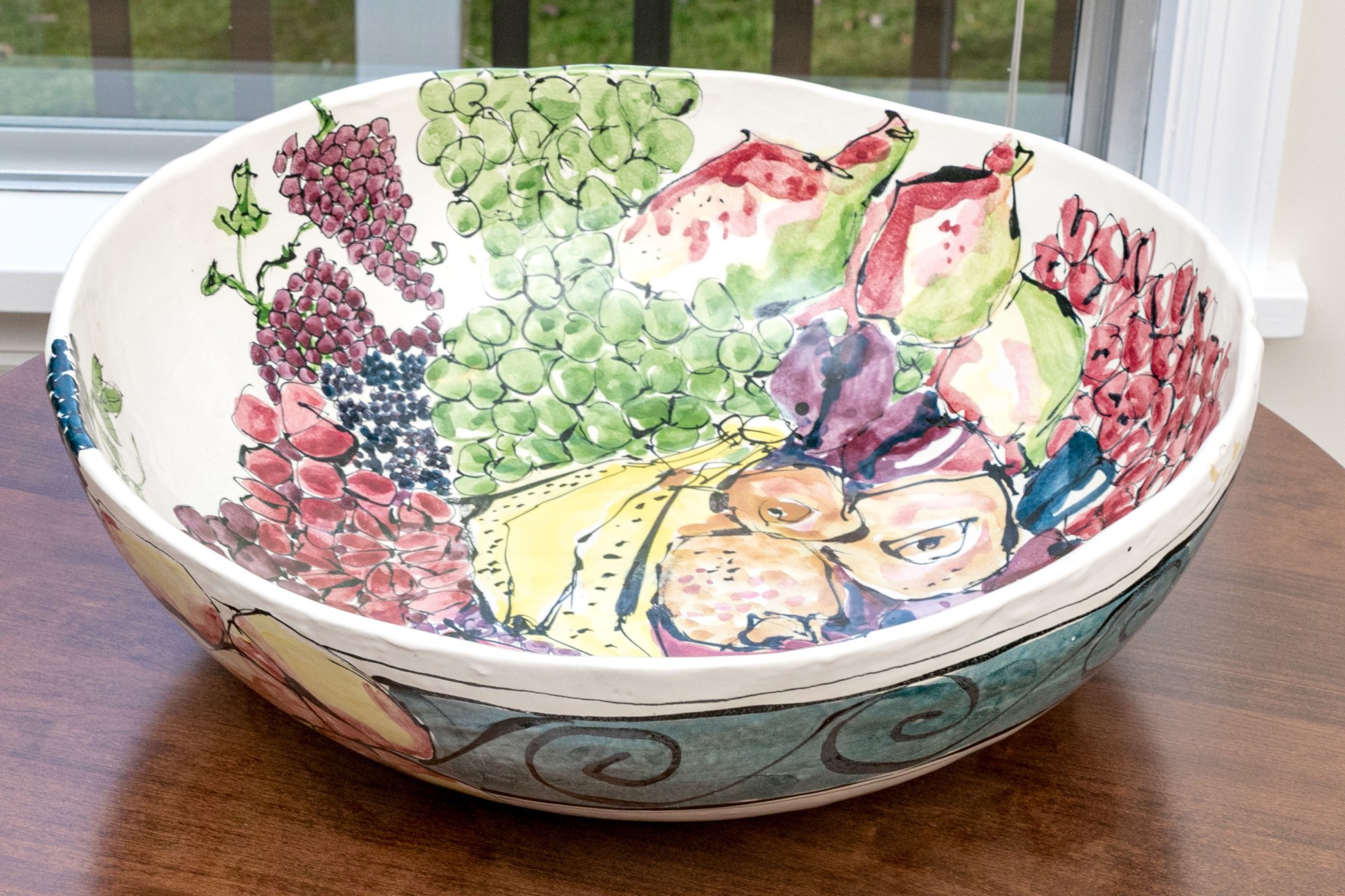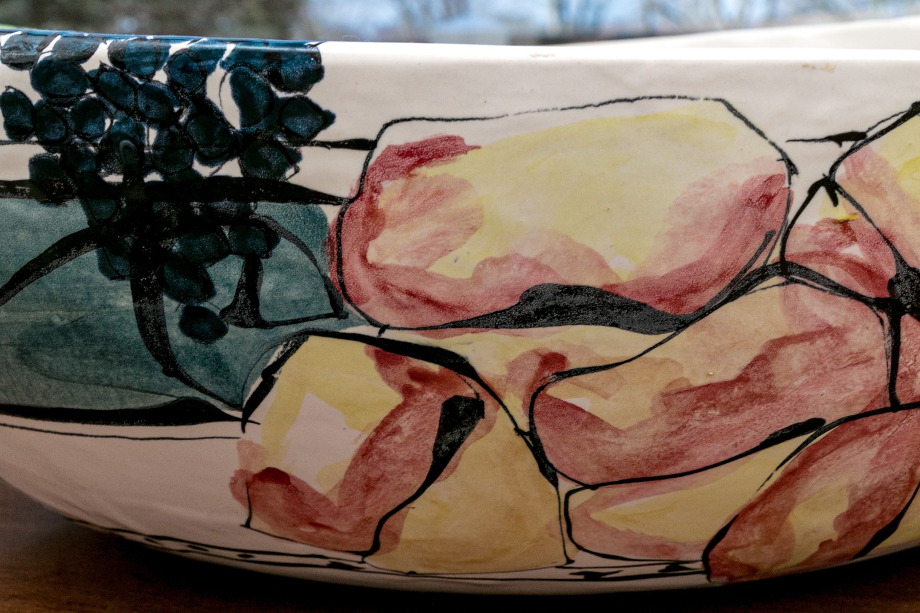 A beautiful fruit bowl with hand painted fruit decorations. Signed Hancock and dated 1997 underfoot. A great and large bowl perfect for displaying fruit or display on its on!