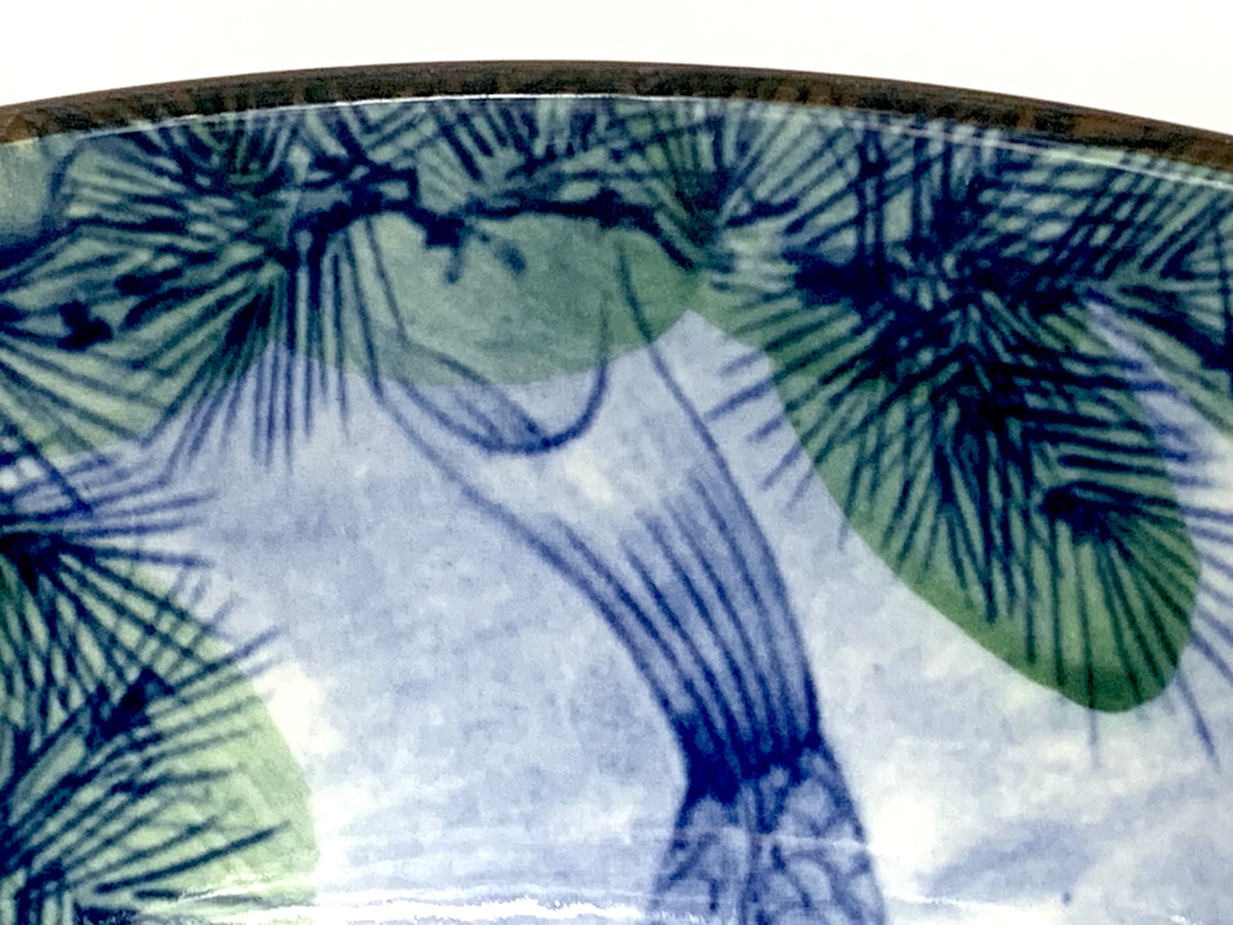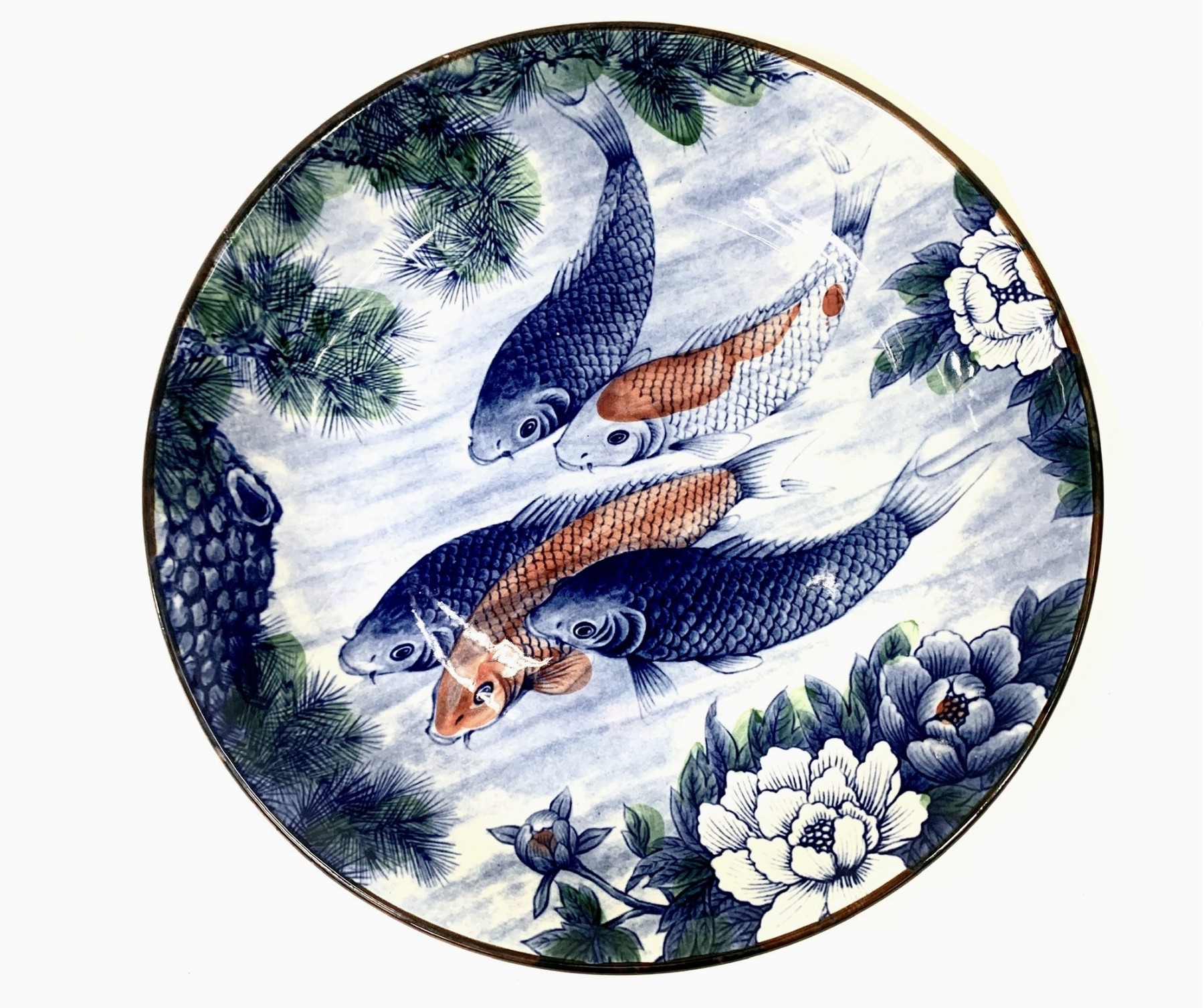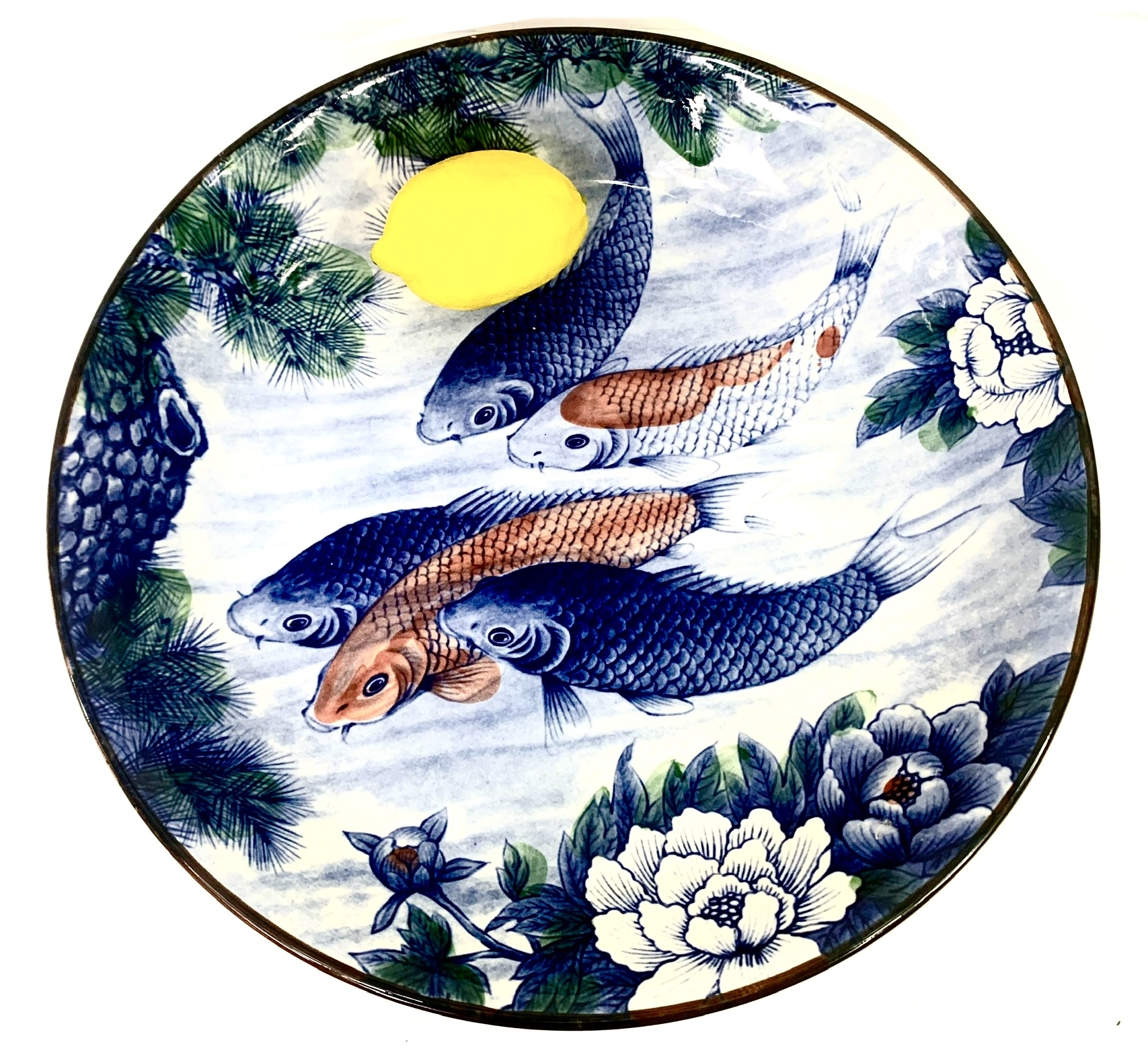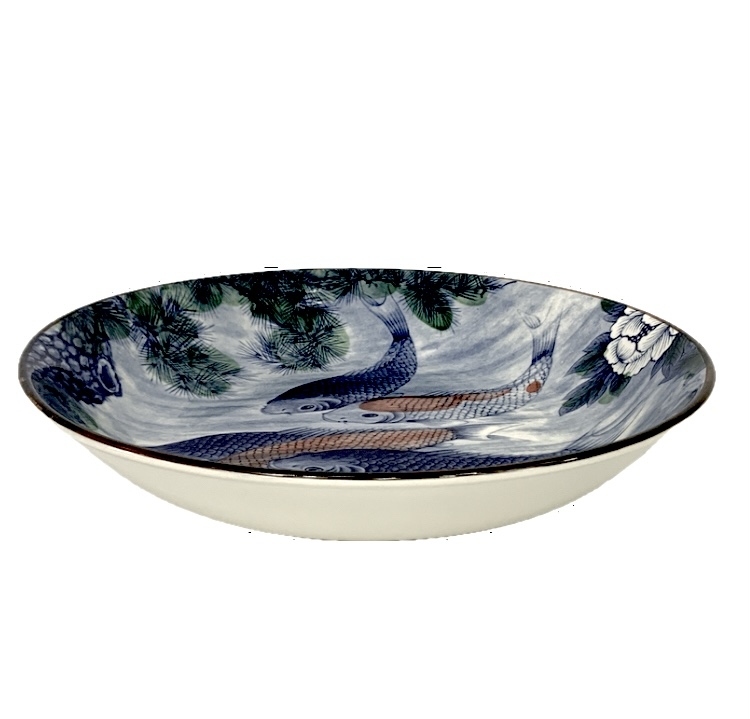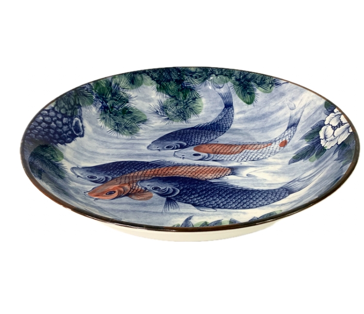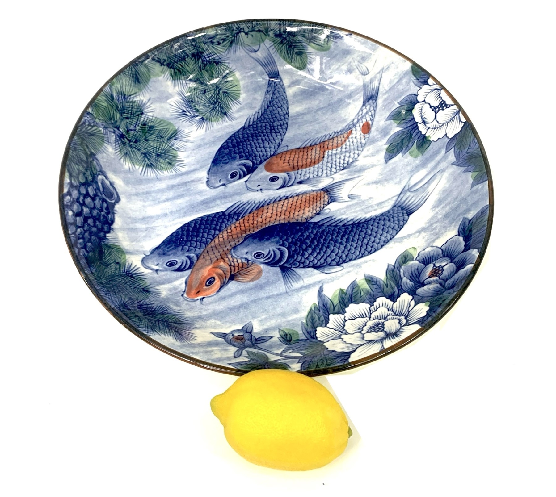 A gorgeous and large Japanese ceramic bowl decorated with blue and orange koi fish, white lotus and an overhead tree. The bowl is finished with a brown trim. Marked underfoot and retaining the blue made in Japan oval paper sticker.