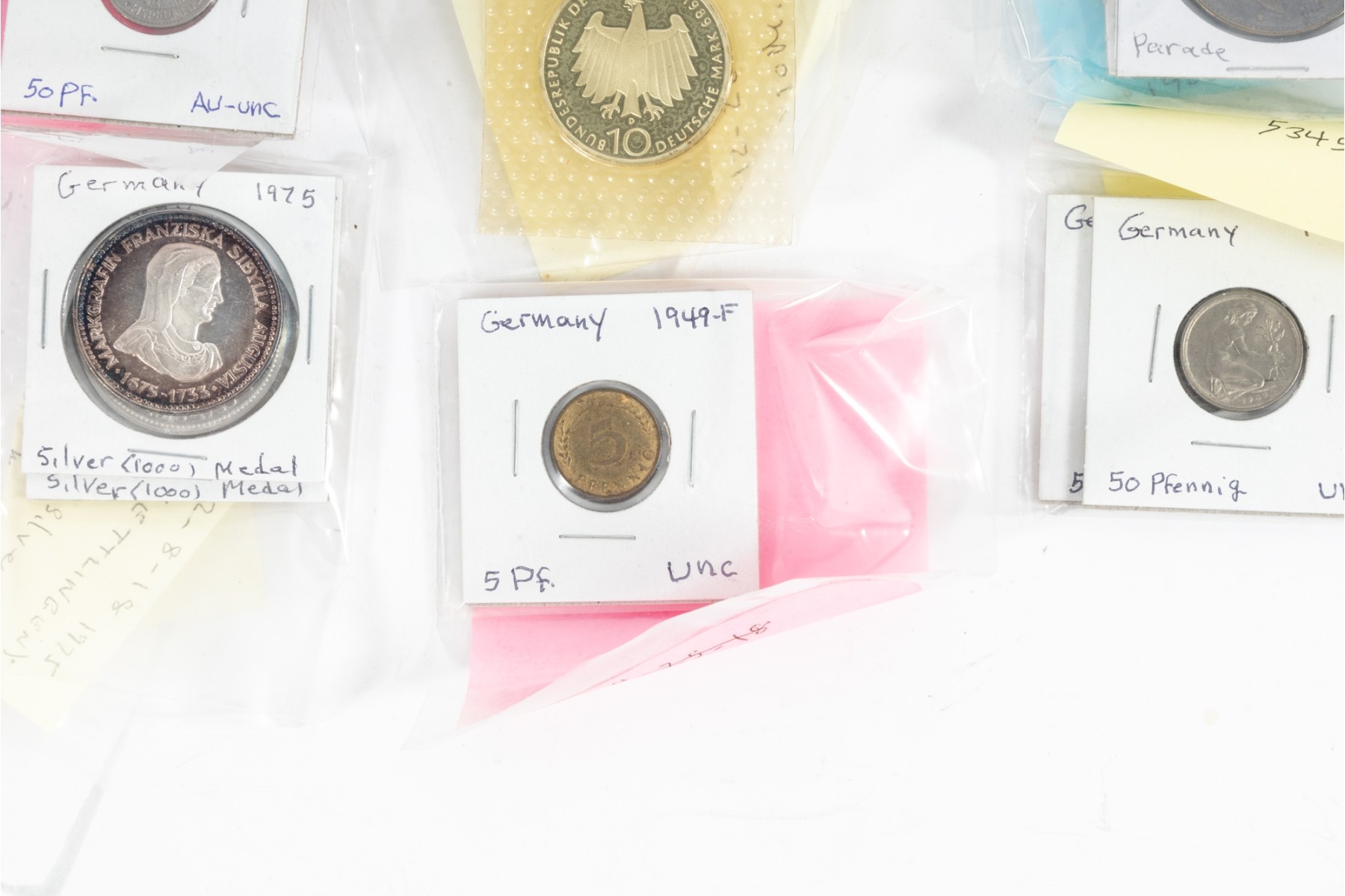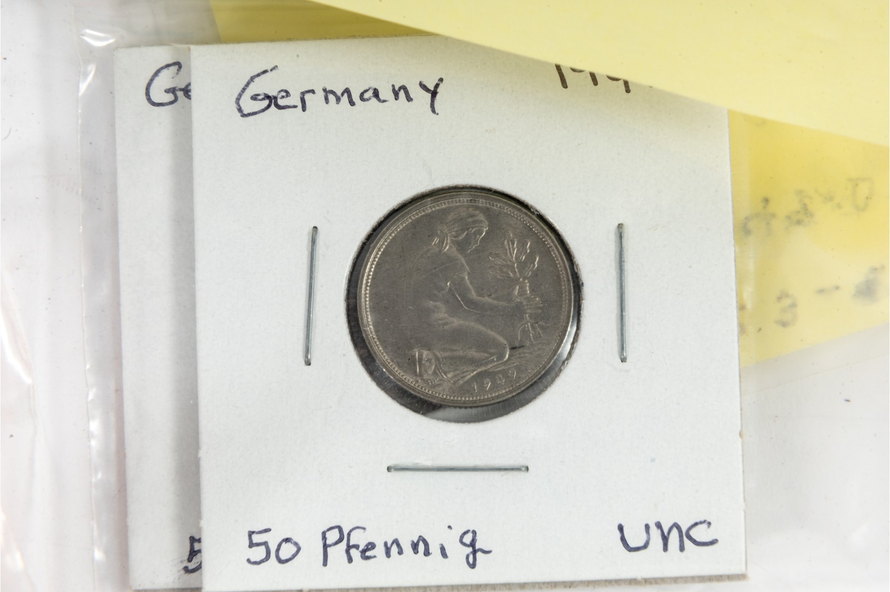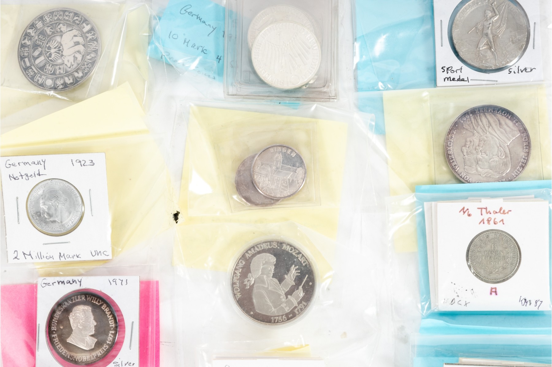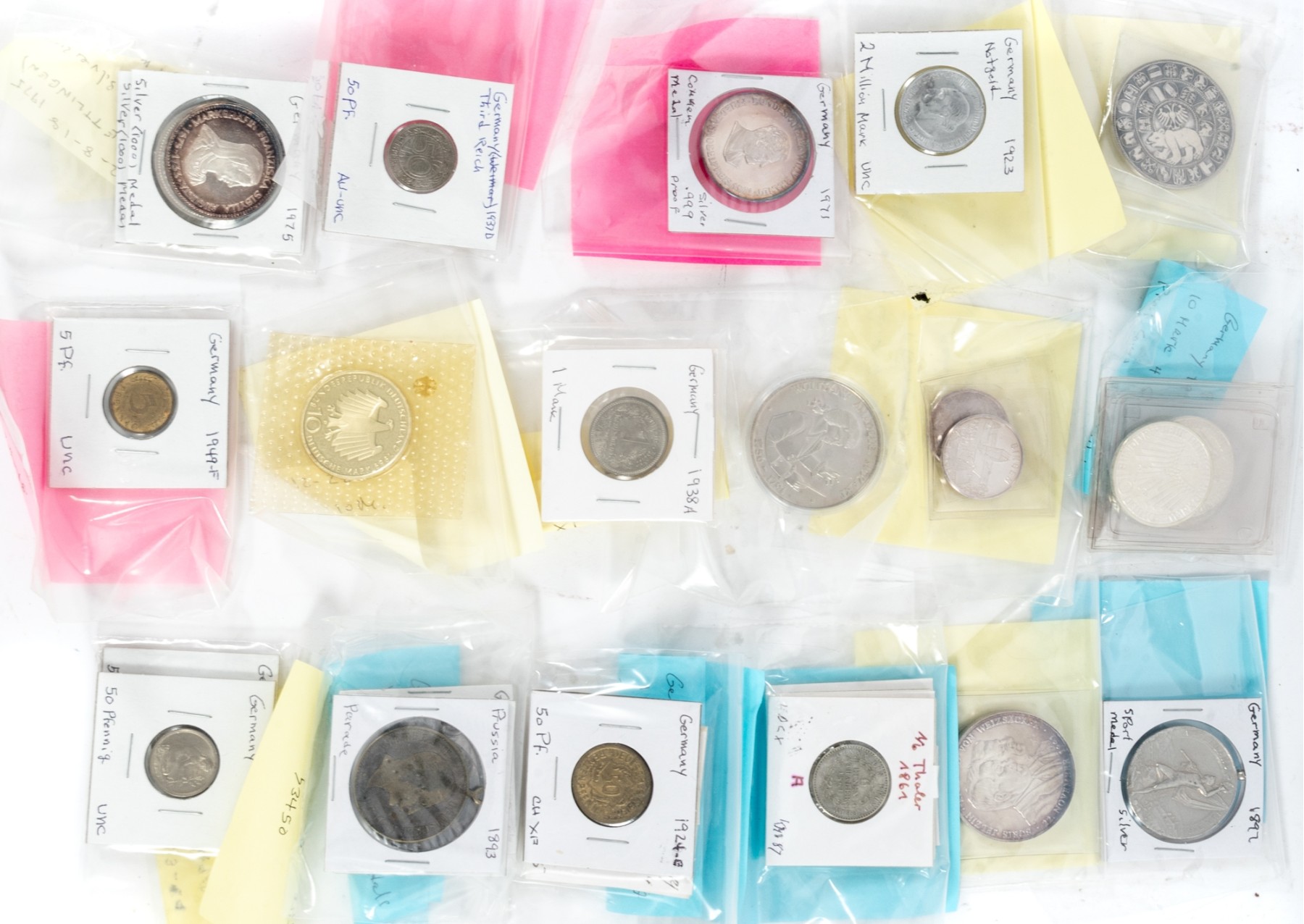 This extensive lot of German coins features a diverse selection of varying denominations and materials, showcasing the rich numismatic history of Germany. The collection includes coins made from copper, nickel, and brass, as well as several silver examples. See photos for details