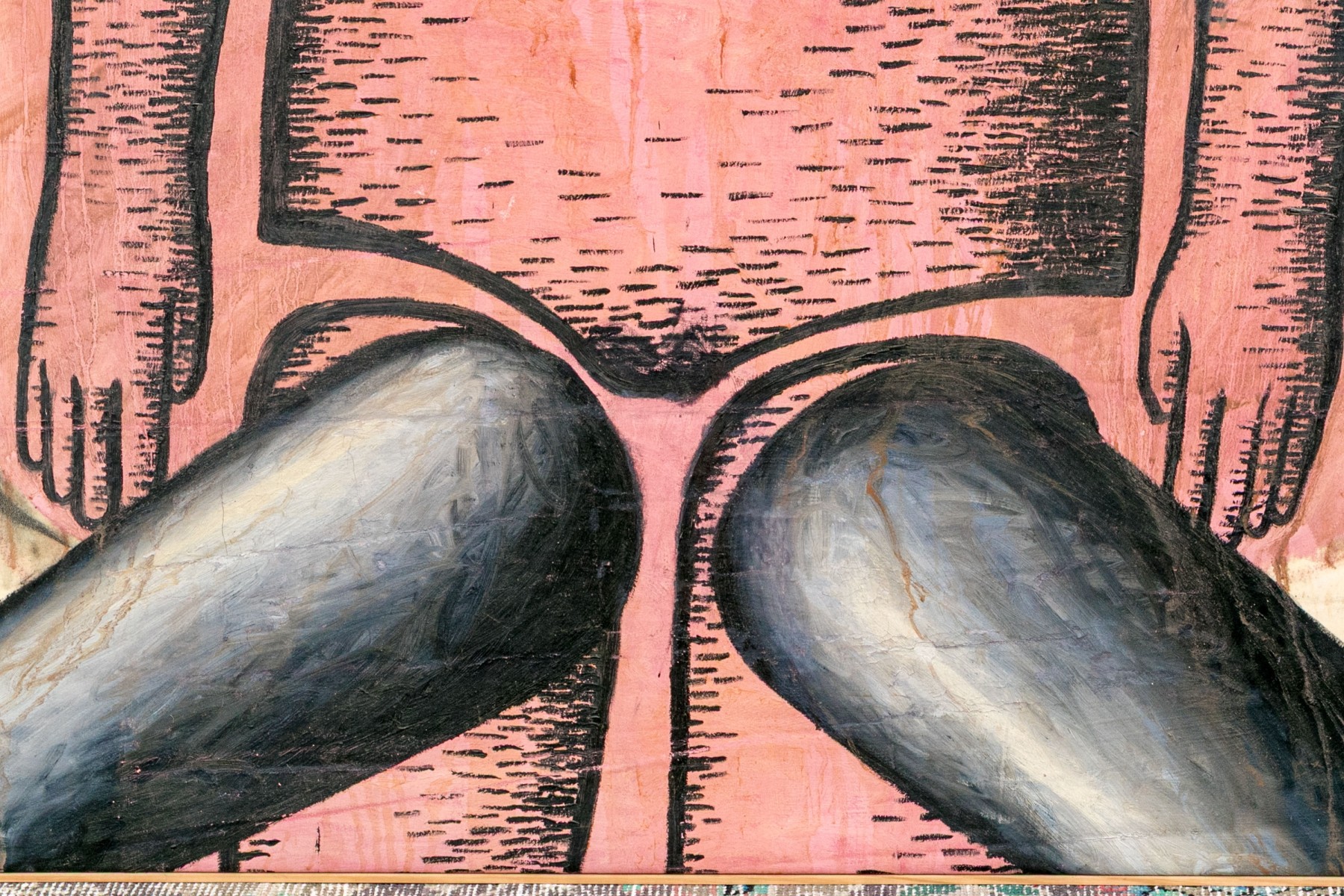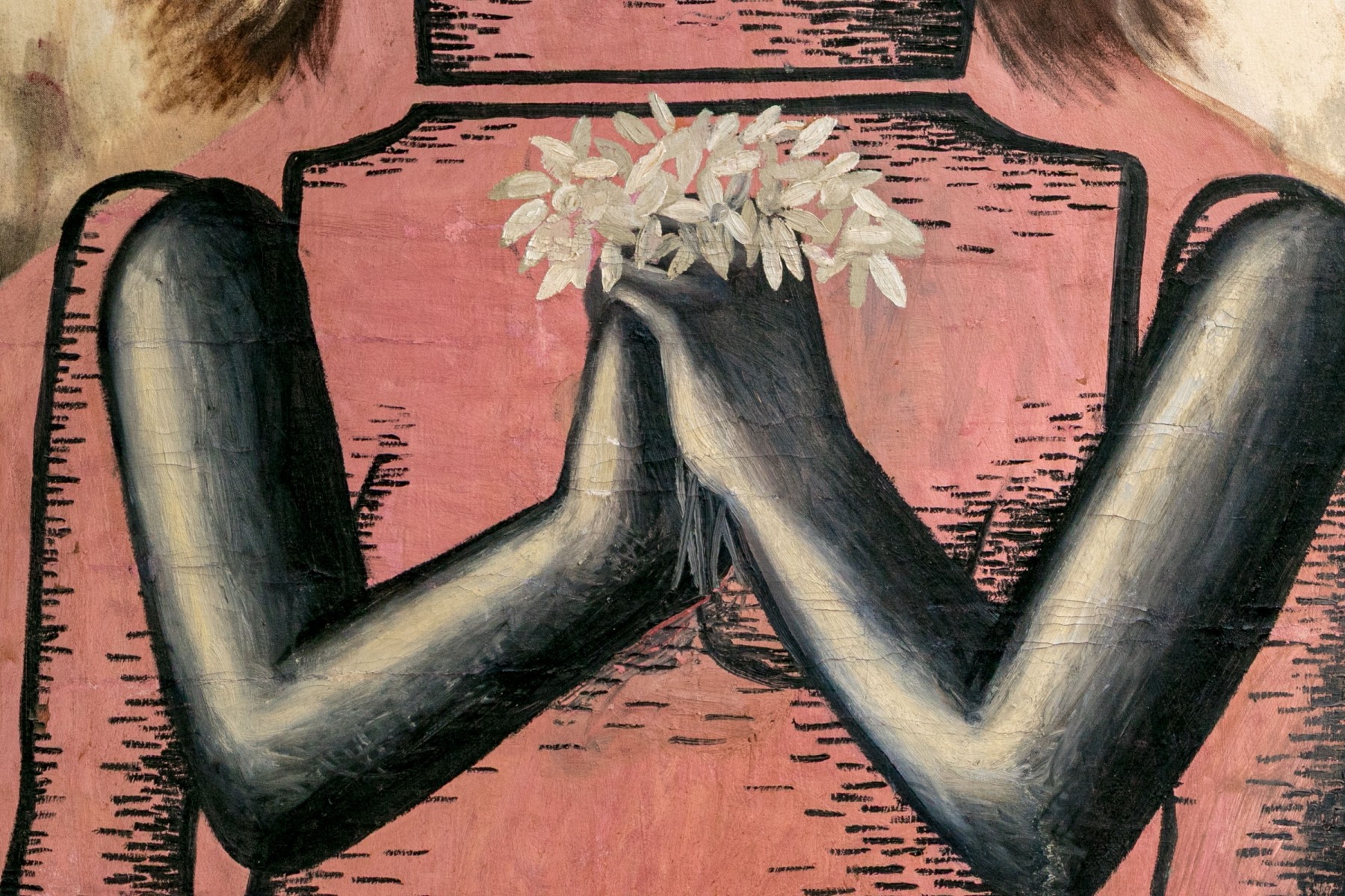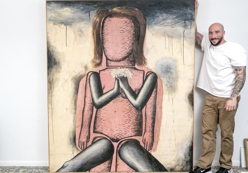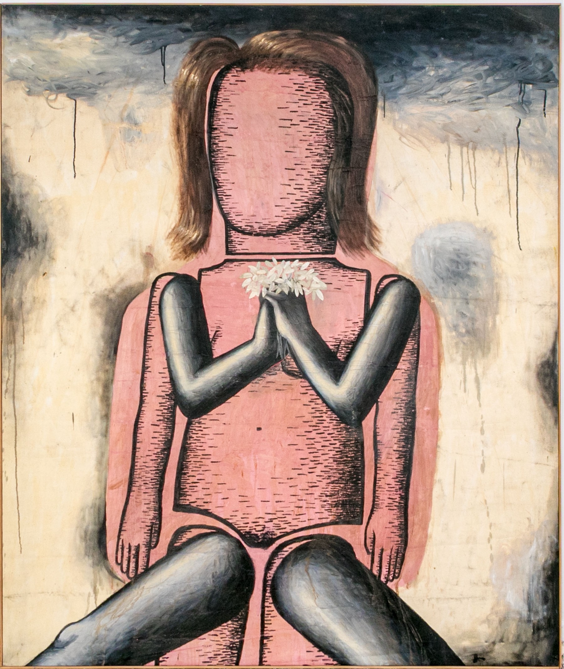 A large scale 6'8" tall oil painting on canvas depicting a metaphysical style woman with shoulder-length brown hair and an underlying flat shaded form in salmon pink overlaid by a three dimensional shaded gray form with hands clasped around white flowers. The figure stands against an ecru background with drippy gray forms swirling around the top and sides. Appears to be unsigned.