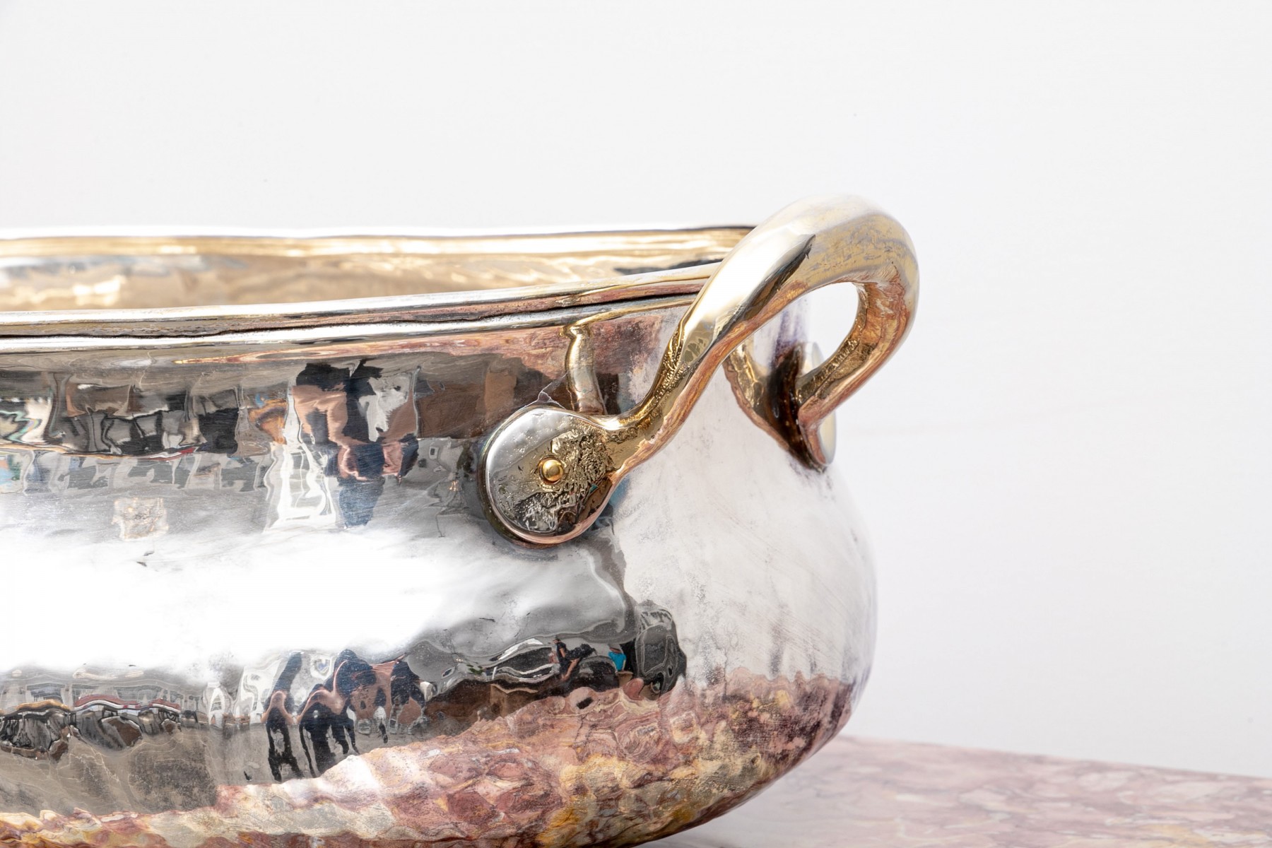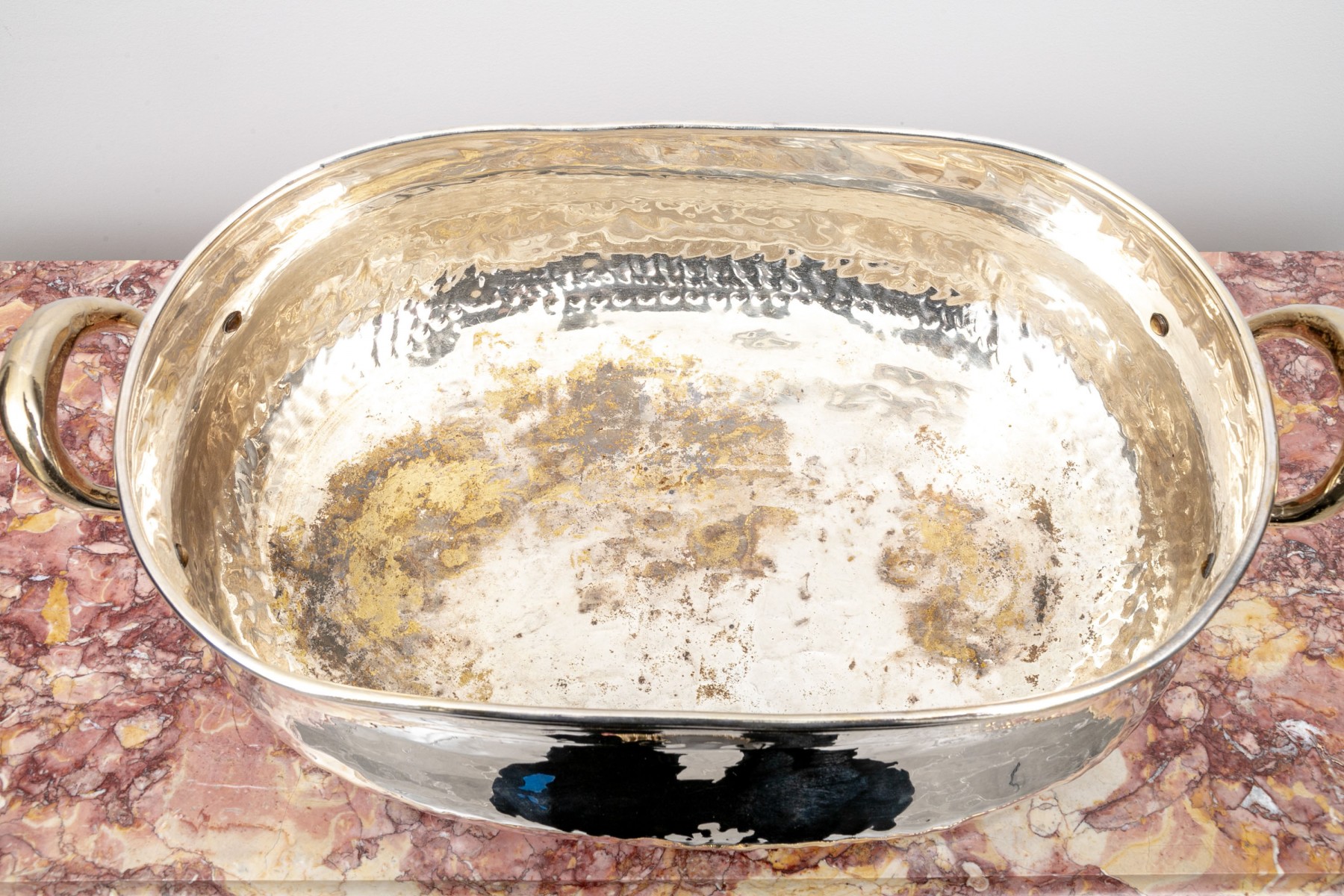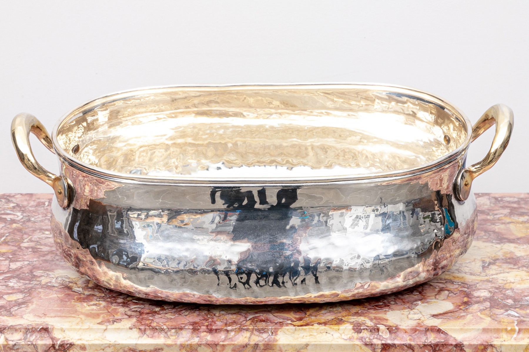 A hammered silver plated metal oval jardiniere with gilt tone handles.