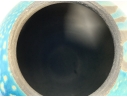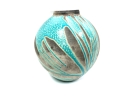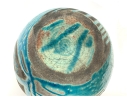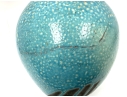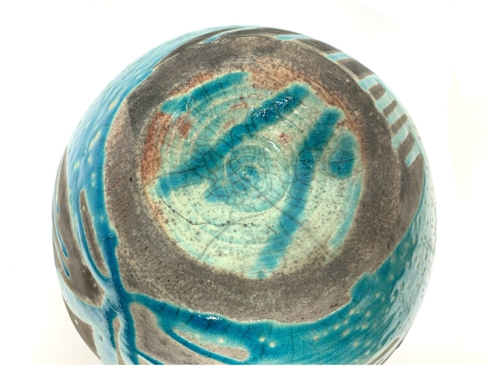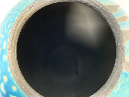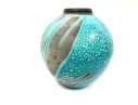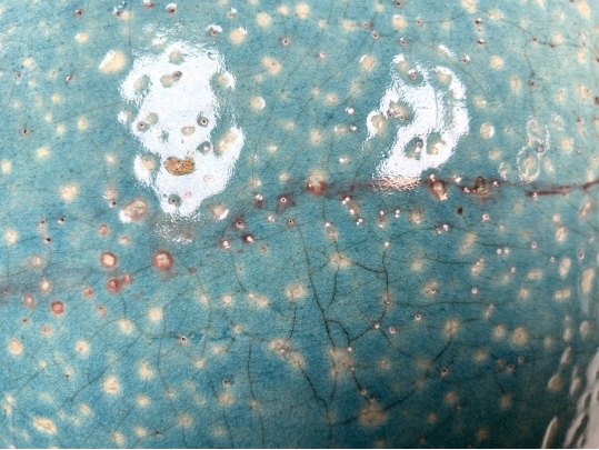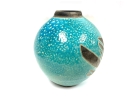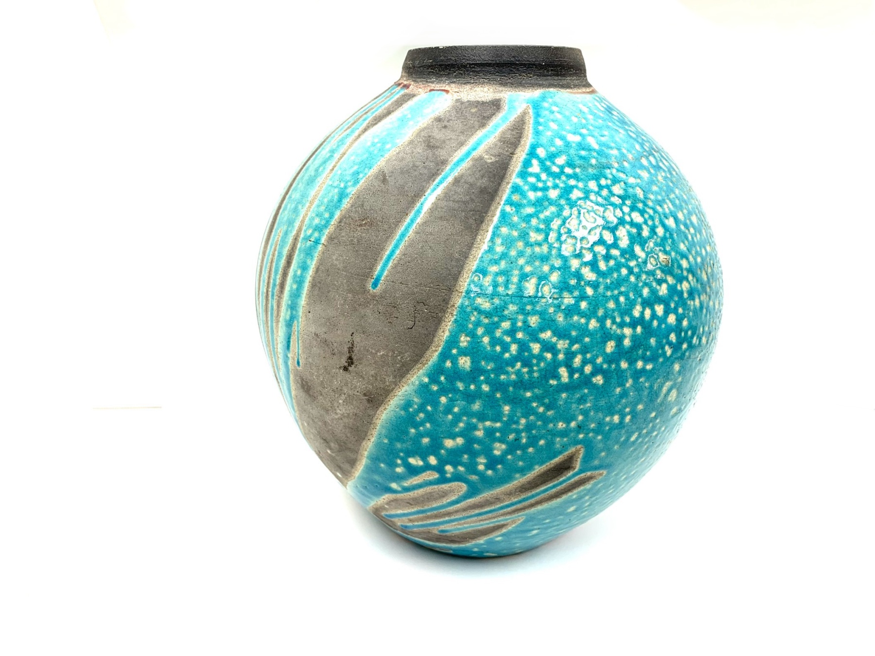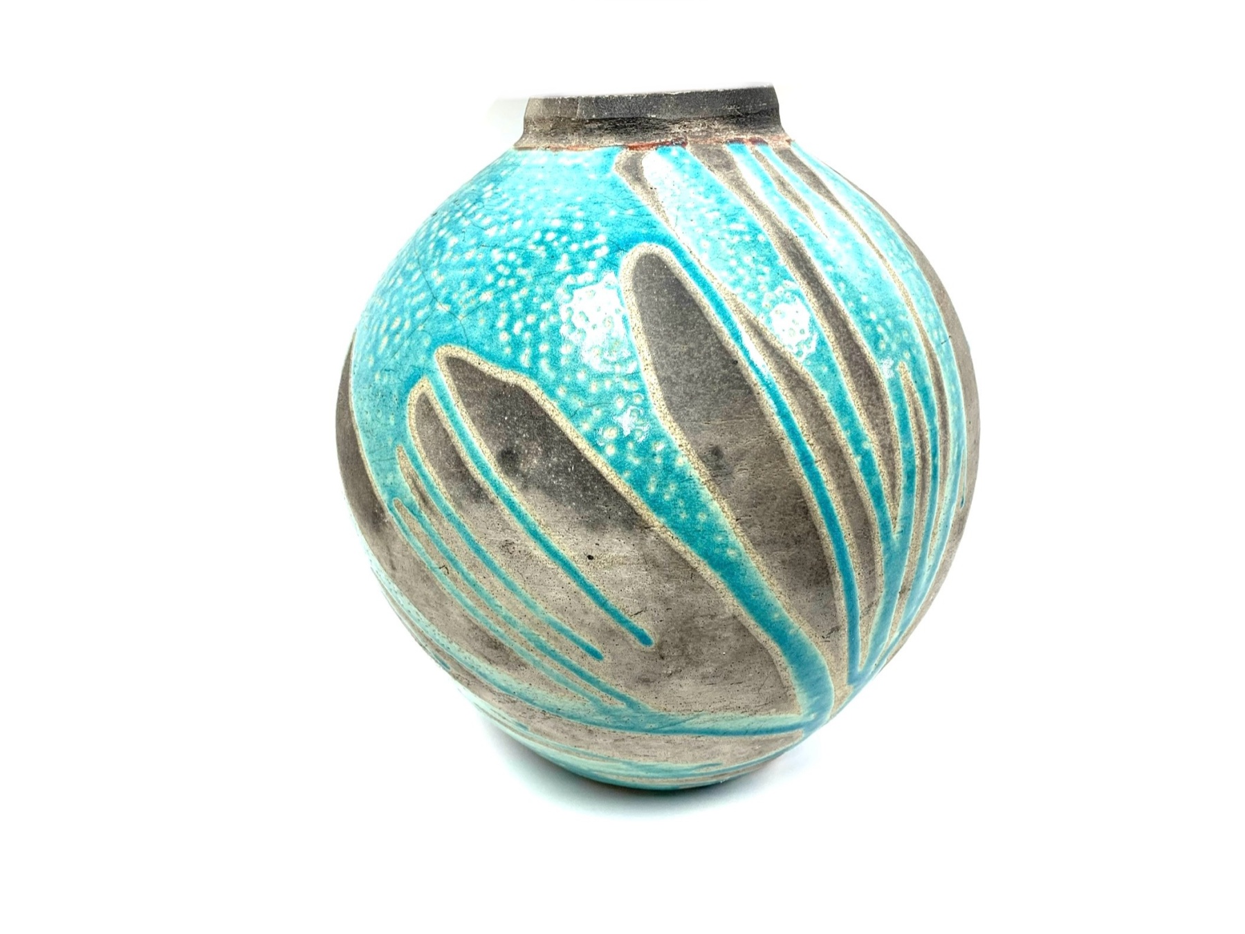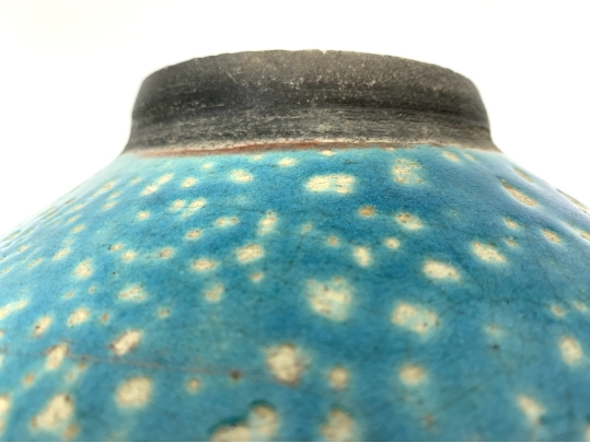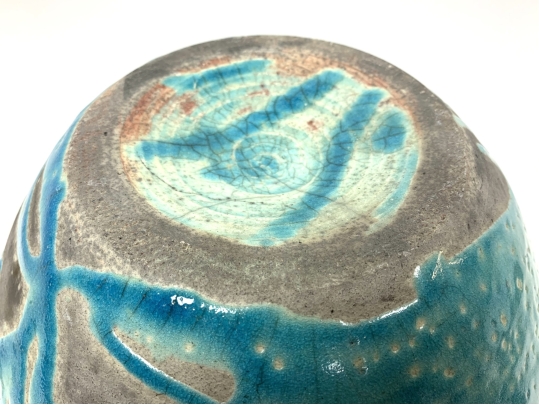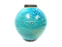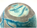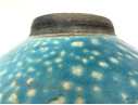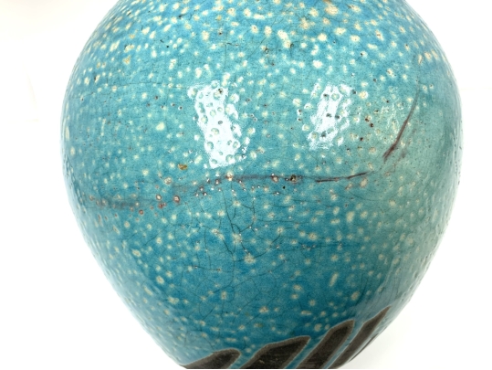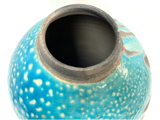 A large rake pottery jar with bold turquoise enamel glaze having a pebbled surface and accentuating the bisque grey tones.
