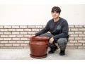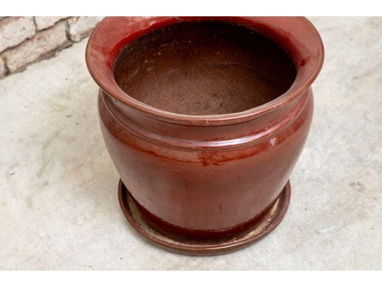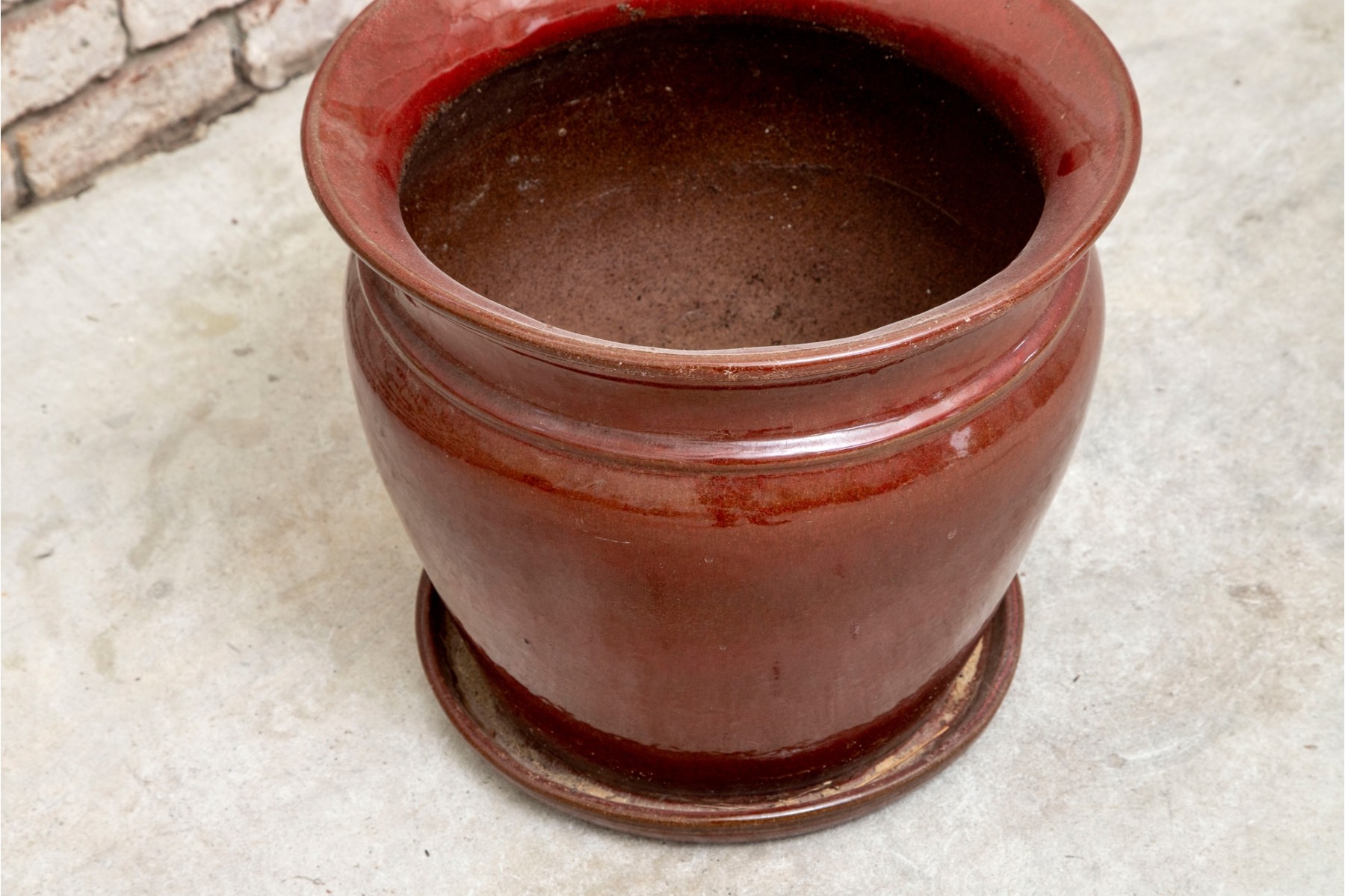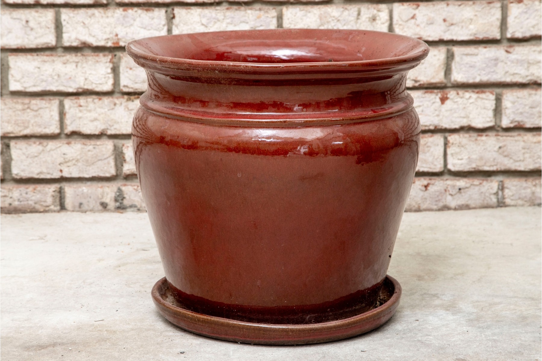 A large, 16" tall ceramic planter in a fine gloss red glaze. includes an integral underplate.