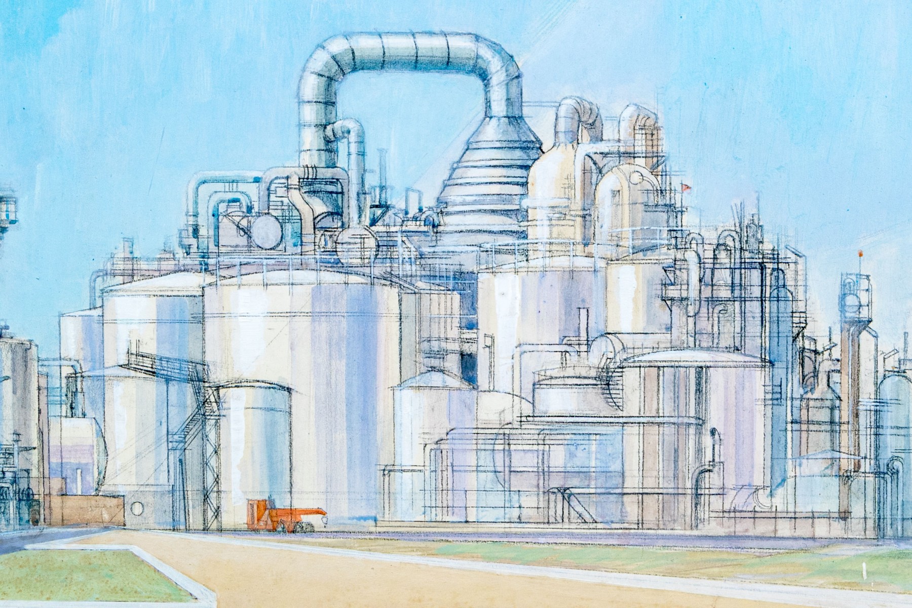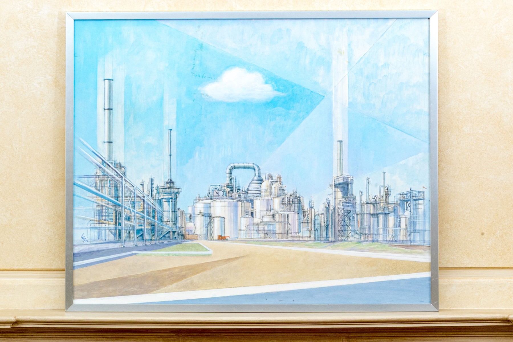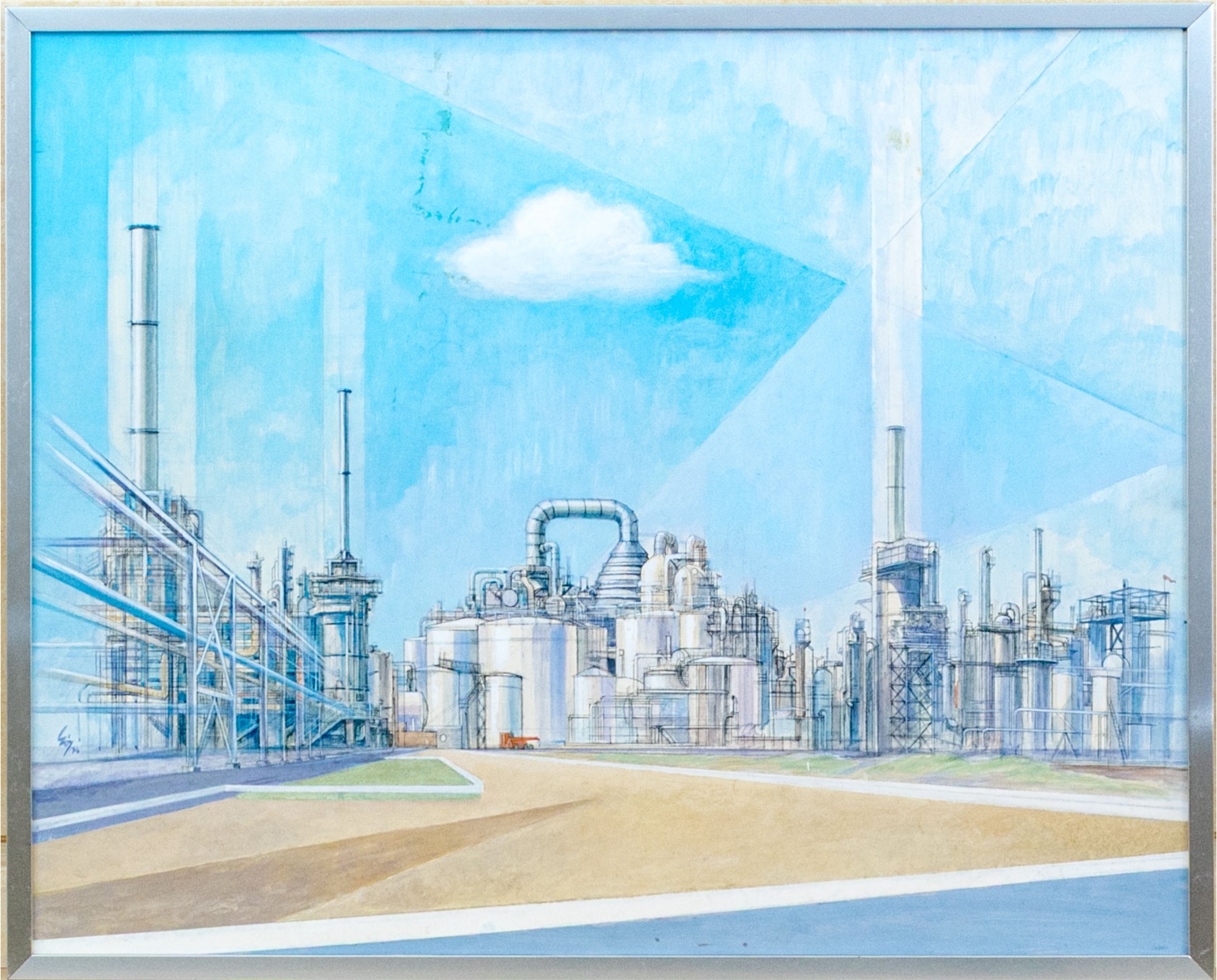 An impressively rendered and well sized painting on canvas depicting an industrial complex with large cylindrical towers and stacks with white emissions against a geometrically patterned sky with a lone cloud at the center. Signed and dated '76 lower left.