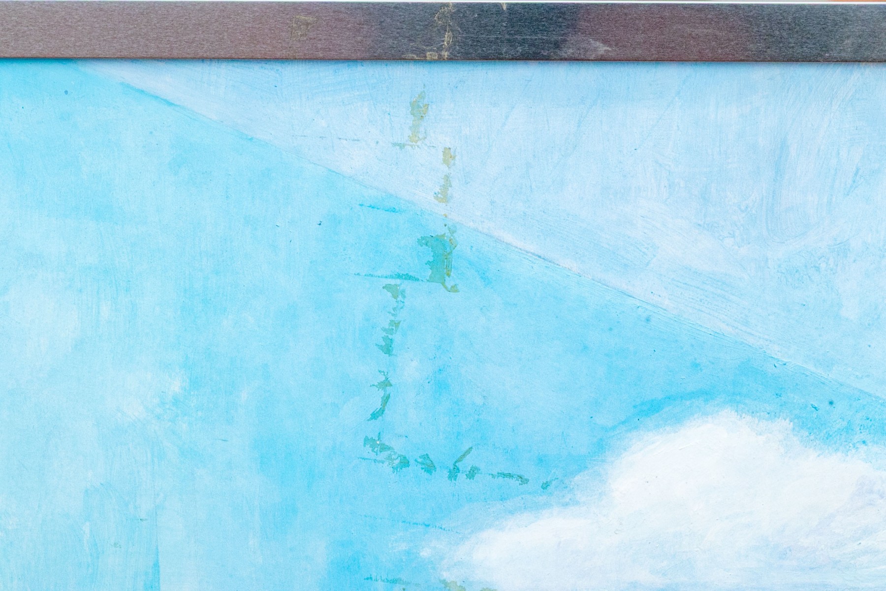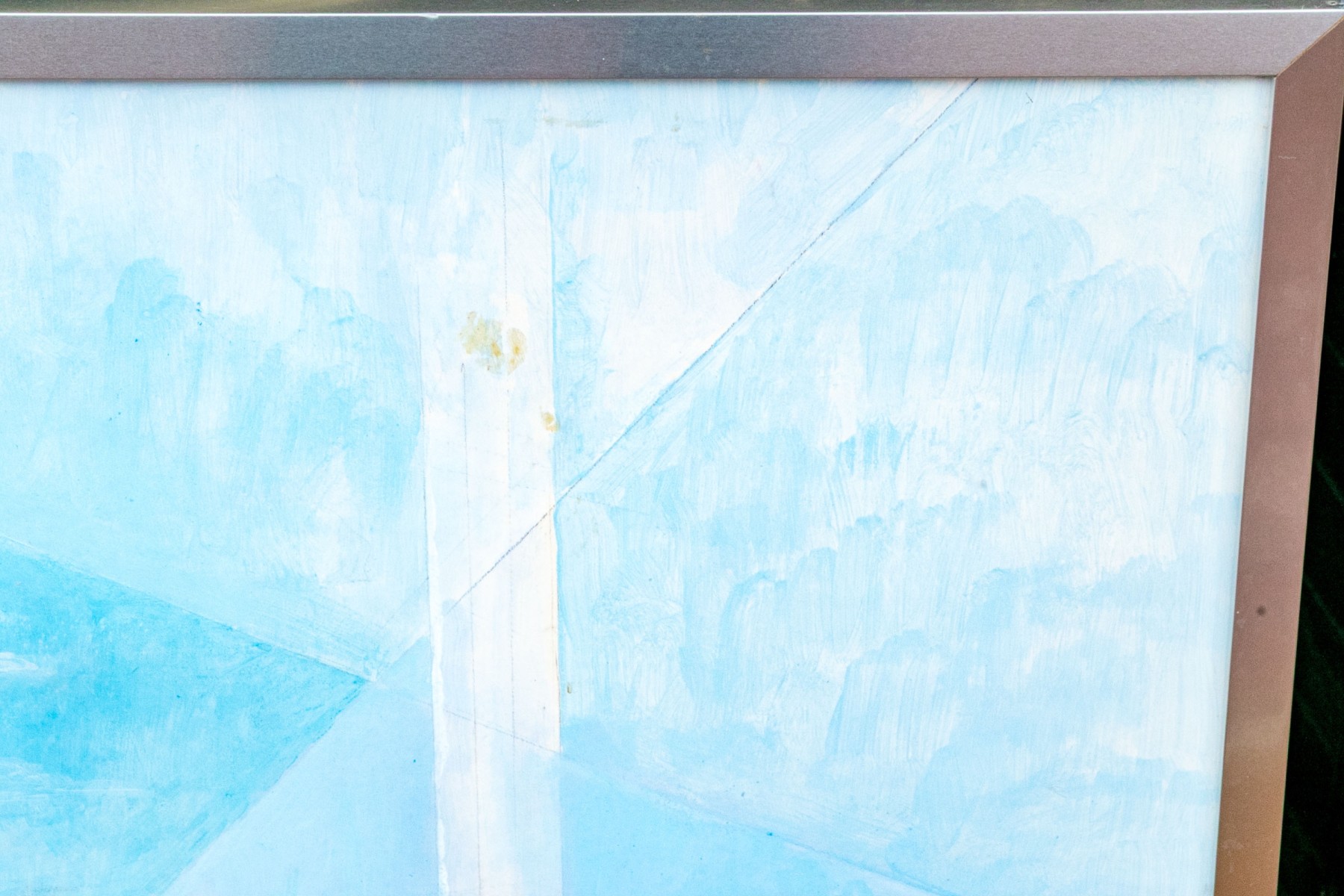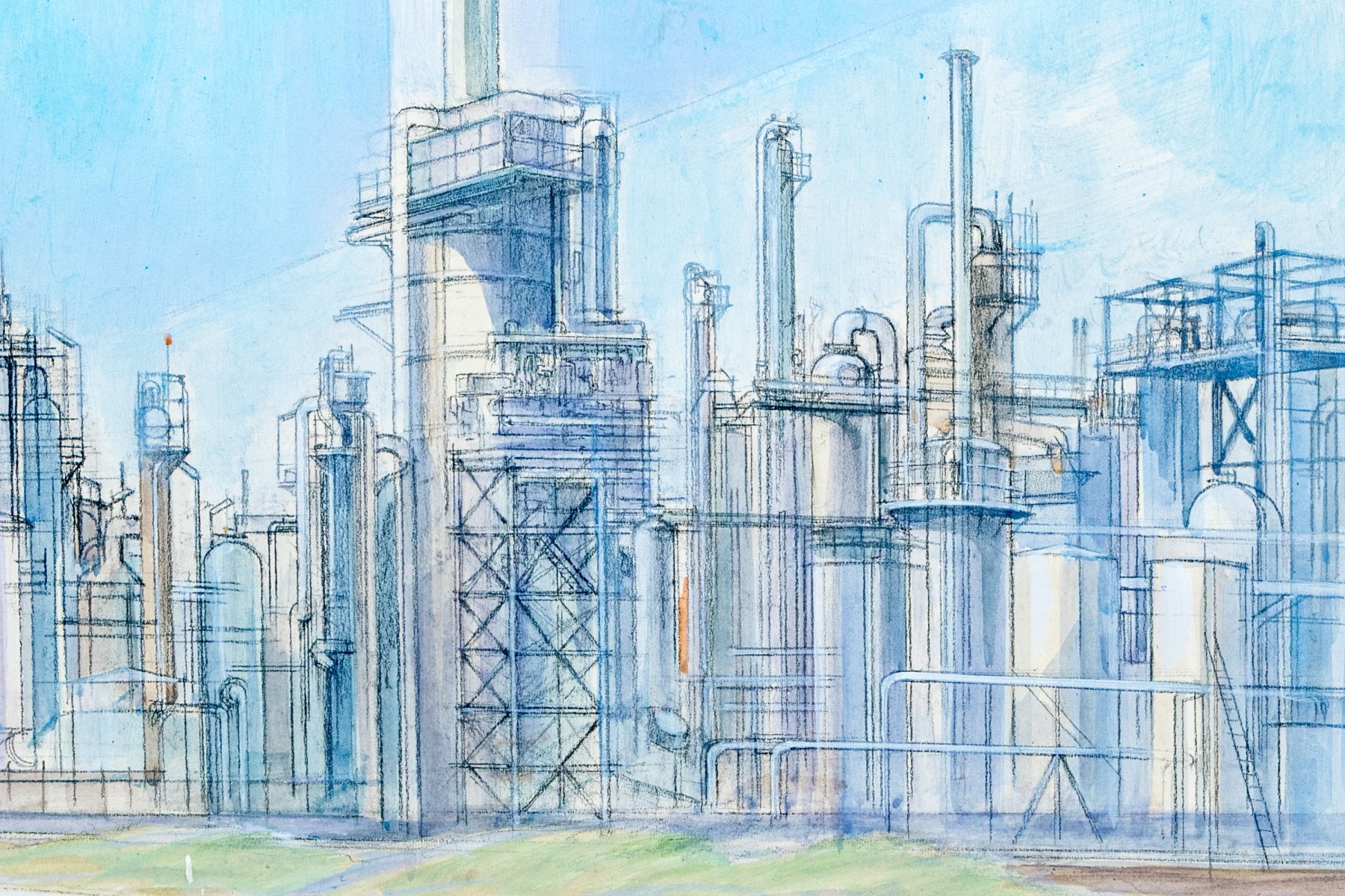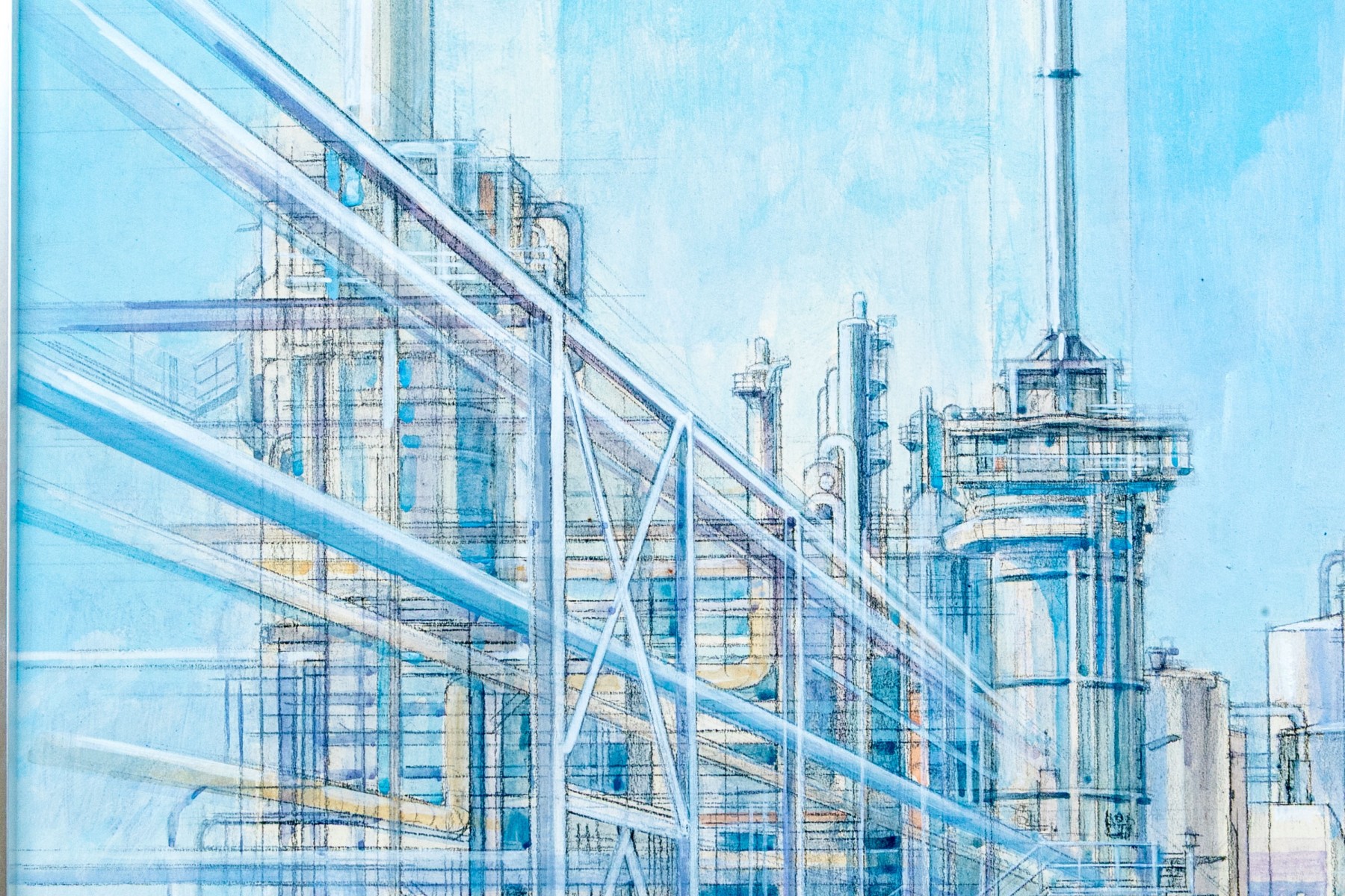 An impressively rendered and well sized painting on canvas depicting an industrial complex with large cylindrical towers and stacks with white emissions against a geometrically patterned sky with a lone cloud at the center. Signed and dated '76 lower left.