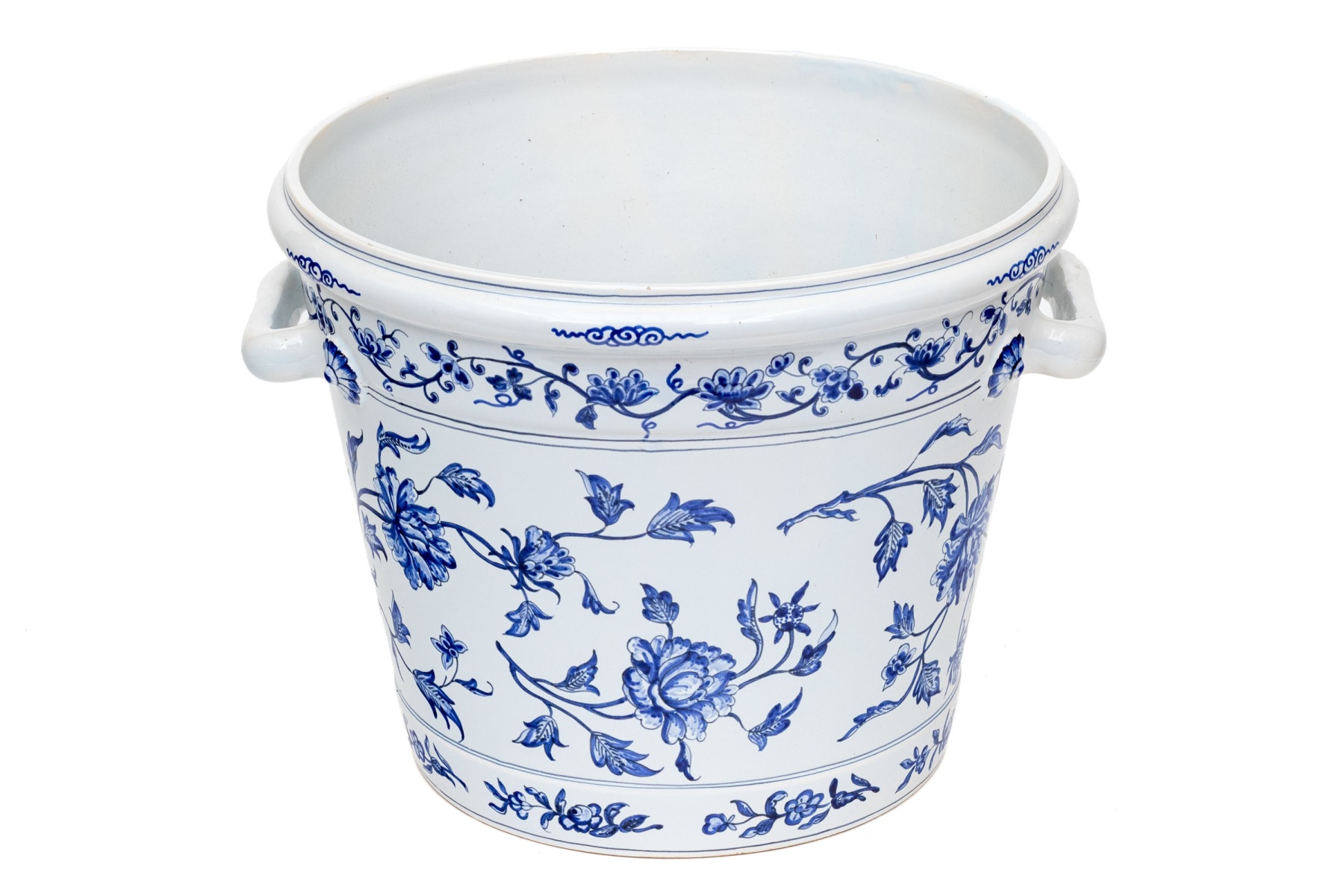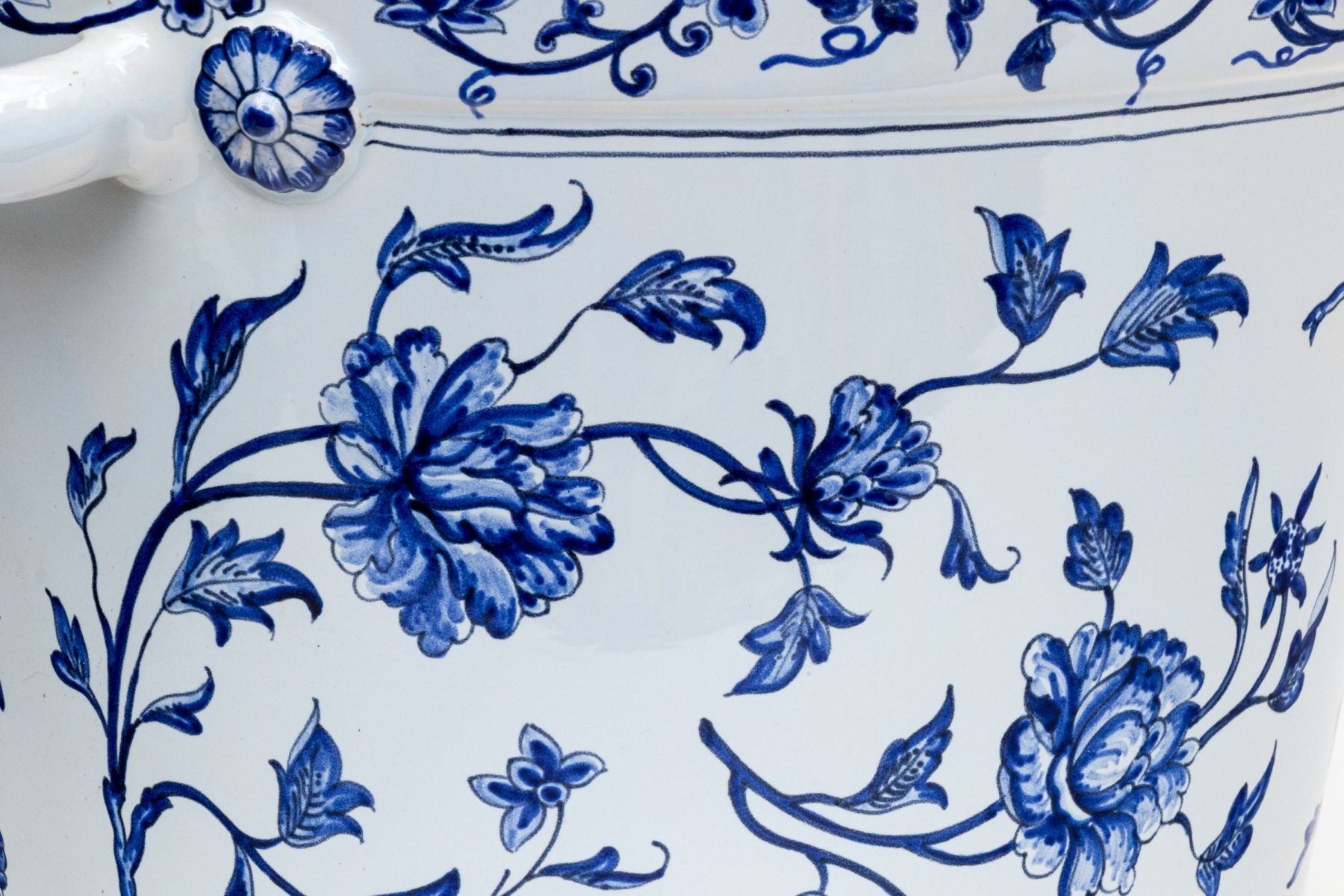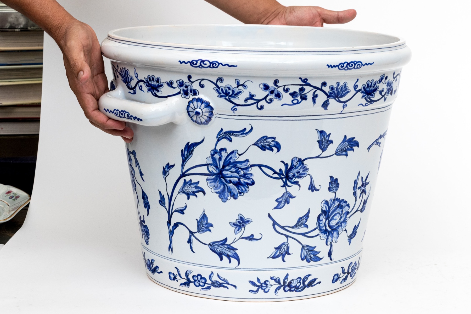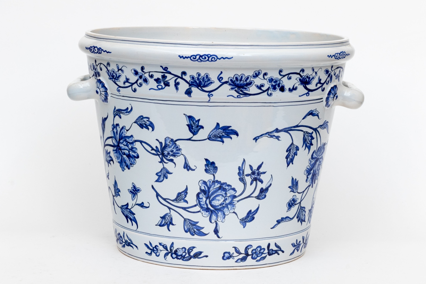 A gorgeous Tiffany & Co. ceramic planter with a classic bucket form, hand-decorated with monochromatic blue vines and floral sprays against a bright white ground. The planter features a domed band around the mouth and twin handles at the sides of a tapering cylindrical body. Marked underfoot.