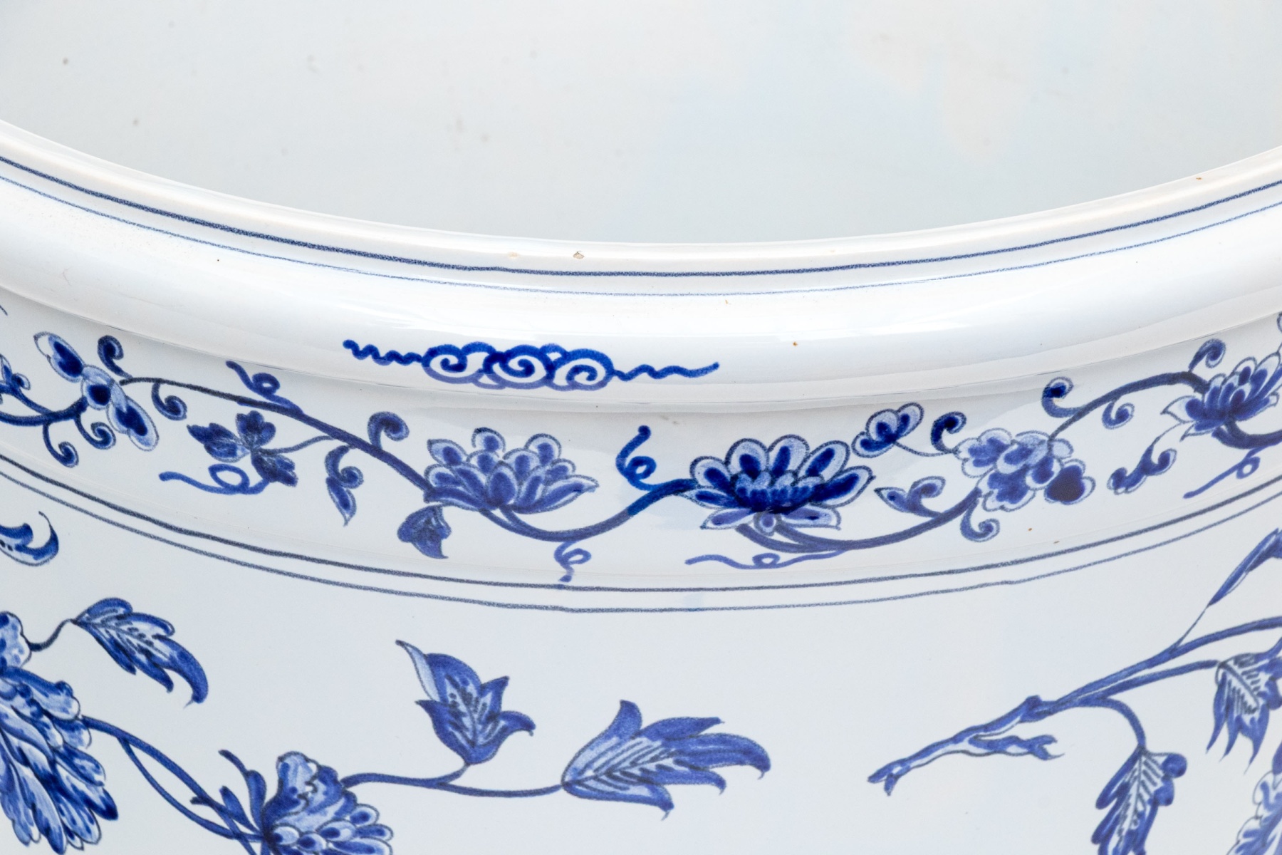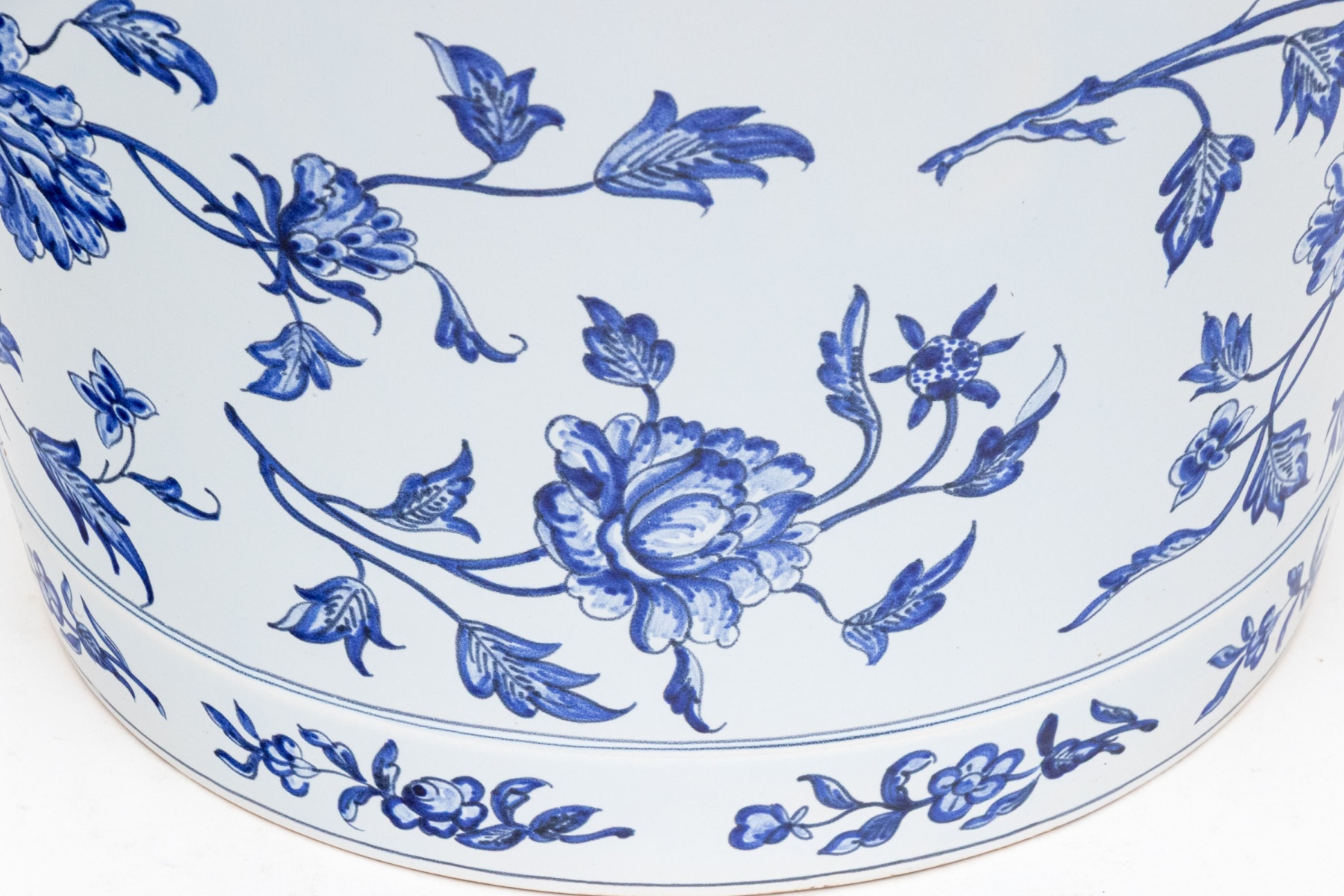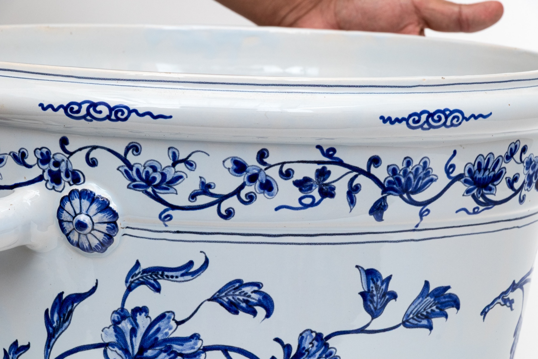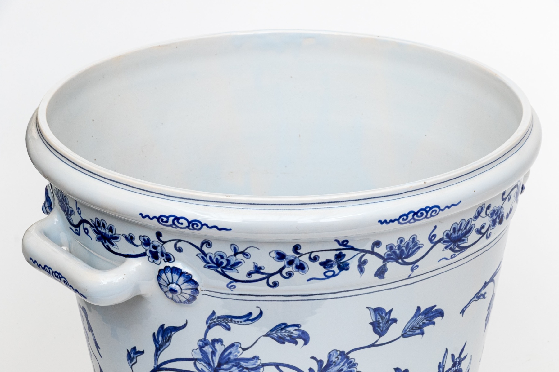 A gorgeous Tiffany & Co. ceramic planter with a classic bucket form, hand-decorated with monochromatic blue vines and floral sprays against a bright white ground. The planter features a domed band around the mouth and twin handles at the sides of a tapering cylindrical body. Marked underfoot.