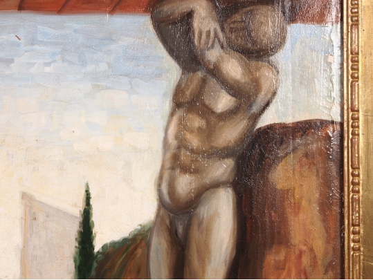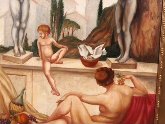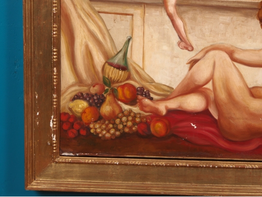 Oil on canvas, with thick gilt wood frame. Colorful and very decorative with Caryatids, Doves, Fruit, Wine, a Woman and Young Boy. Losses to gilding on frame as well as paint loss. Age appropriate craklure with no flaking.