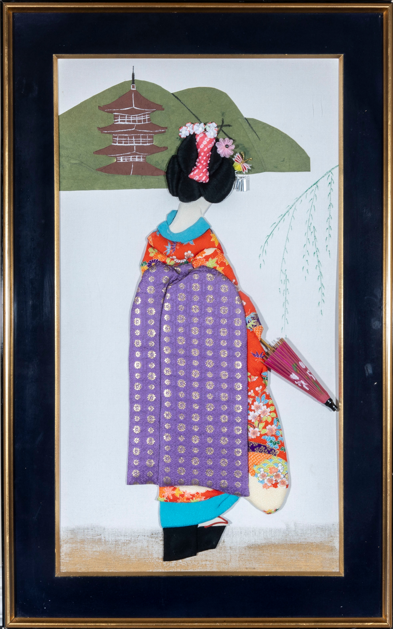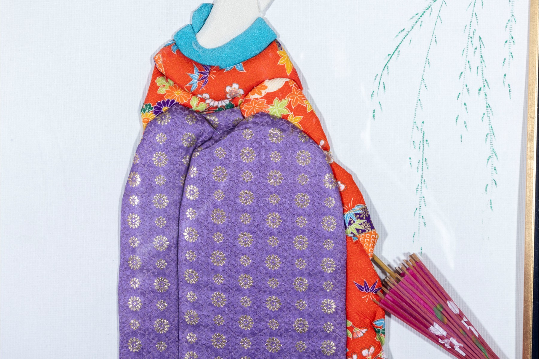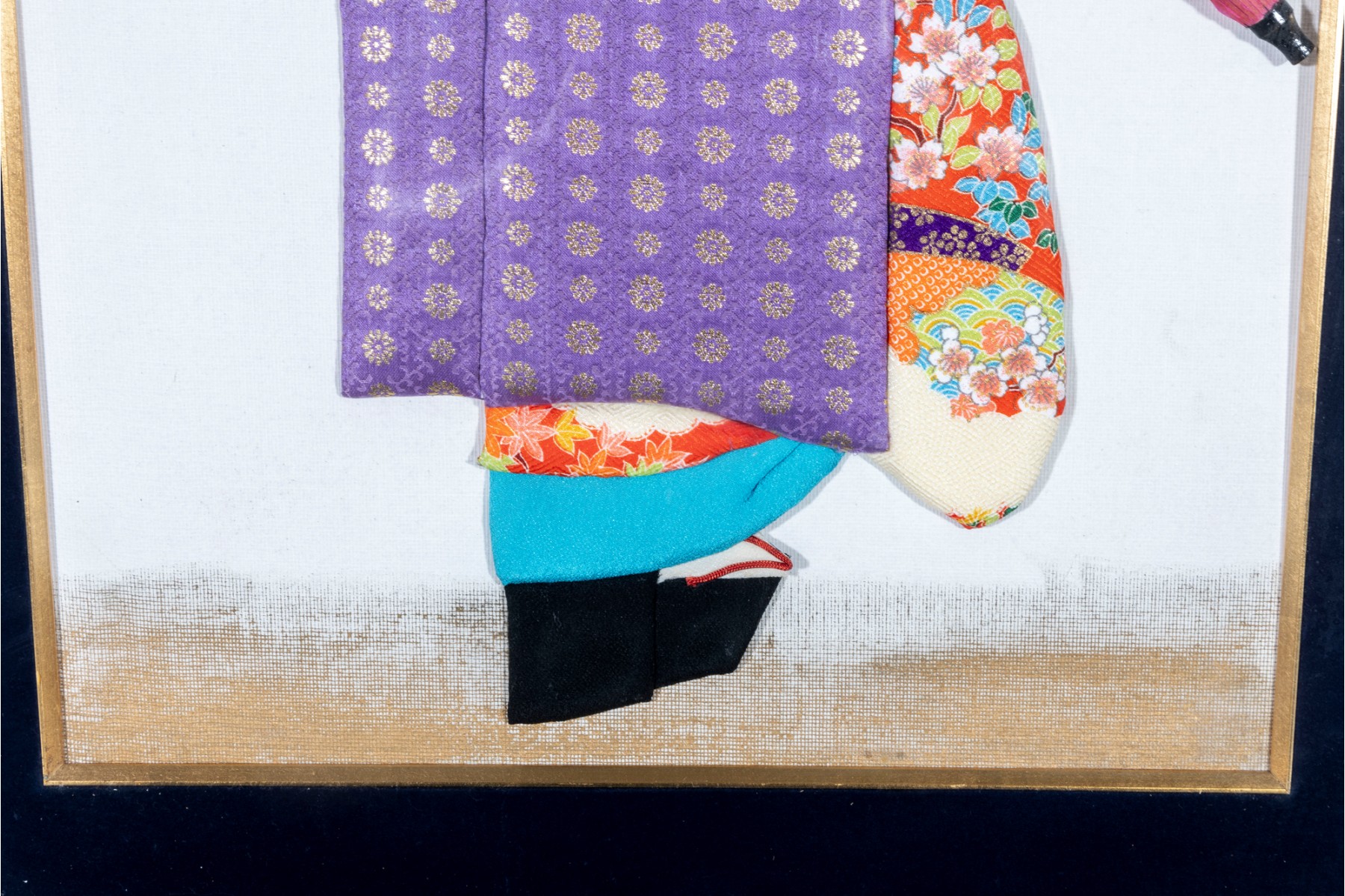 A traditional Japanese Oshie (Oshi-e), a form of Japanese handicraft originating from the Edo period. Built in layers, each piece is wrapped in beautiful kimono fabric or paper, padded with cotton in between, and is nailed/glued together to create a three-dimensional work of art. The background is hand-drawn in mixed media paper -- unsigned and presented in a wood shadow-box frame with a glass facing.