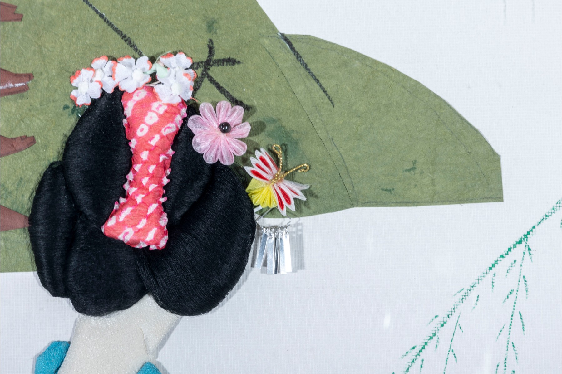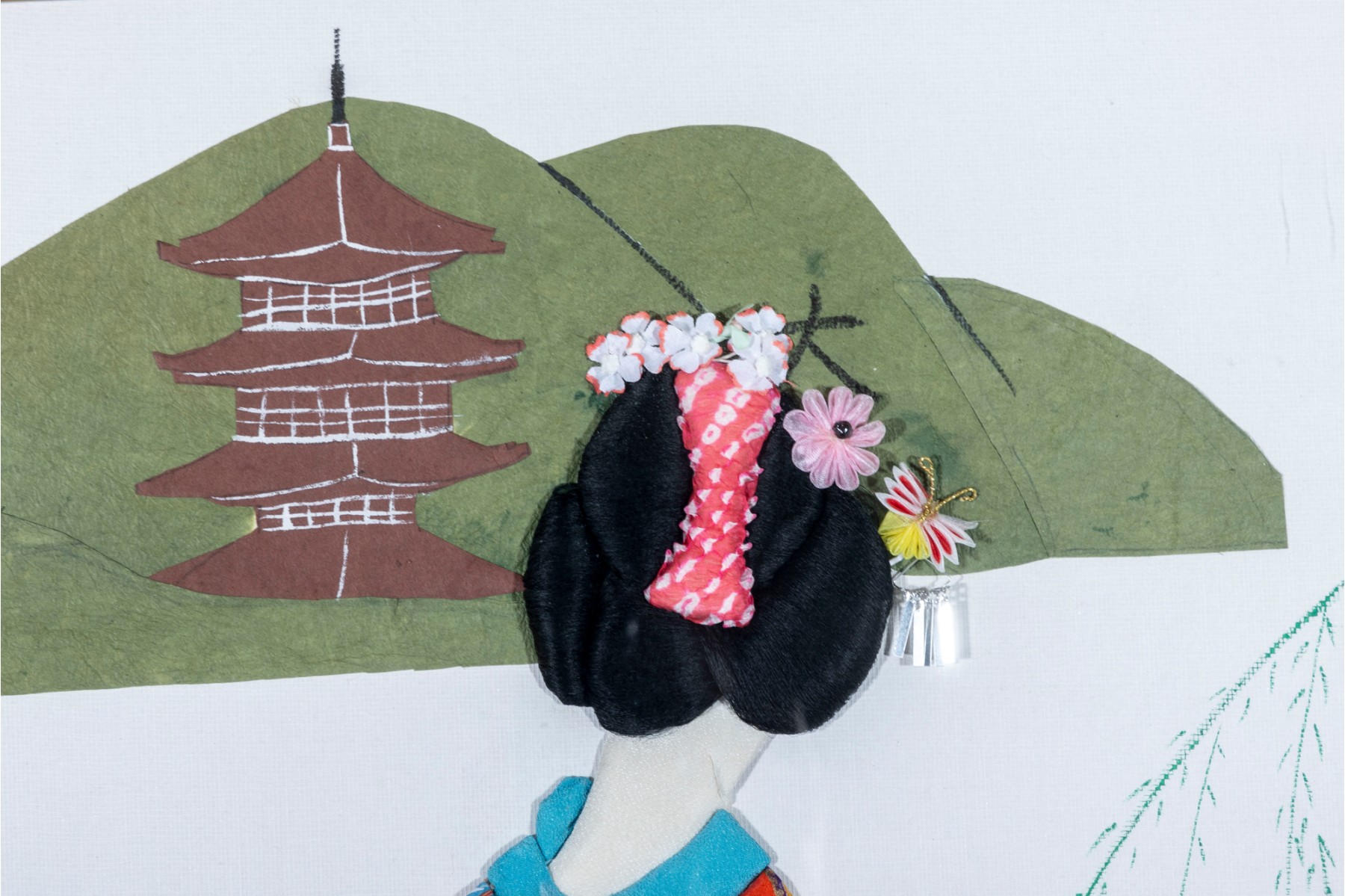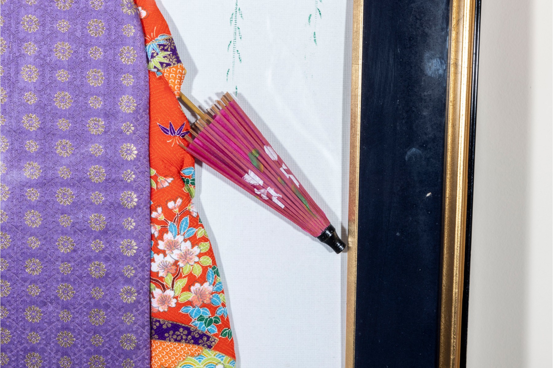 A traditional Japanese Oshie (Oshi-e), a form of Japanese handicraft originating from the Edo period. Built in layers, each piece is wrapped in beautiful kimono fabric or paper, padded with cotton in between, and is nailed/glued together to create a three-dimensional work of art. The background is hand-drawn in mixed media paper -- unsigned and presented in a wood shadow-box frame with a glass facing.