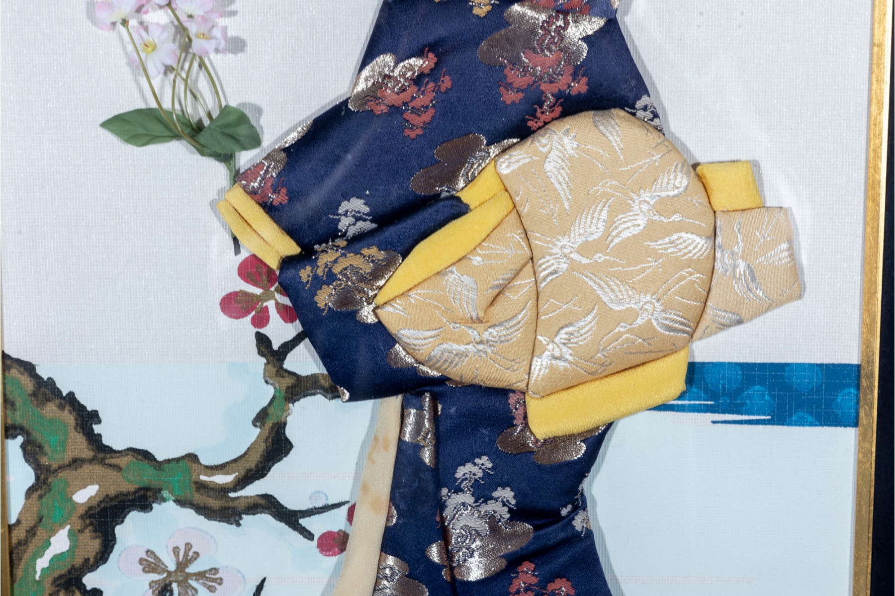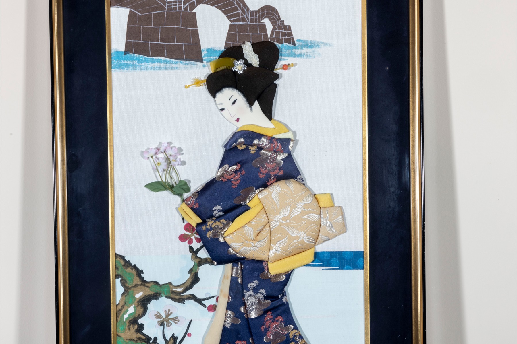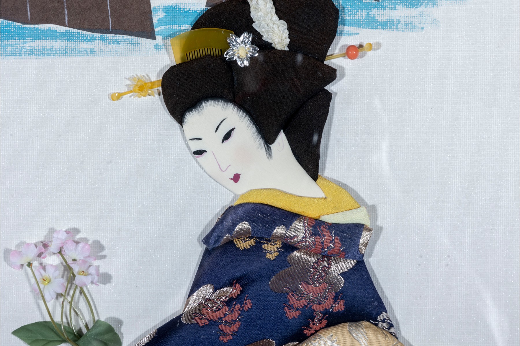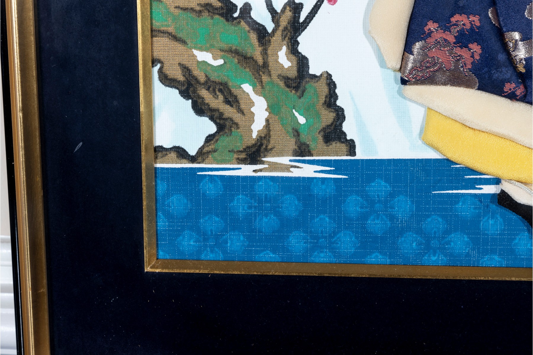 A traditional Japanese Oshie (Oshi-e), a form of Japanese handicraft originating from the Edo period. Built in layers, each piece is wrapped in beautiful kimono fabric or paper, padded with cotton in between, and is nailed/glued together to create a three-dimensional work of art. The background is hand-drawn in mixed media paper -- unsigned and presented in a wood shadow-box frame with a glass facing.