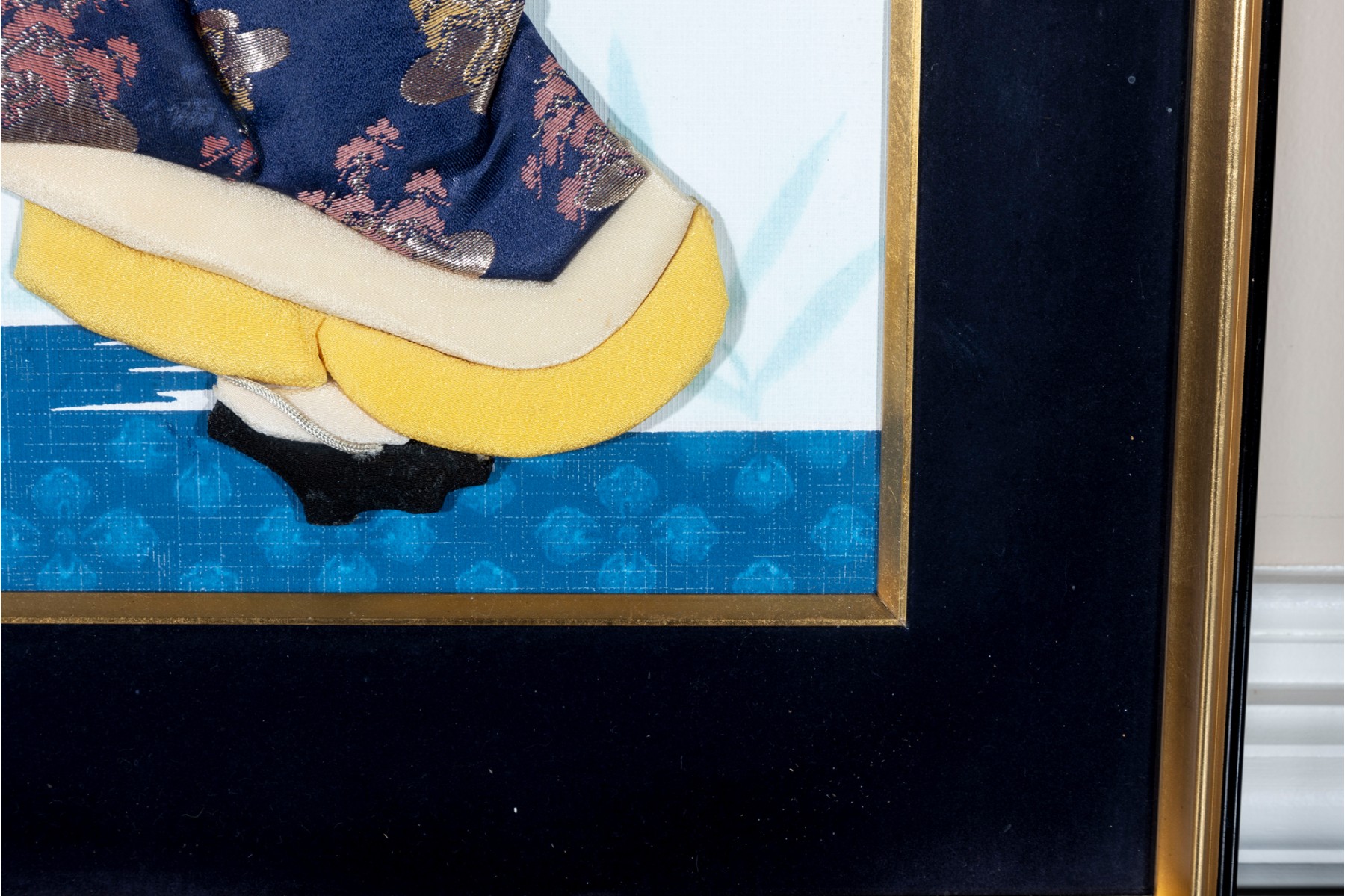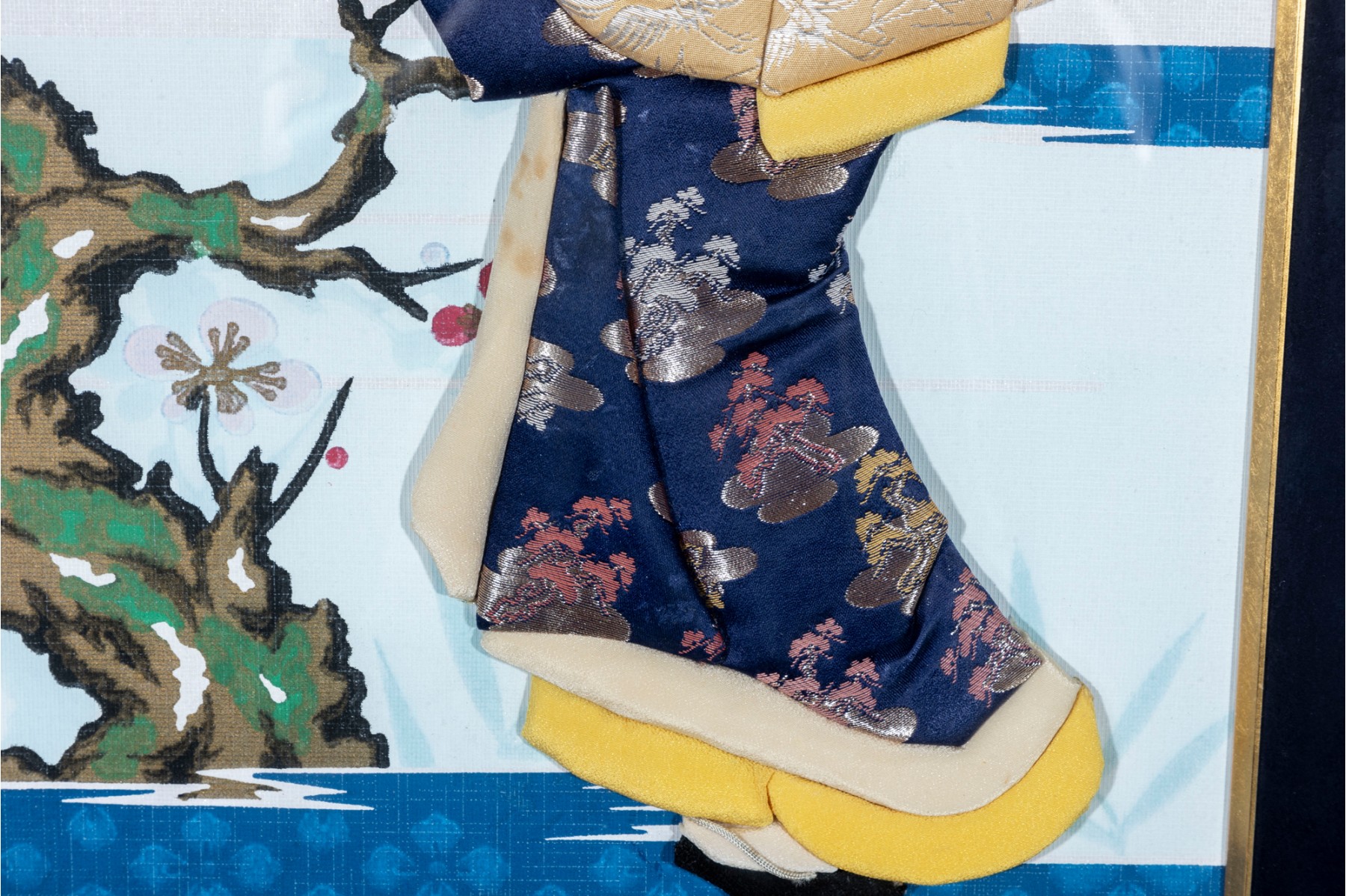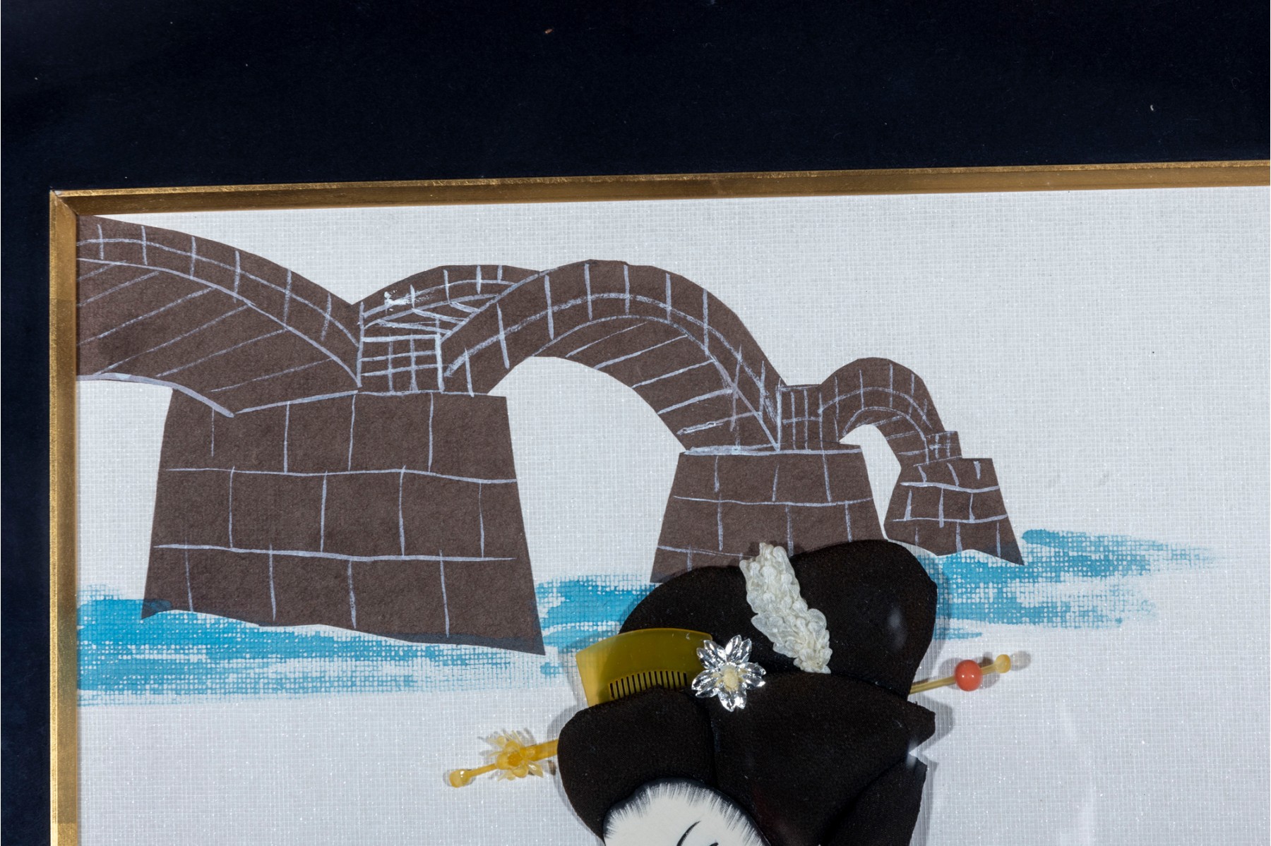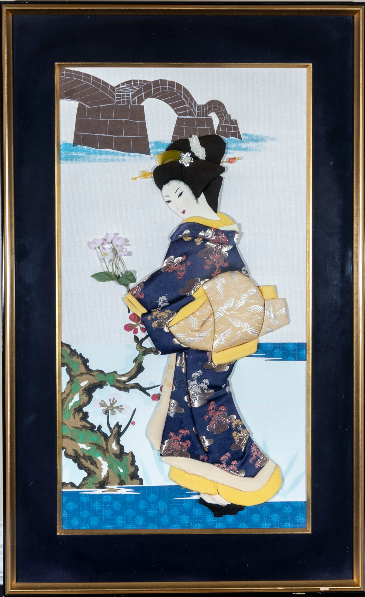 A traditional Japanese Oshie (Oshi-e), a form of Japanese handicraft originating from the Edo period. Built in layers, each piece is wrapped in beautiful kimono fabric or paper, padded with cotton in between, and is nailed/glued together to create a three-dimensional work of art. The background is hand-drawn in mixed media paper -- unsigned and presented in a wood shadow-box frame with a glass facing.