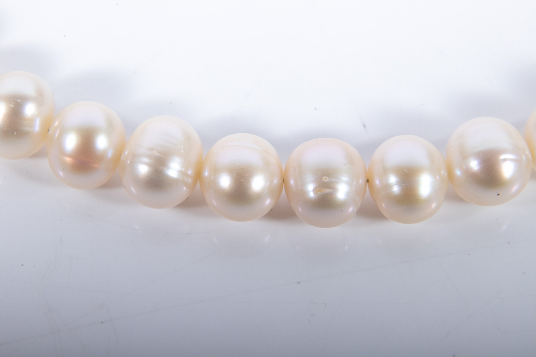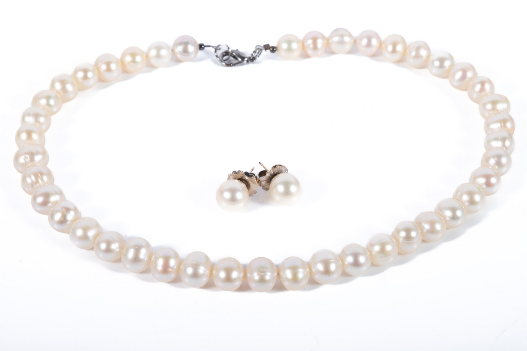 A classy cultured pearl necklace displaying large, warm white, ringed pear pearls with soft iridescent hues of pink, purple, and green. Accompanied by a complimenting pair of round pearl studs with yellow gold posts.