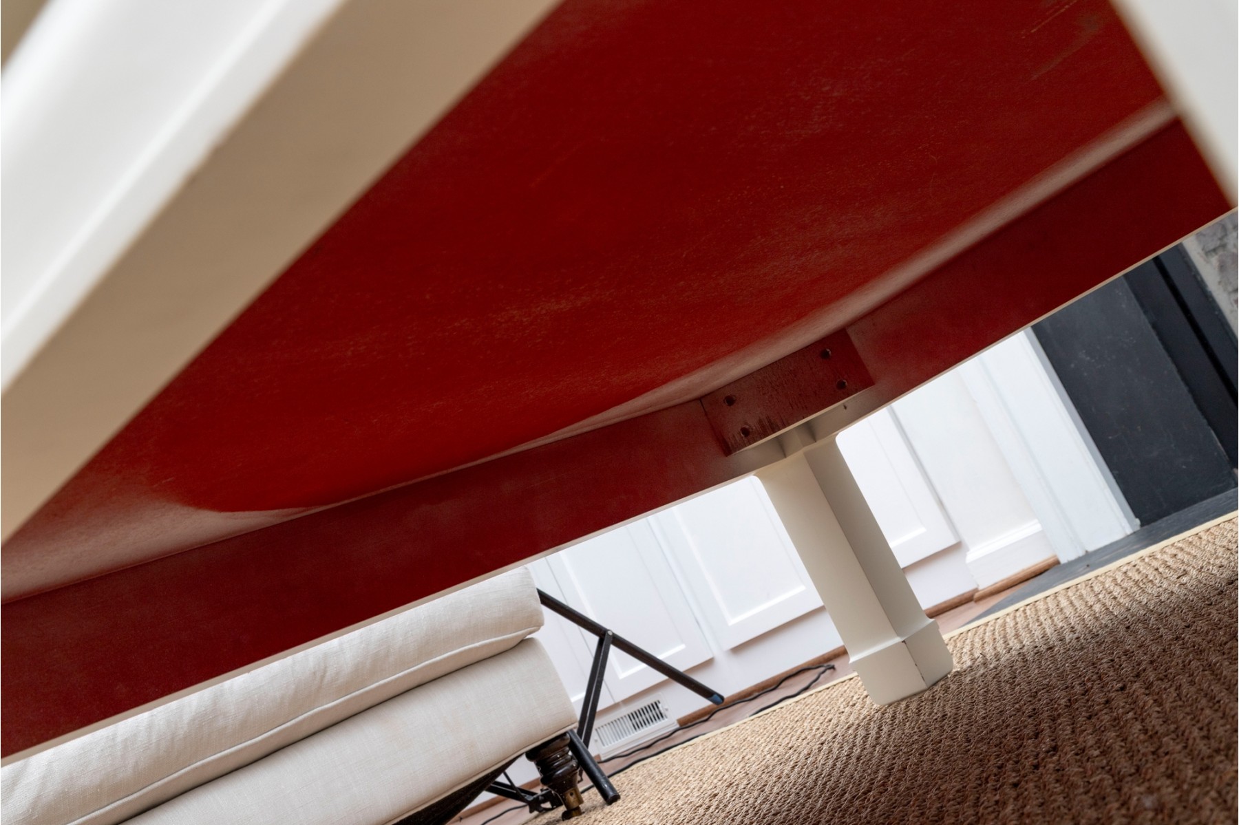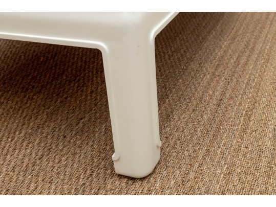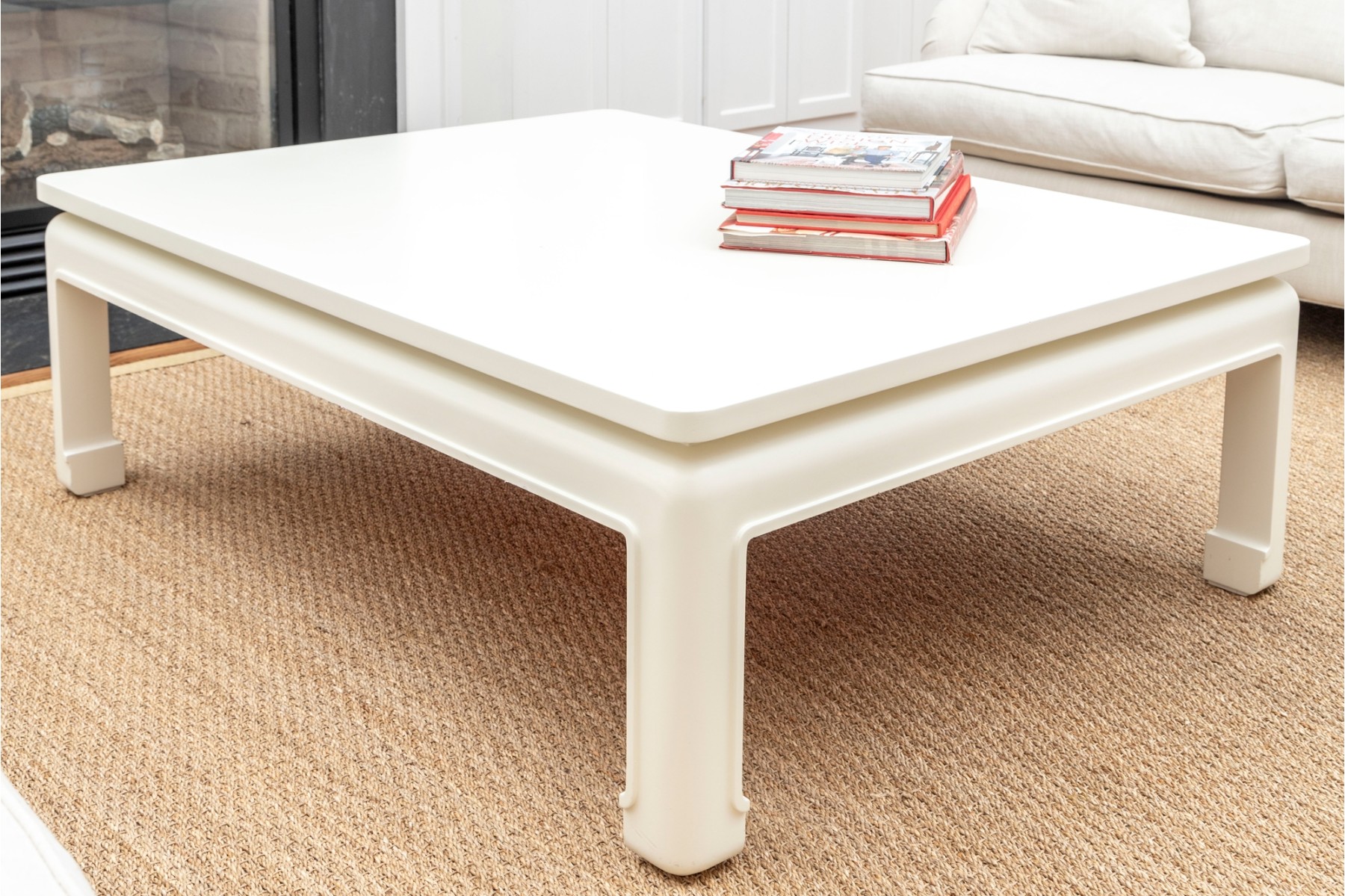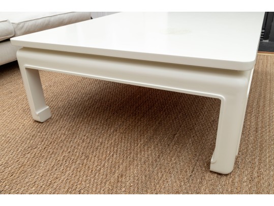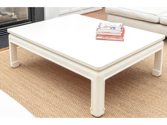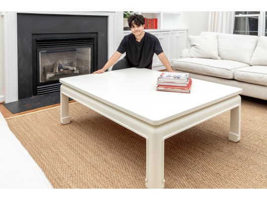 An oversized coffee table in the Ming style -- wood construction, painted white with subtle curves and facets that makes this table an alluring centerpiece for any lounge space.