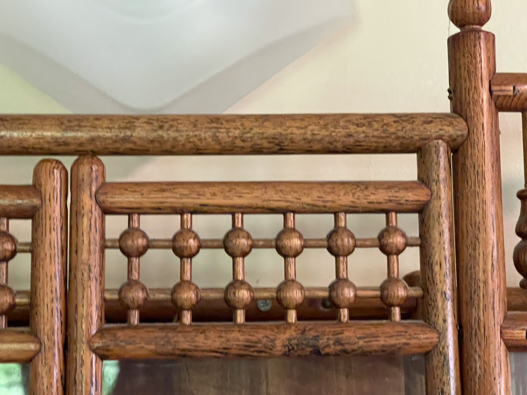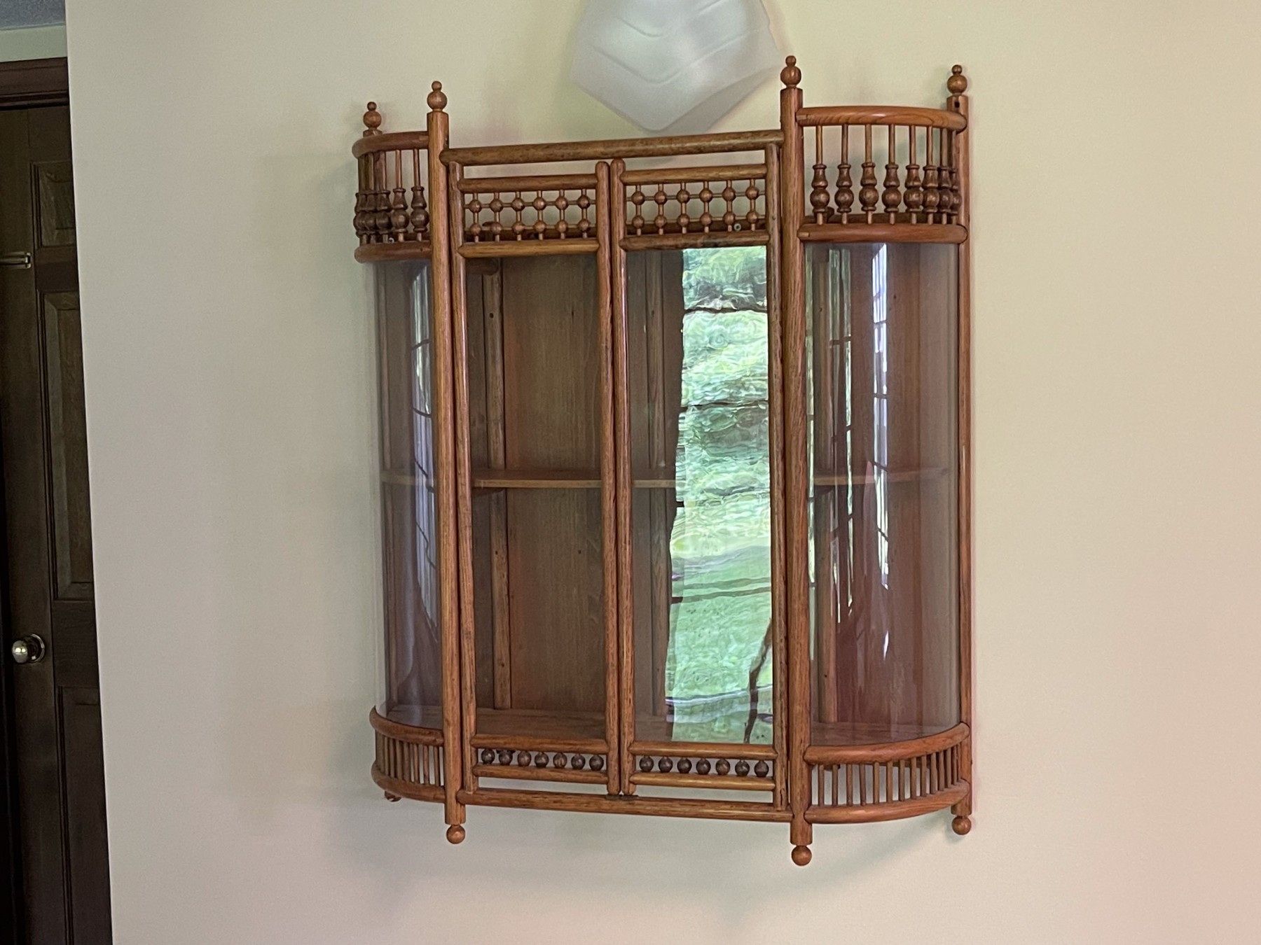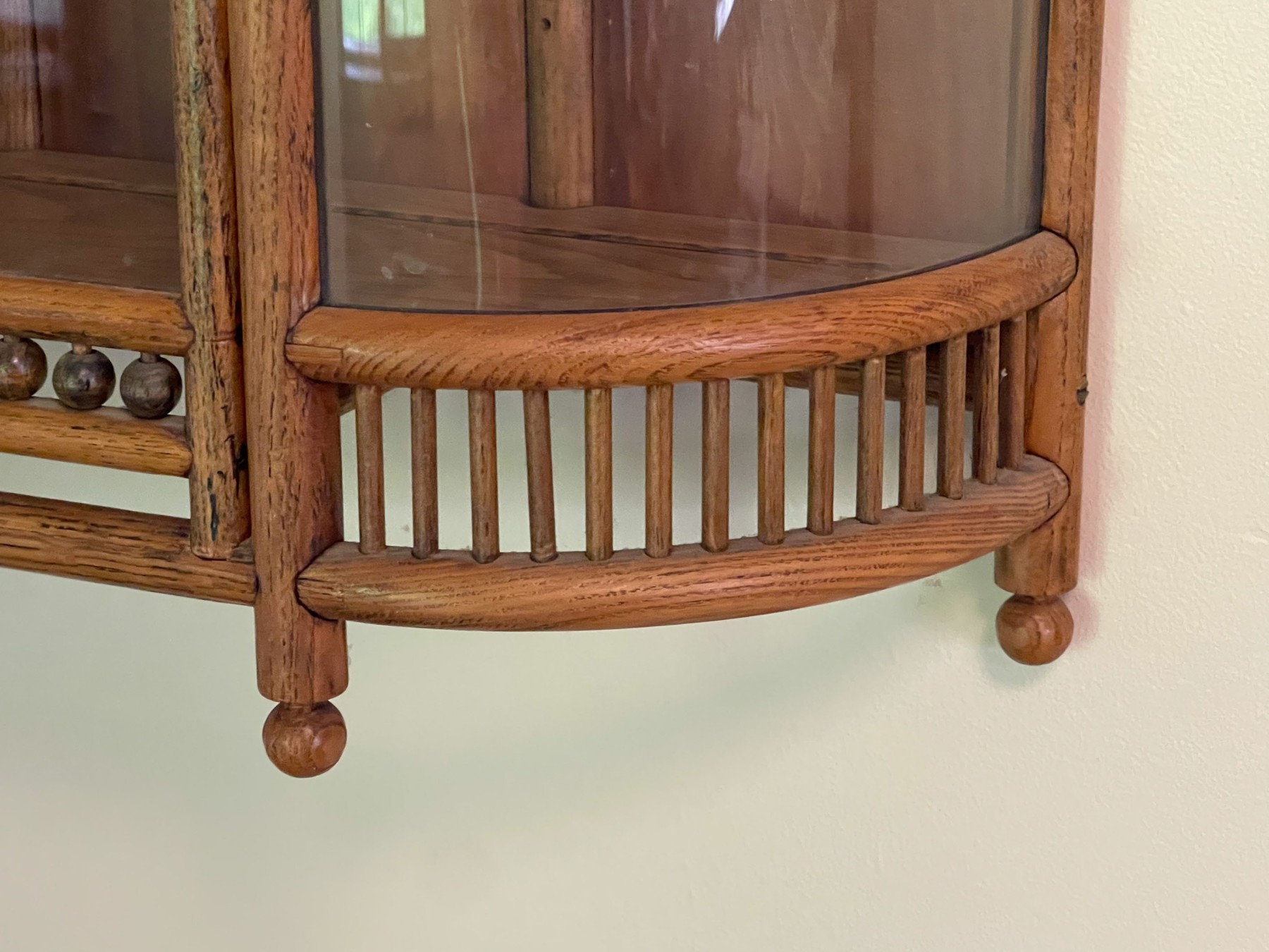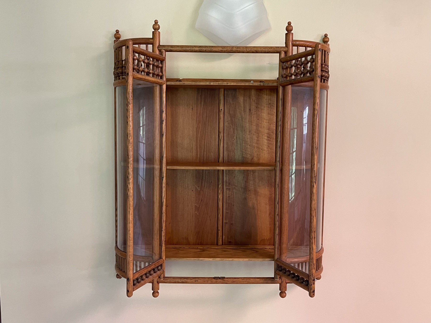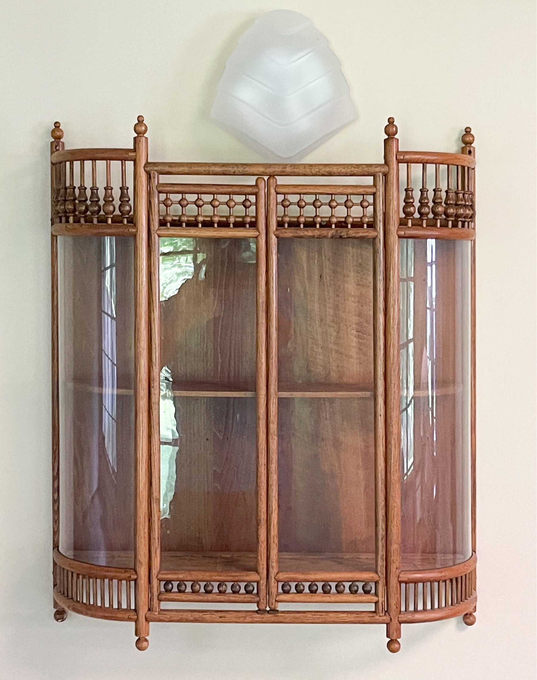 Fabulous oak stick and ball, hanging cabinet having rounded glass sides flanking glass front double doors, opening to two shelves.