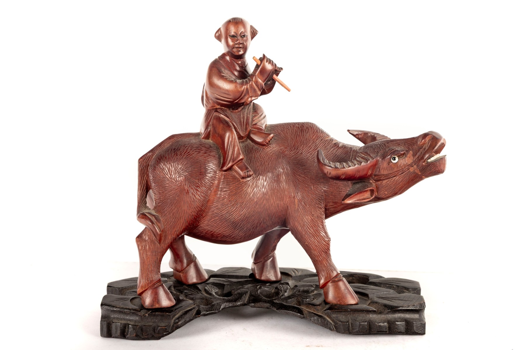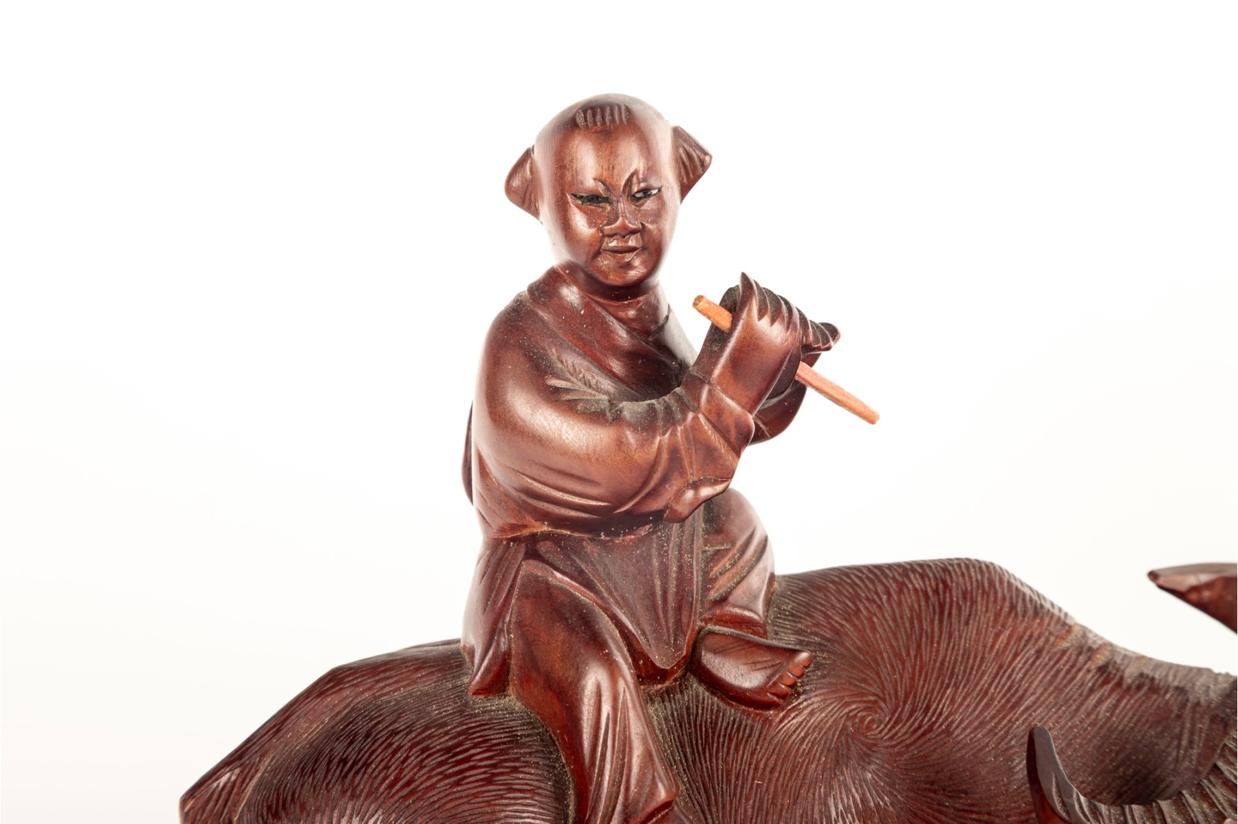 A finely detailed late 19th century example; A carved wood, Chinese sculpture depicting an elder figure seated atop a water buffalo. The elder holds a flute in the form of a removable wooden pick.