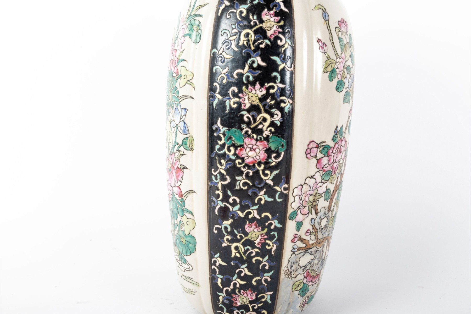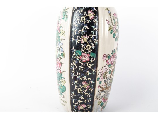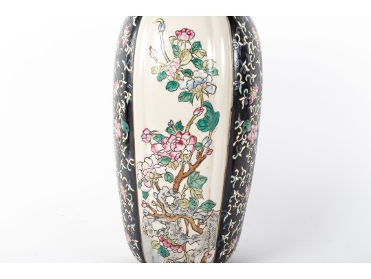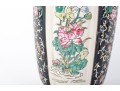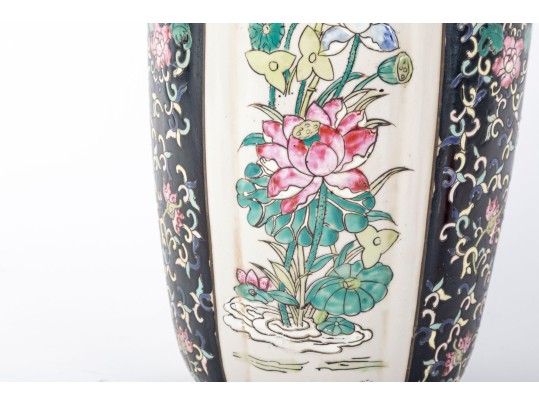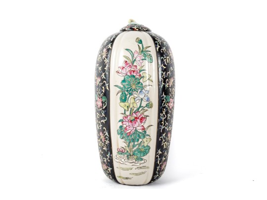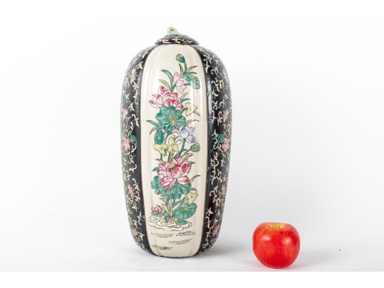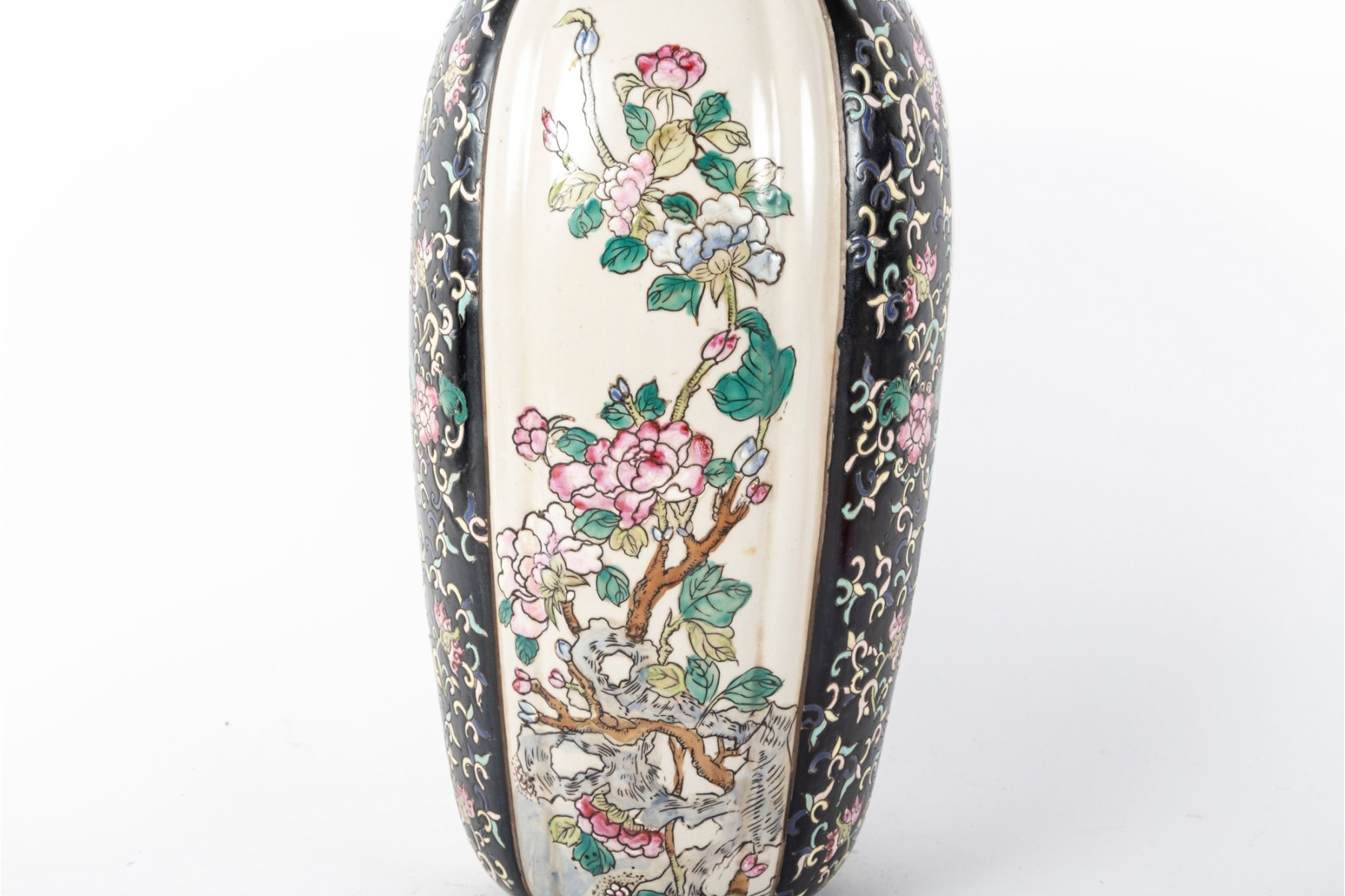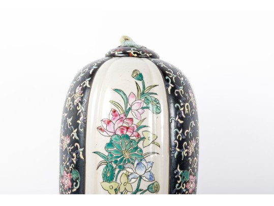 A 19th-century lidded porcelain vase with a tapered, elongated form, featuring alternating panels of intricate floral motifs. The primary design showcases finely hand-painted pink and blue blossoms with green foliage on a cream-colored background, framed by contrasting black panels indicative of Famille Noire.