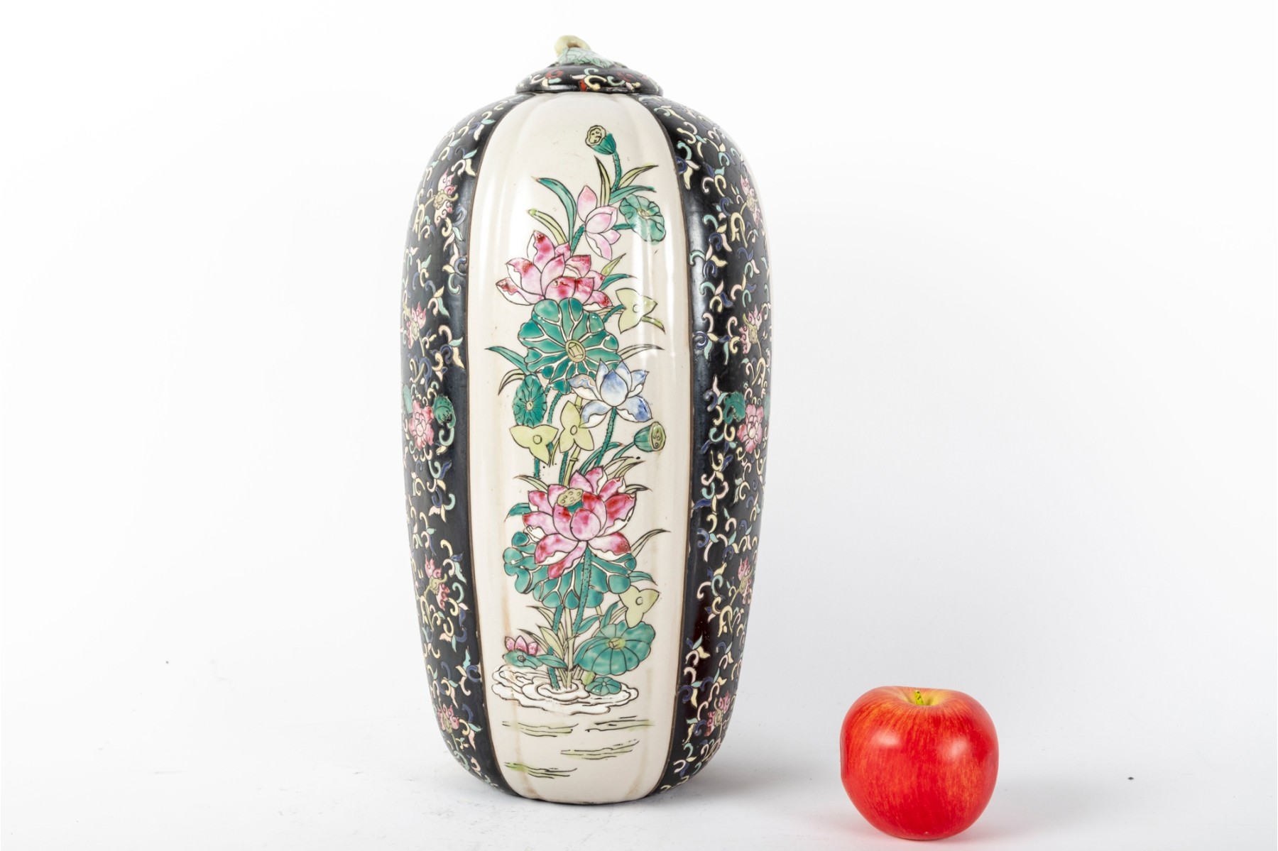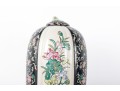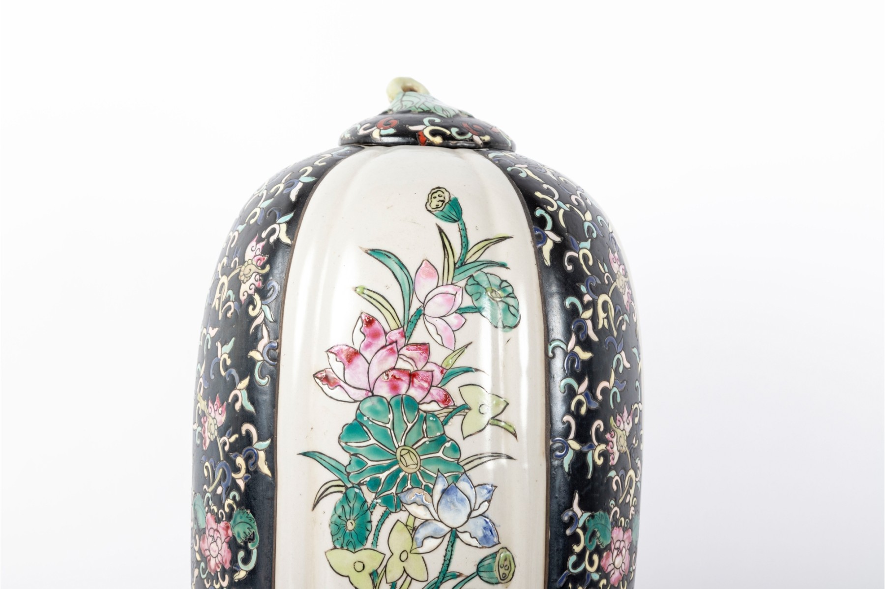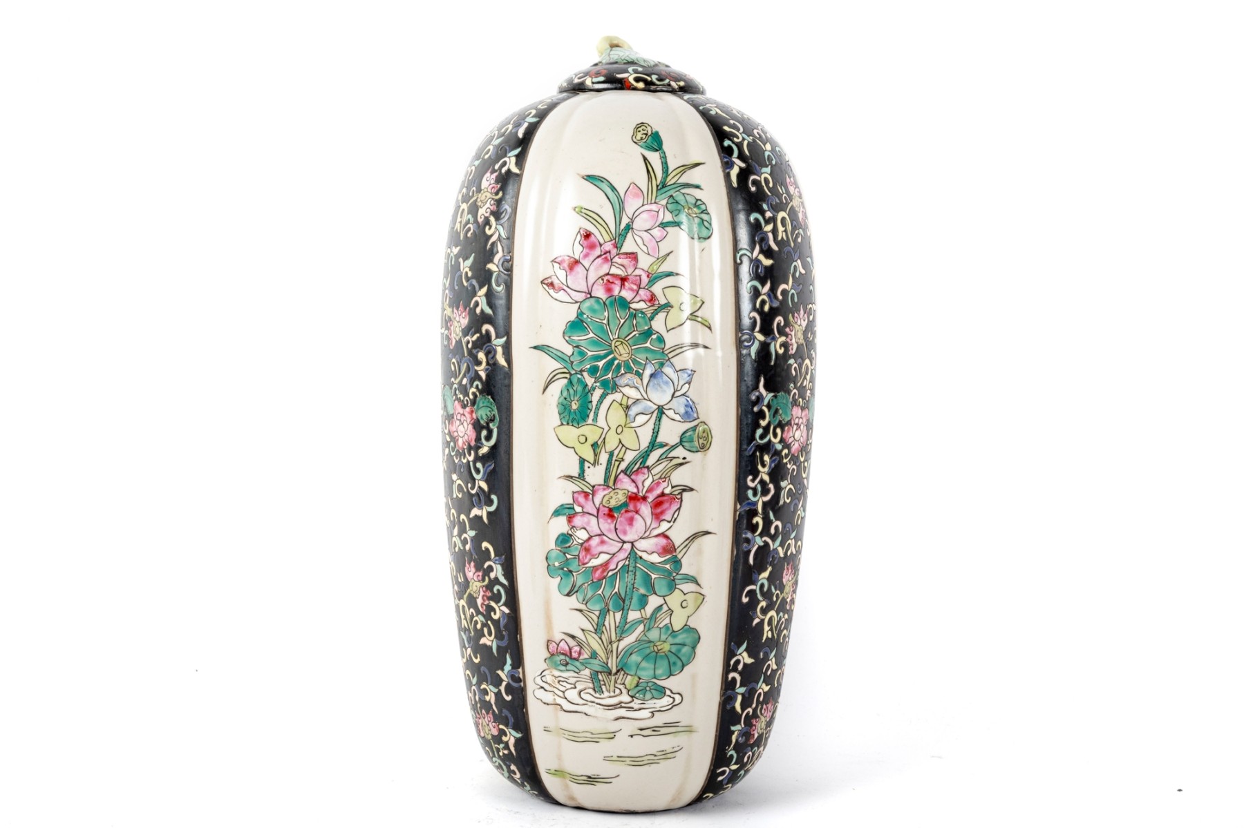 A 19th-century lidded porcelain vase with a tapered, elongated form, featuring alternating panels of intricate floral motifs. The primary design showcases finely hand-painted pink and blue blossoms with green foliage on a cream-colored background, framed by contrasting black panels indicative of Famille Noire.
