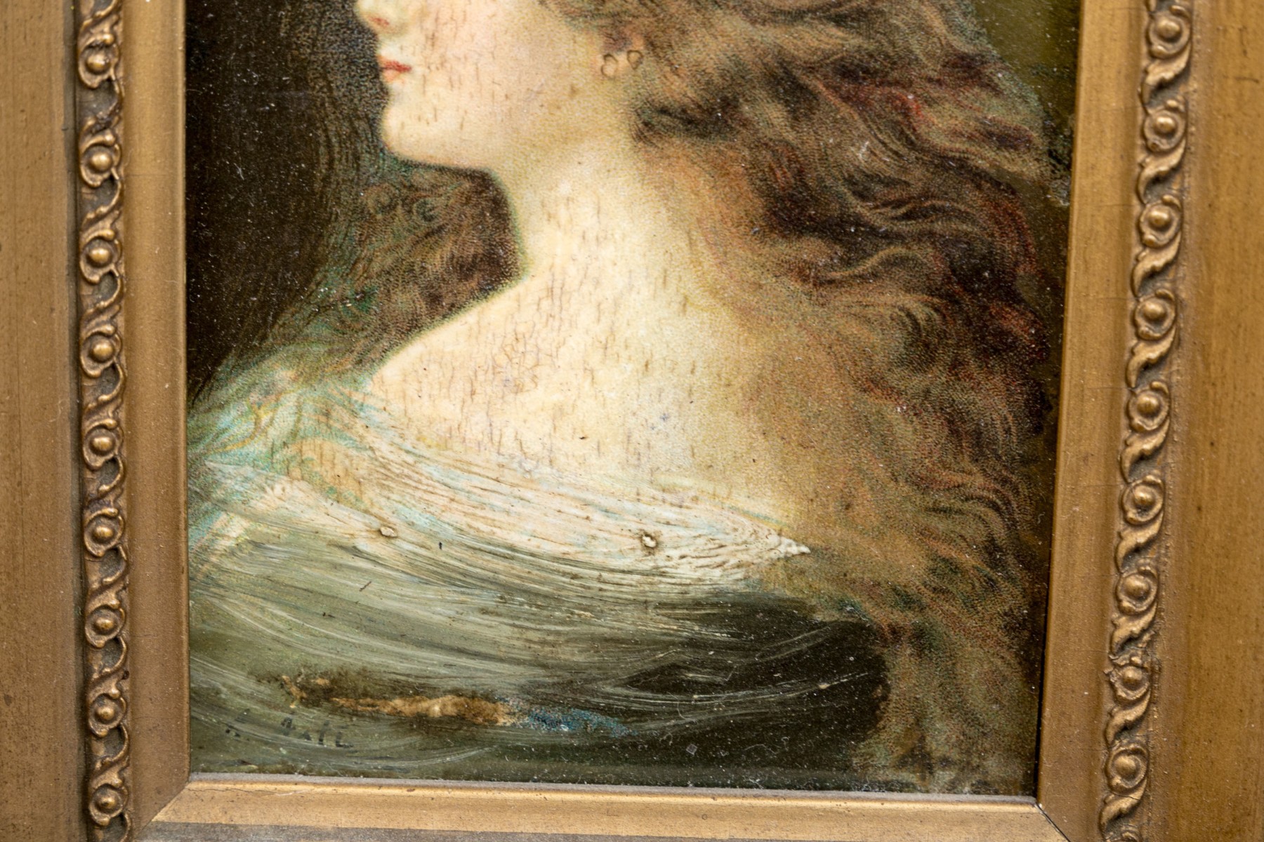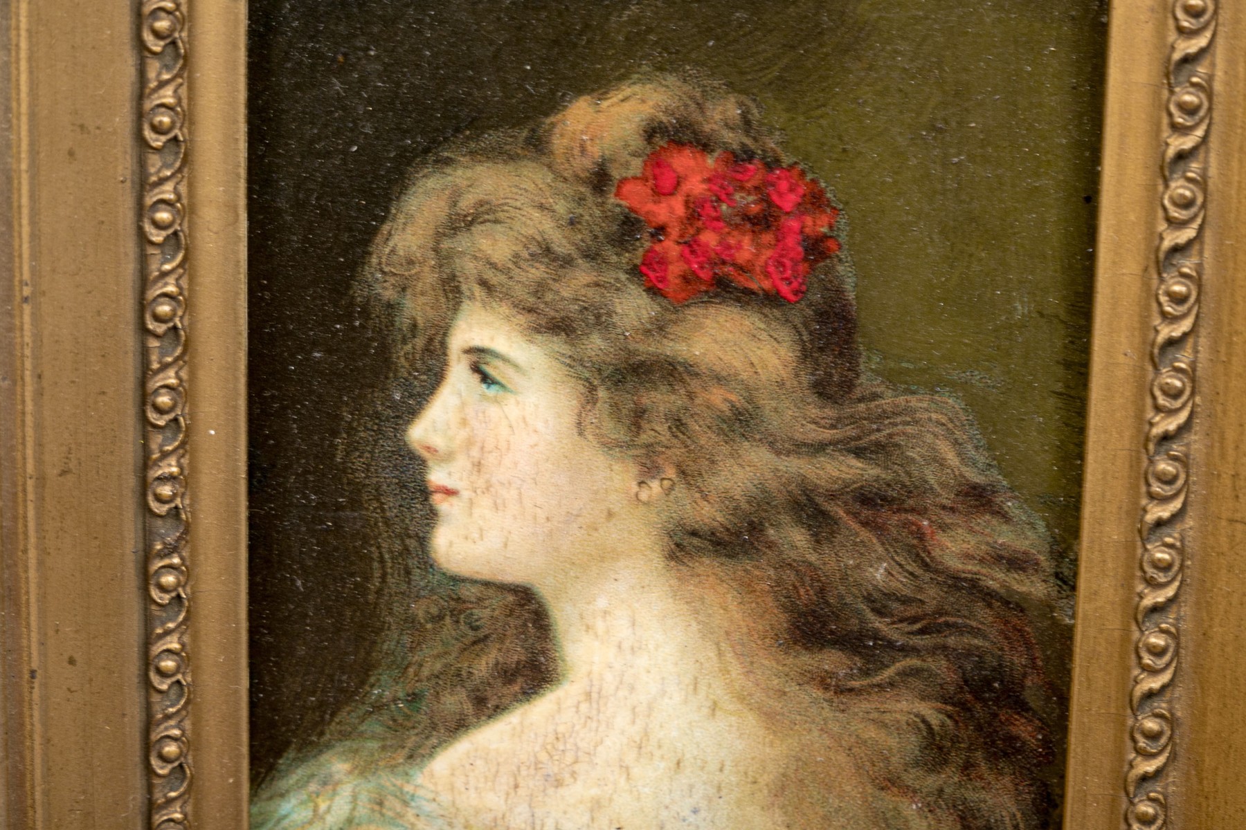 Late 19th-Century Continental oil on panel showcasing a portrait of red headed beauty in profile. Unsigned. Mounted in a period frame.