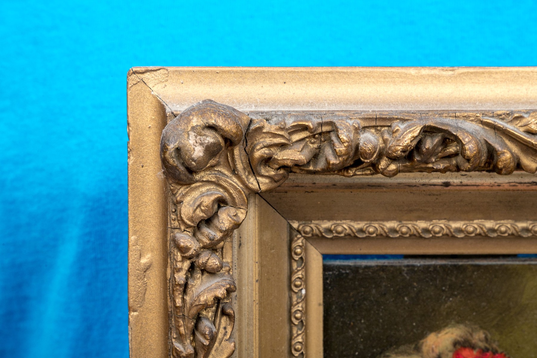 Condition: Frame shows wear commensurate with age with cracks and losses. Painting retains original beauty.