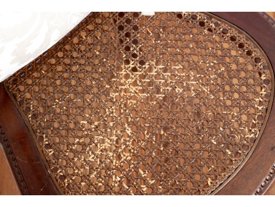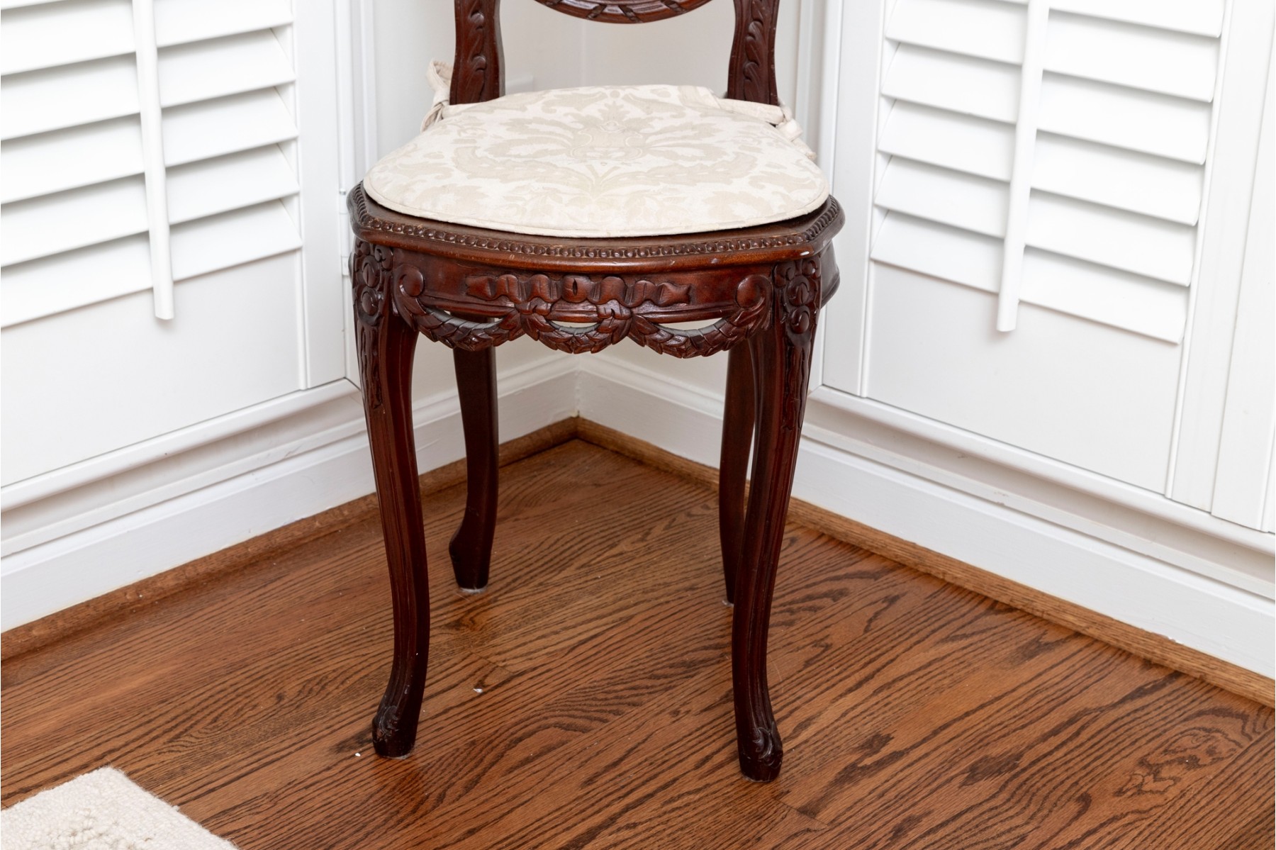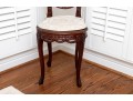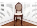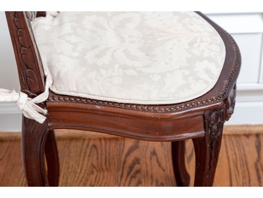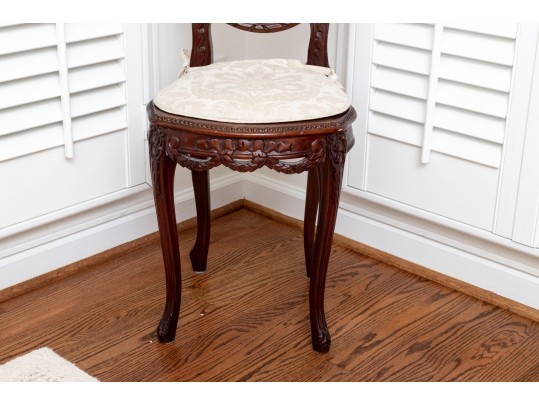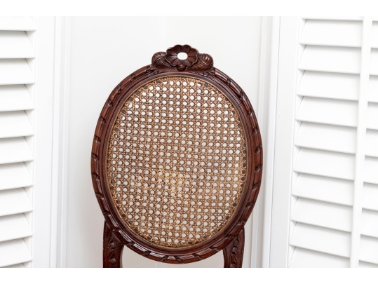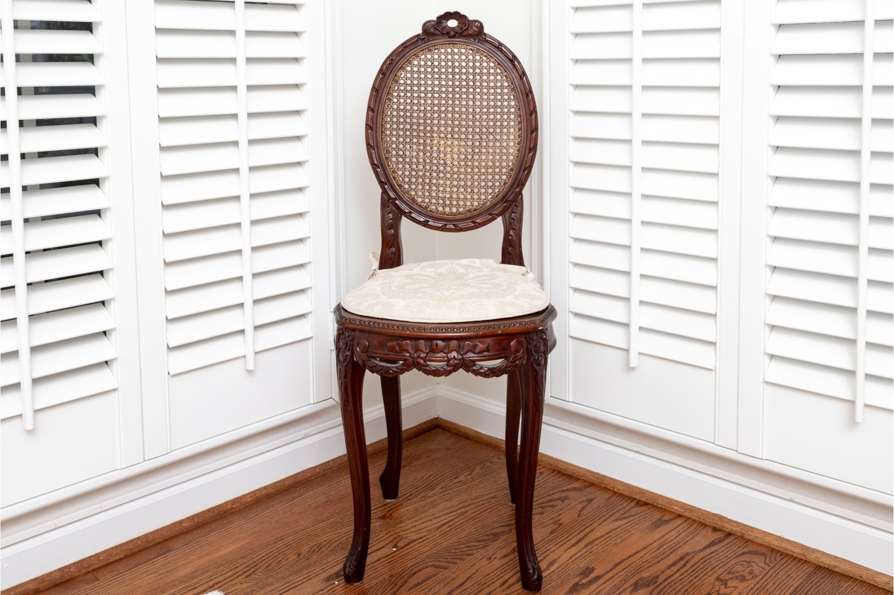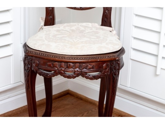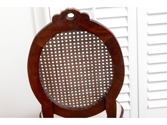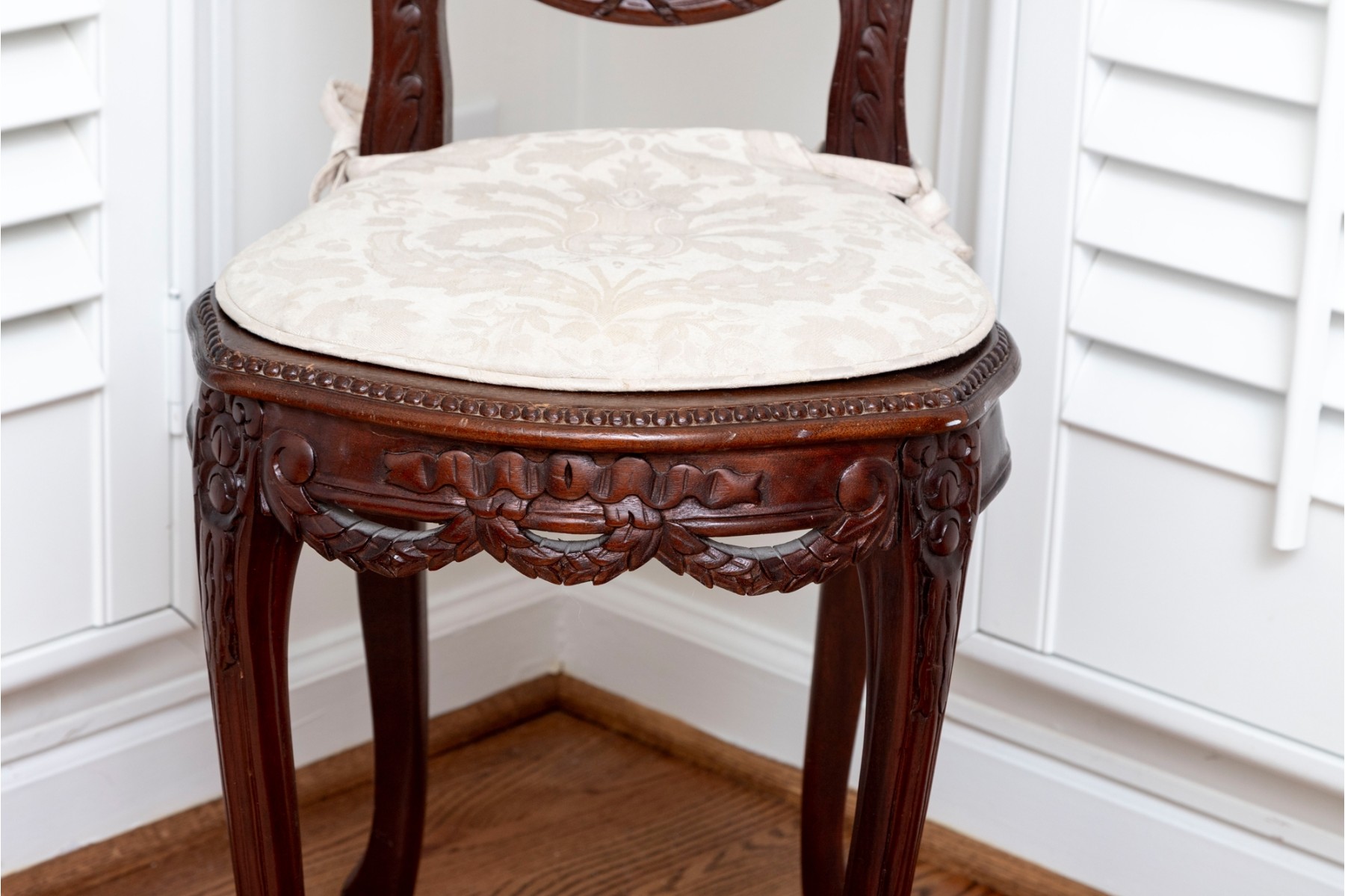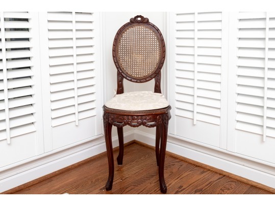 This elegant, late 19th century vanity chair is reminiscent of French Louis XVI style, characterized by its refined silhouette, intricate carvings, and neoclassical influences that extend around a cane back and seat. White cushion pad included.