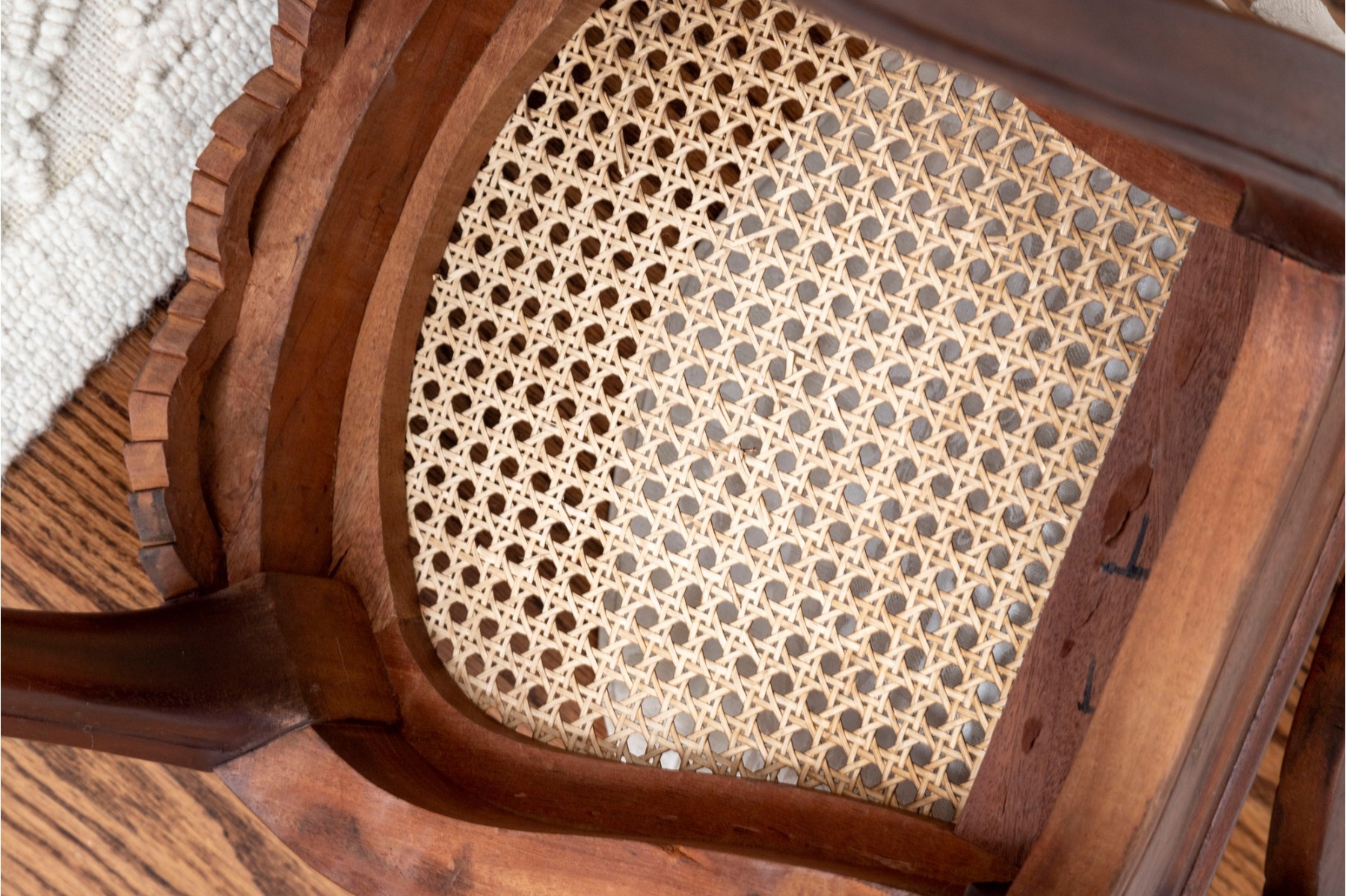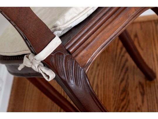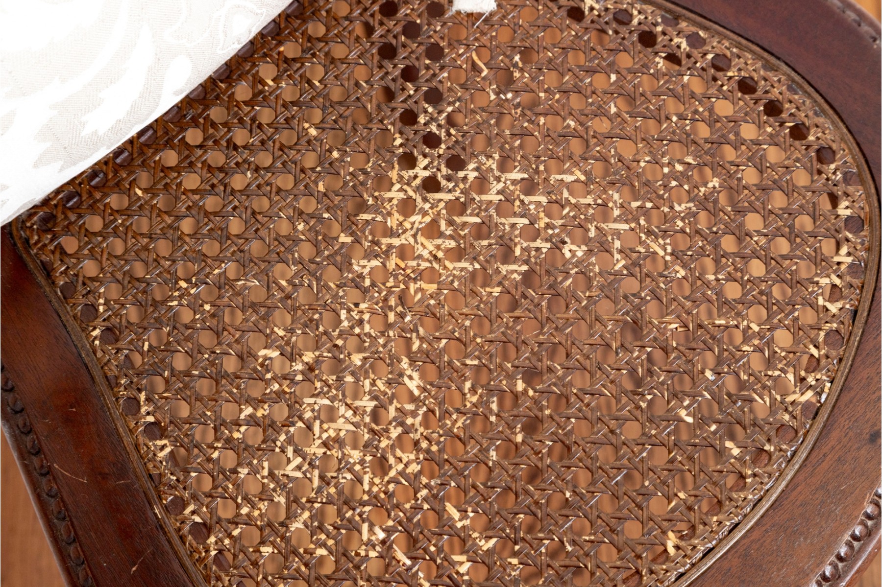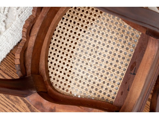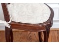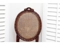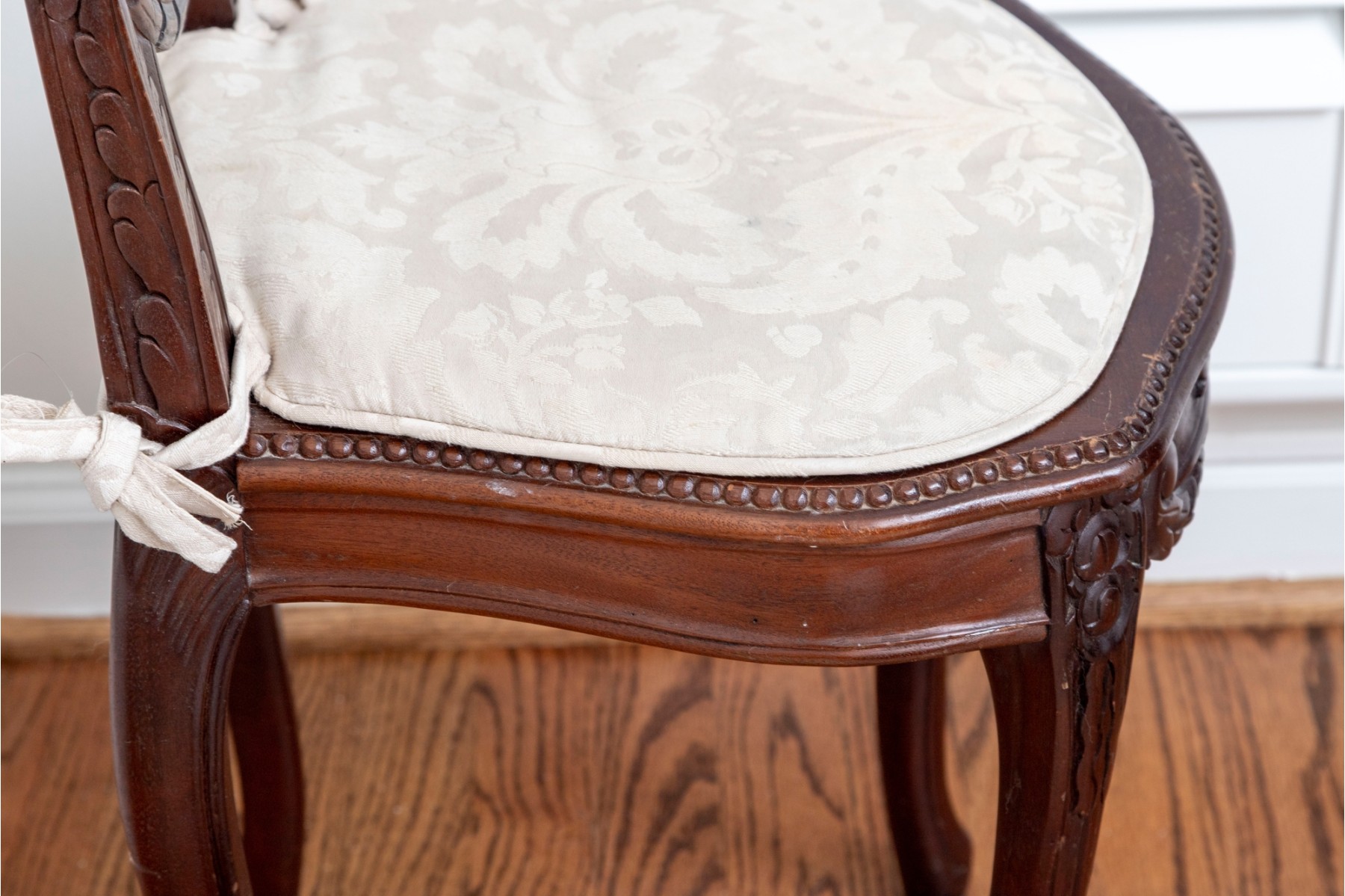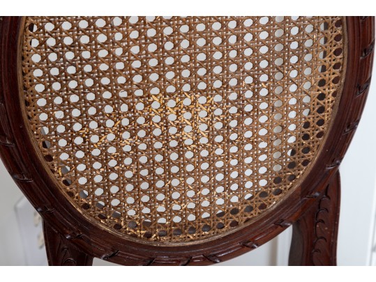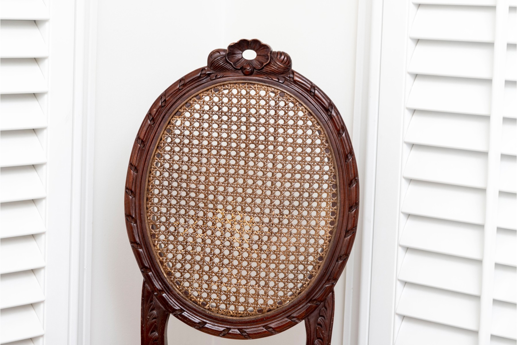 This elegant, late 19th century vanity chair is reminiscent of French Louis XVI style, characterized by its refined silhouette, intricate carvings, and neoclassical influences that extend around a cane back and seat. White cushion pad included.
