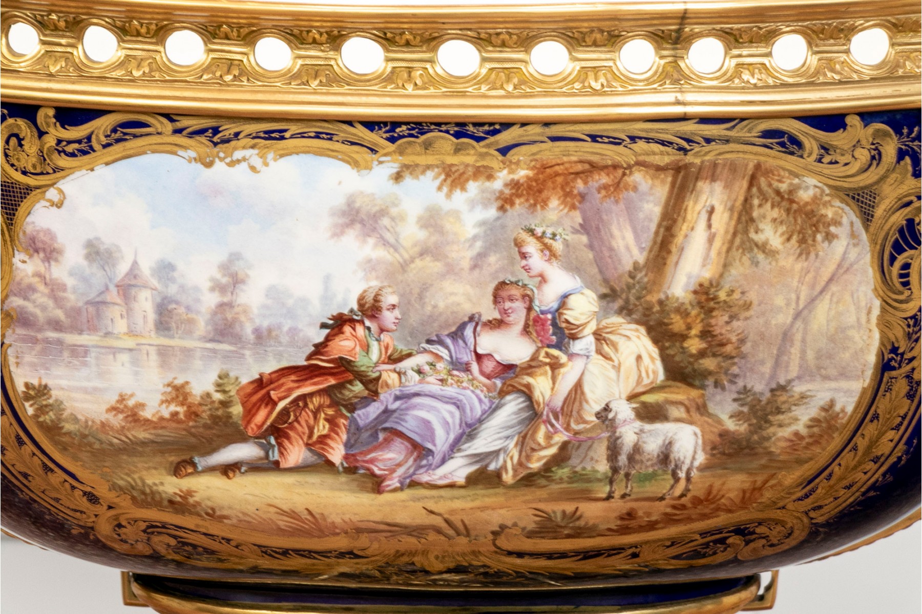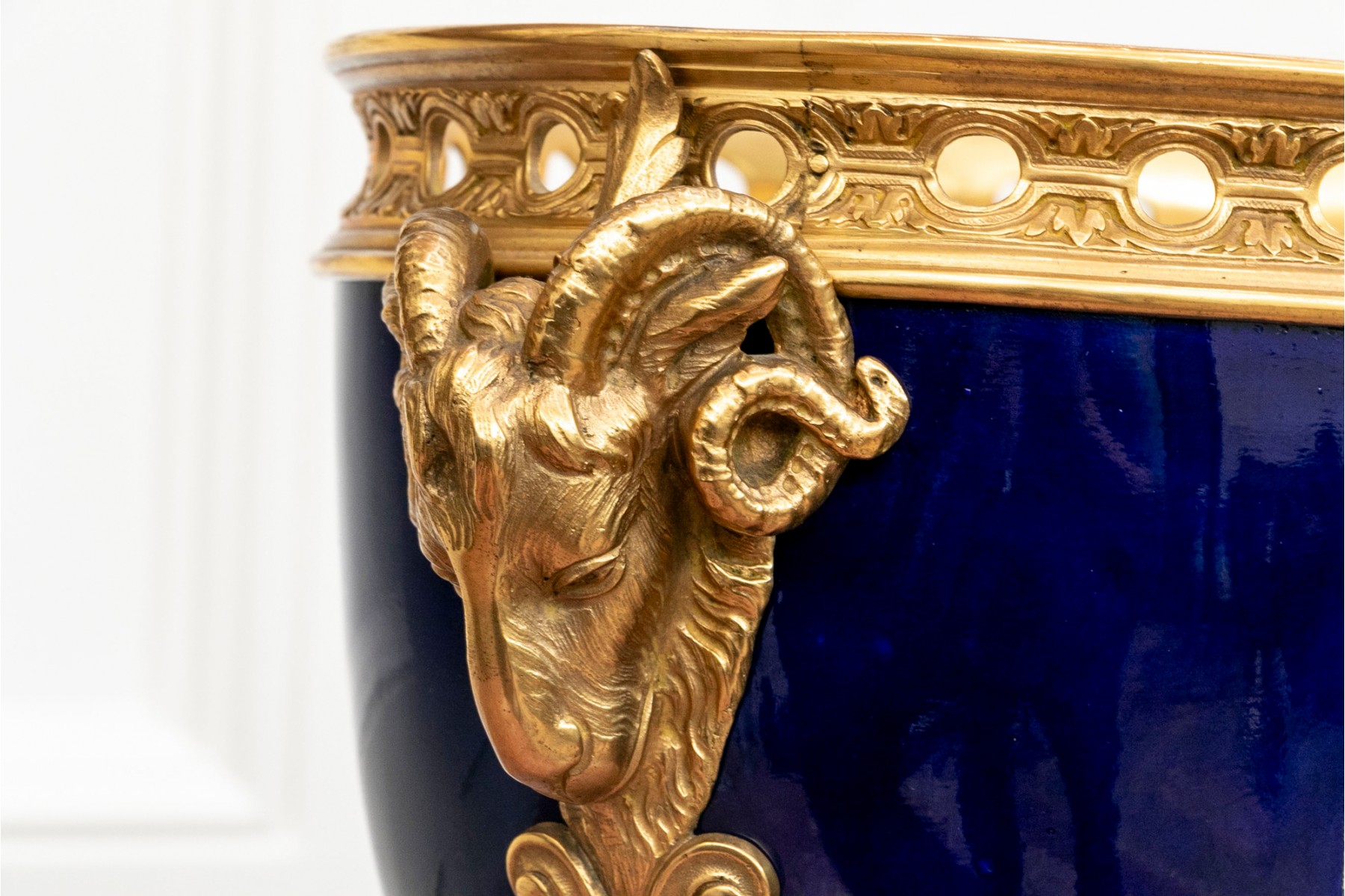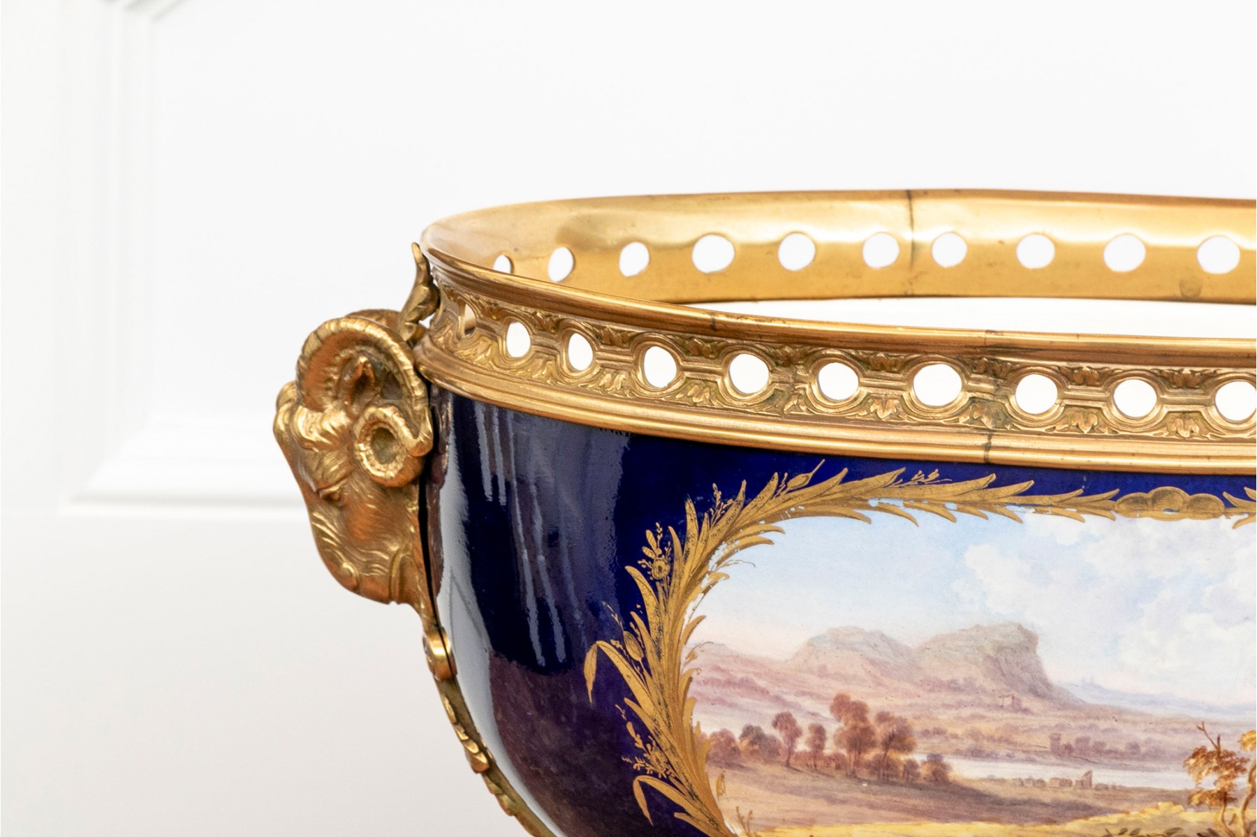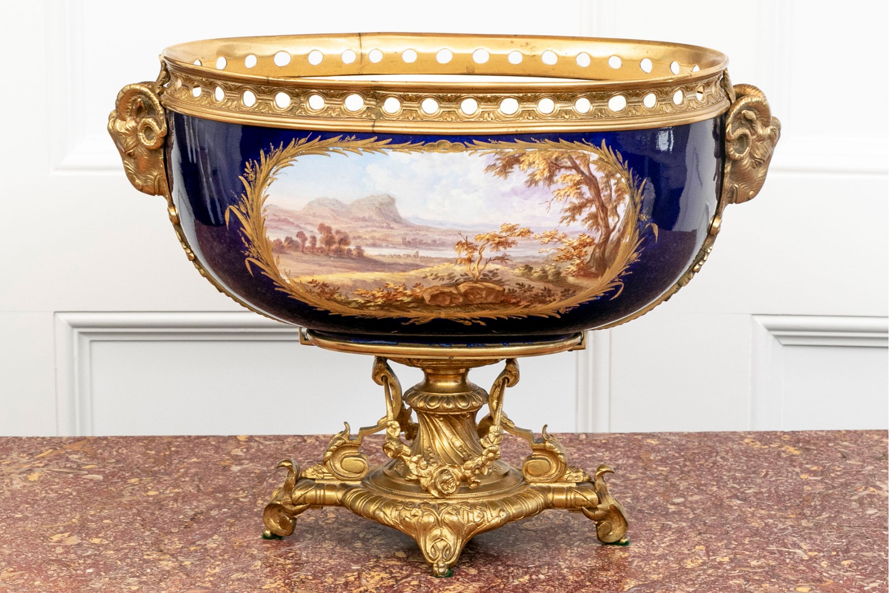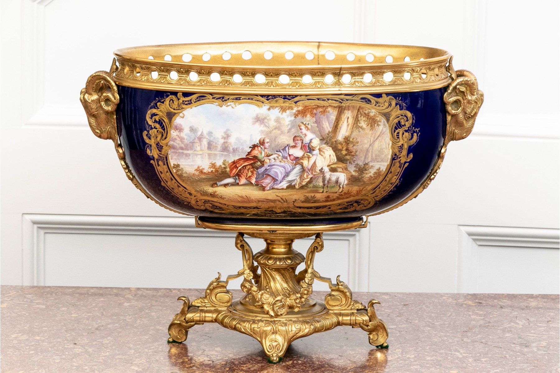 Late 19th-century ormolu-mounted Sevres-style porcelain cobalt-blue ground footed bowl, featuring hand-painted figural scenes surrounded by thick gold encrusted foliate details. The piece is further adorned with well-cast foliate bronze mounts and elegant scrolled footed base, enhanced by brass ormolu Rams Heads on each side.