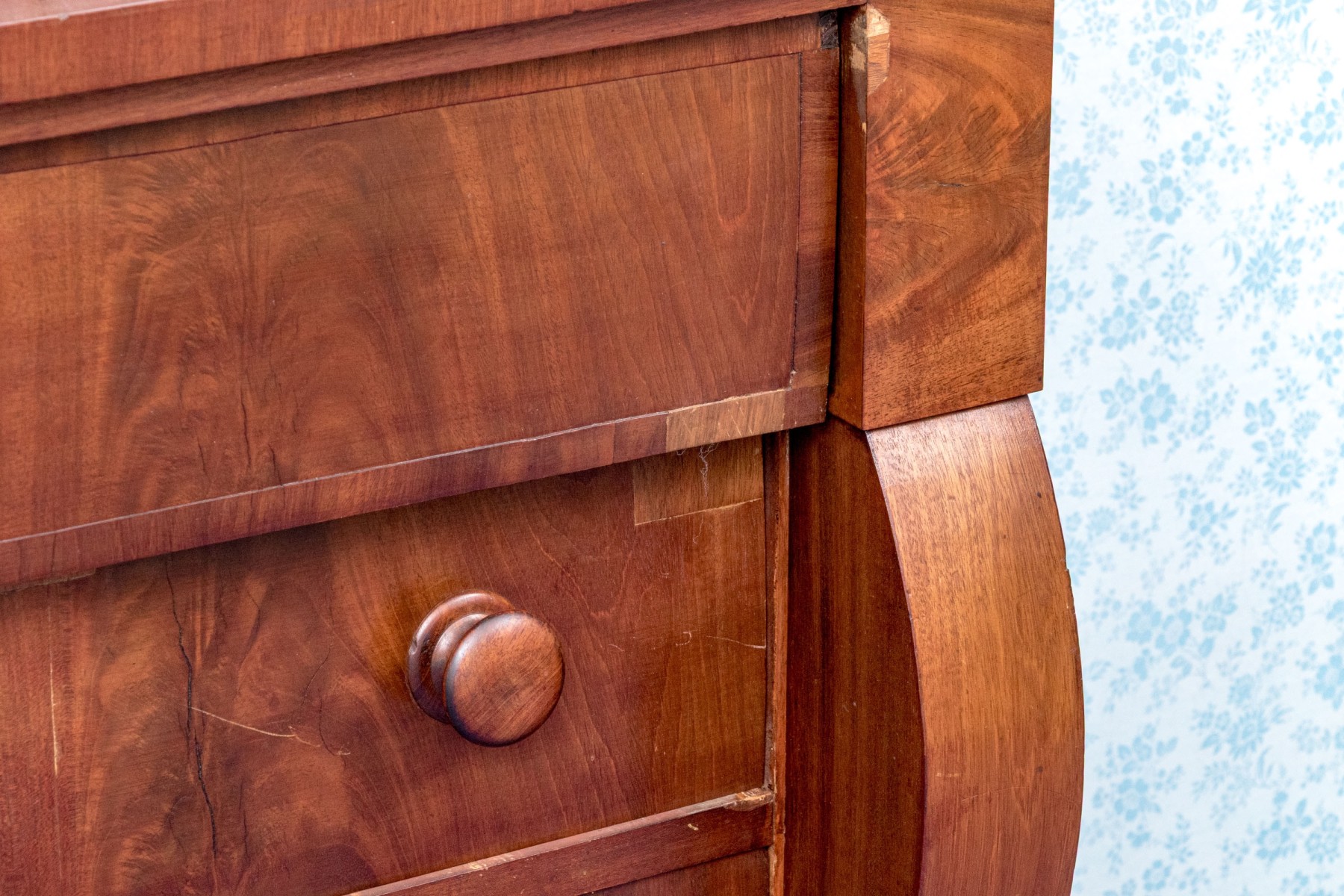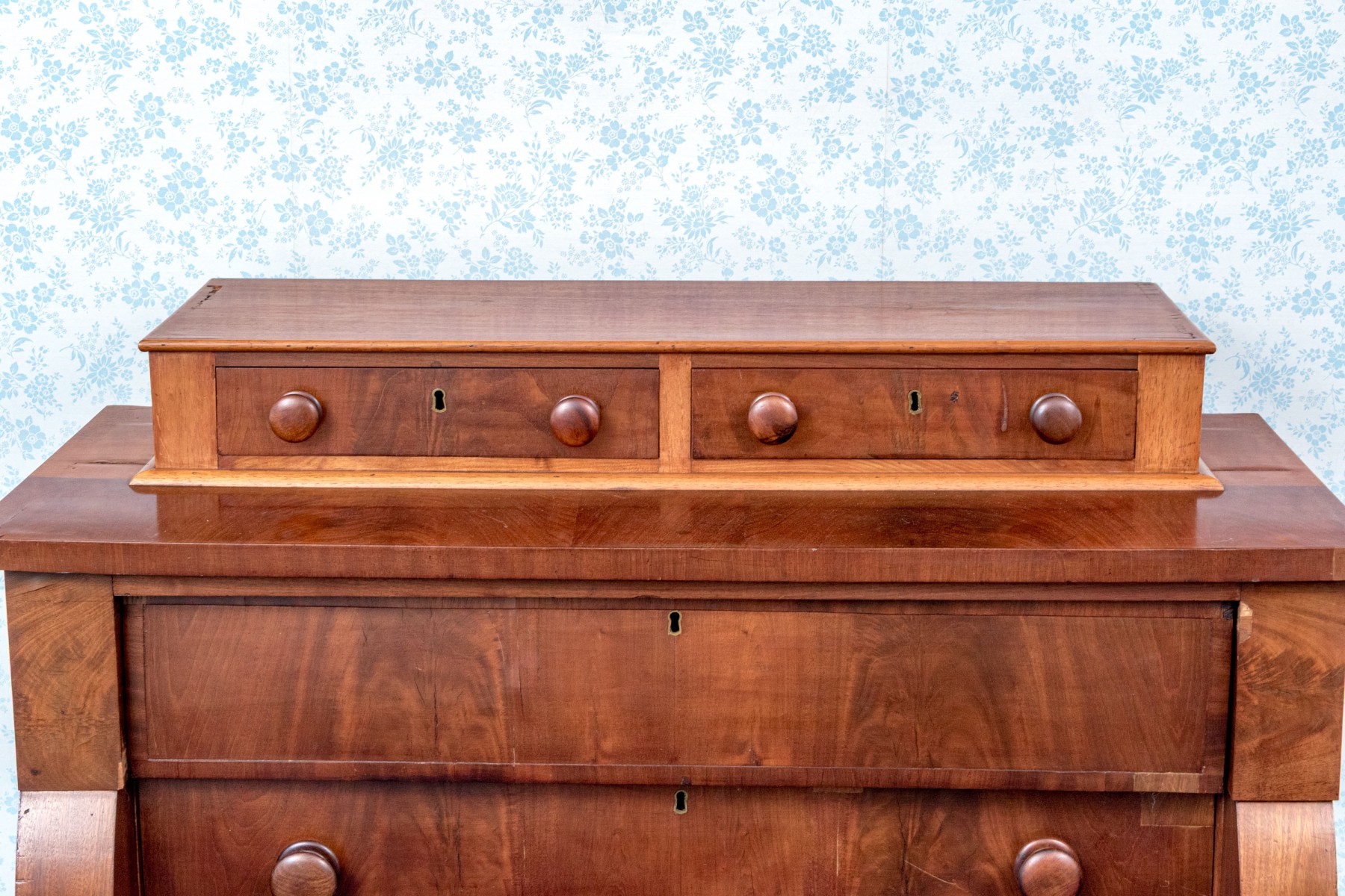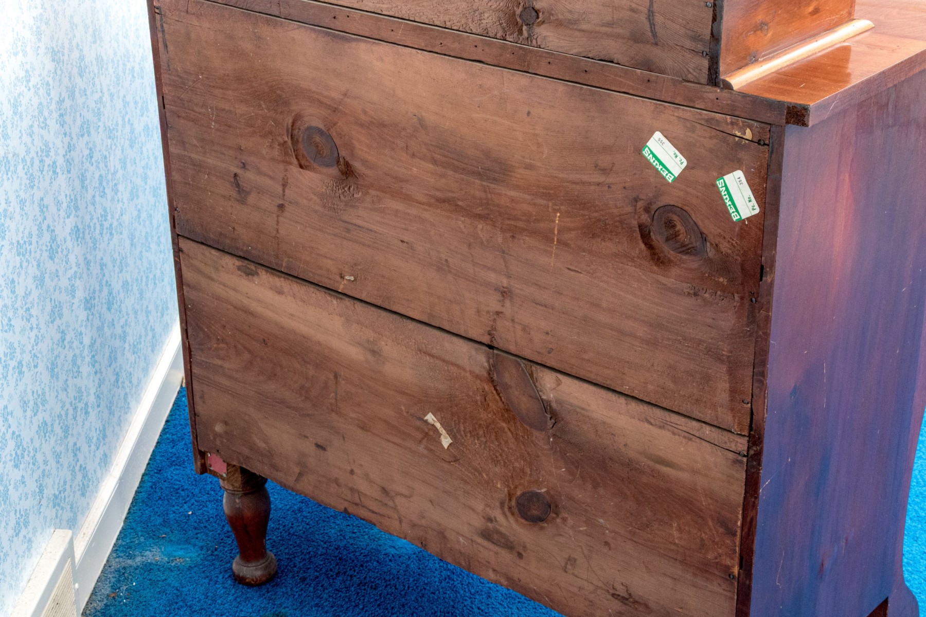 On front scrolled form legs with turned back legs. Case with four long drawers, three of which have knob pulls. Two drawers atop with pairs of knobs.