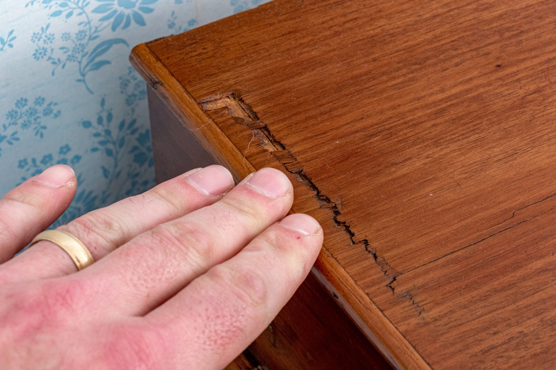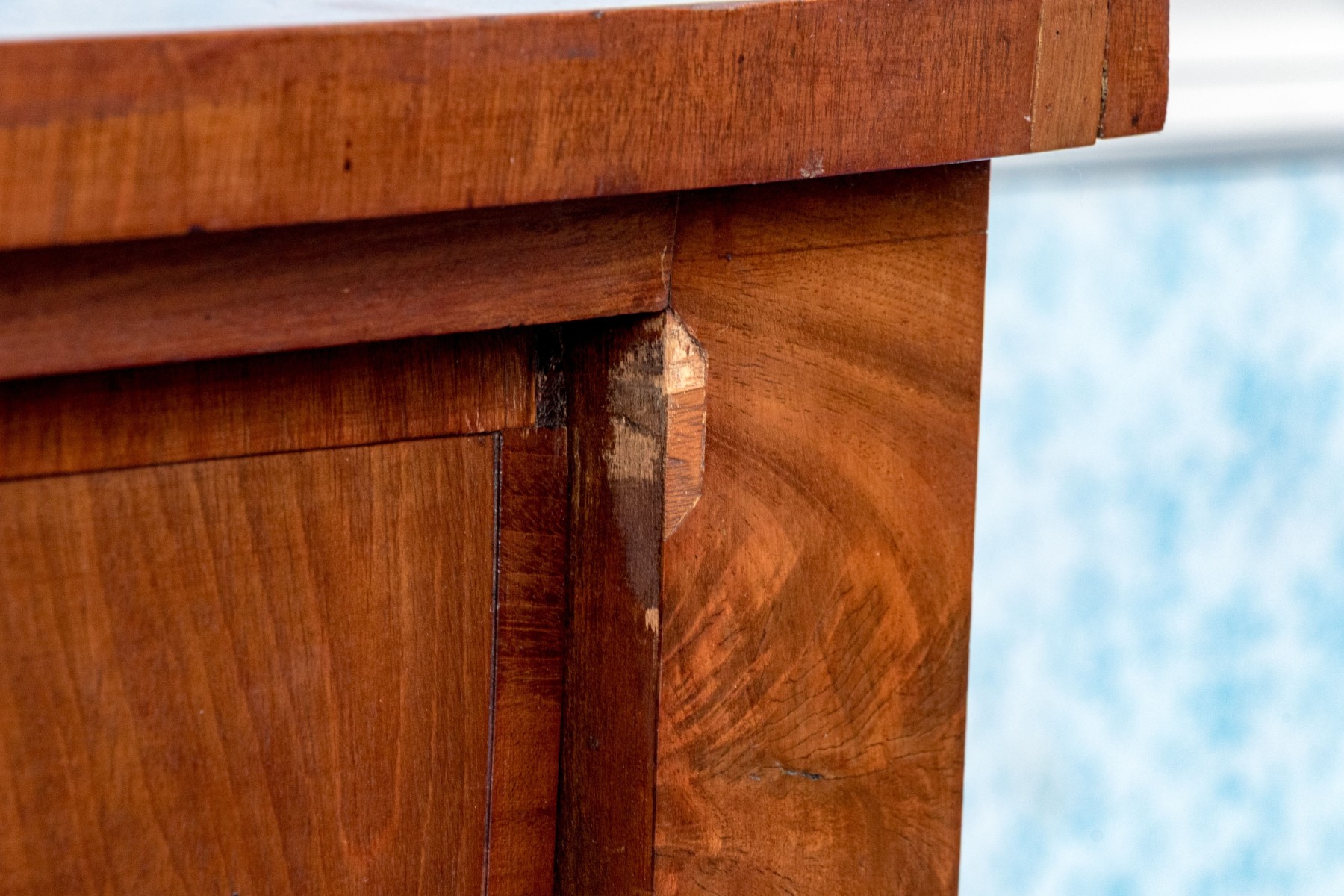 Losses to the veneer throughout and damage to the top. Back leg busted and needs attention.