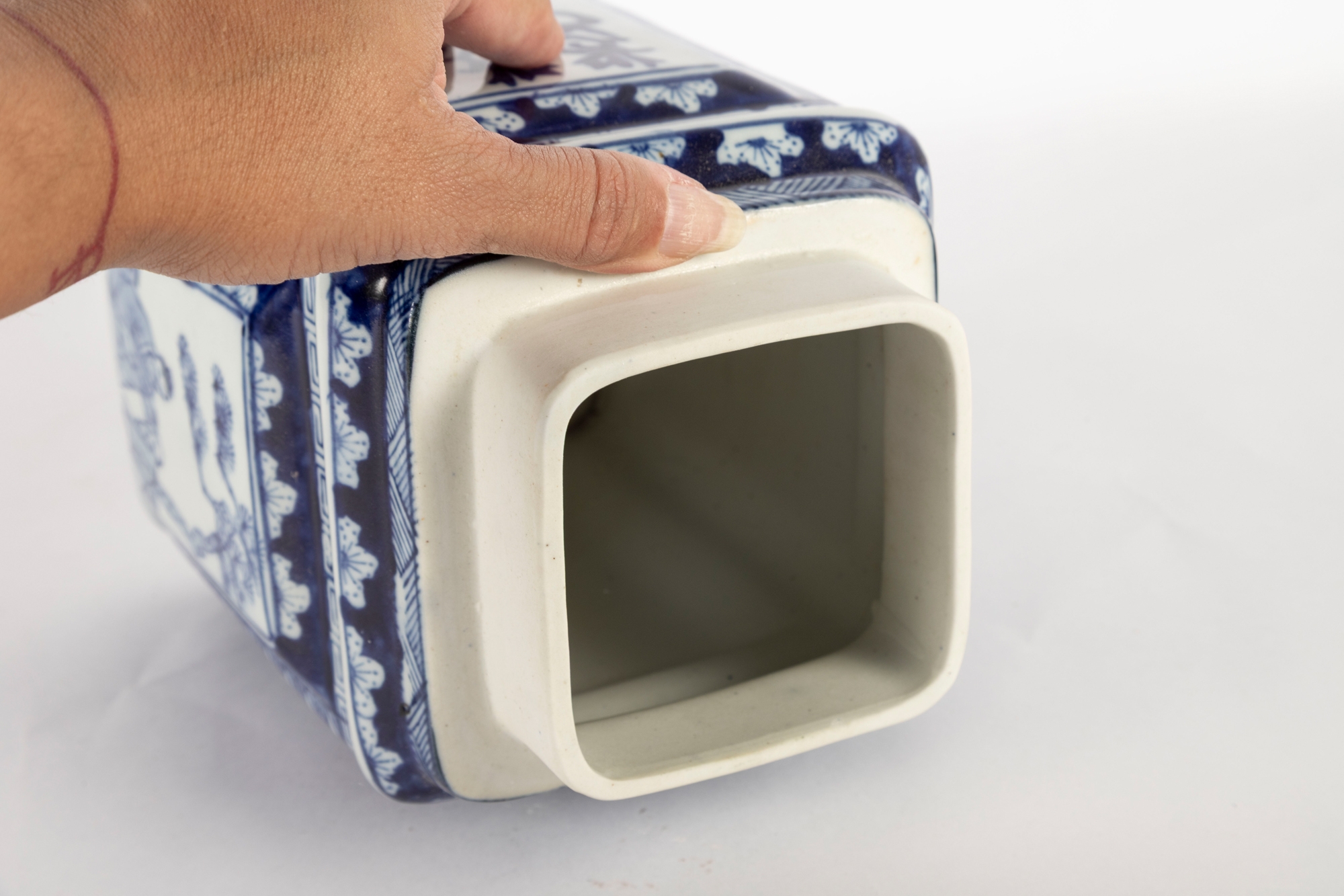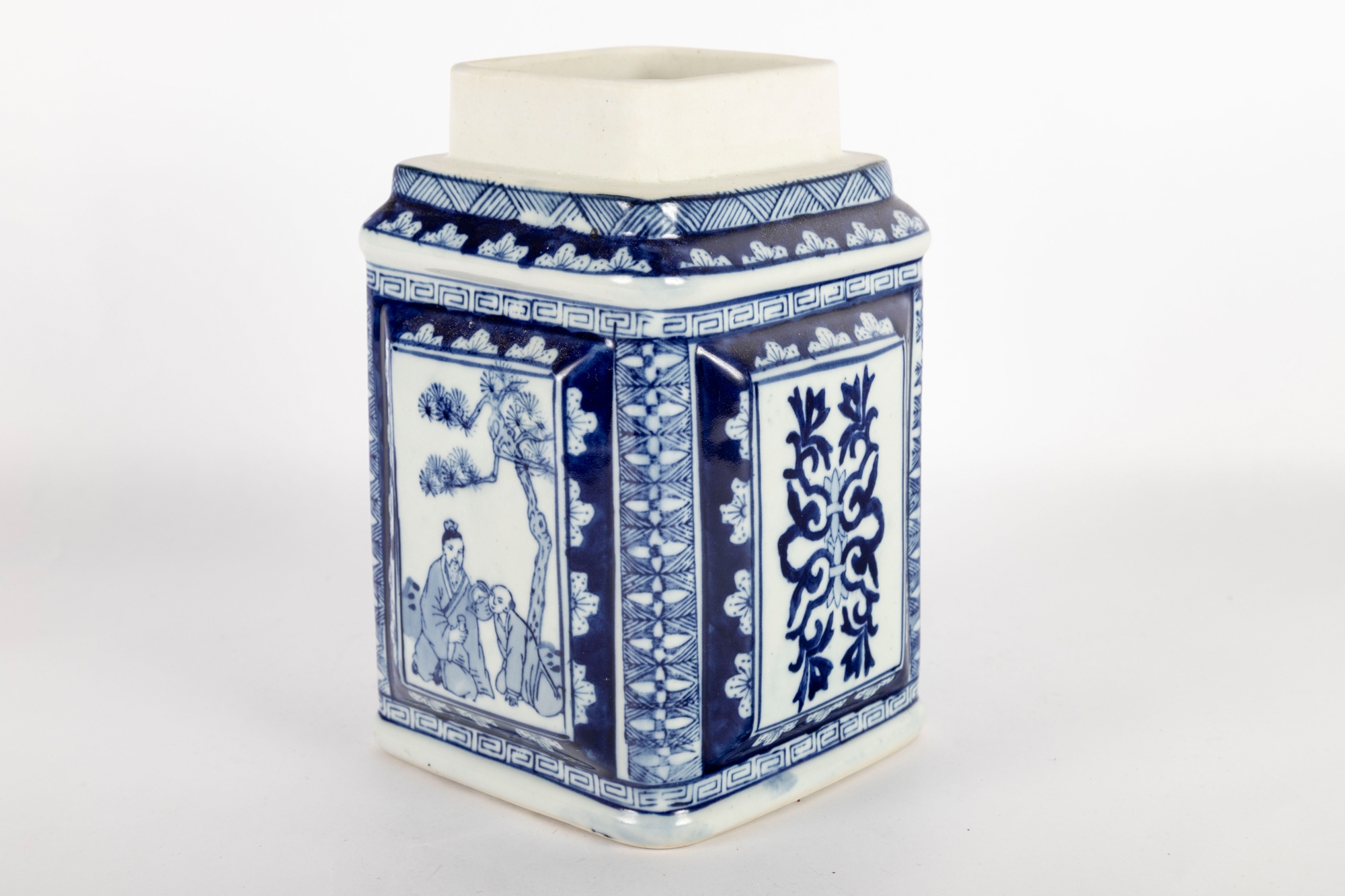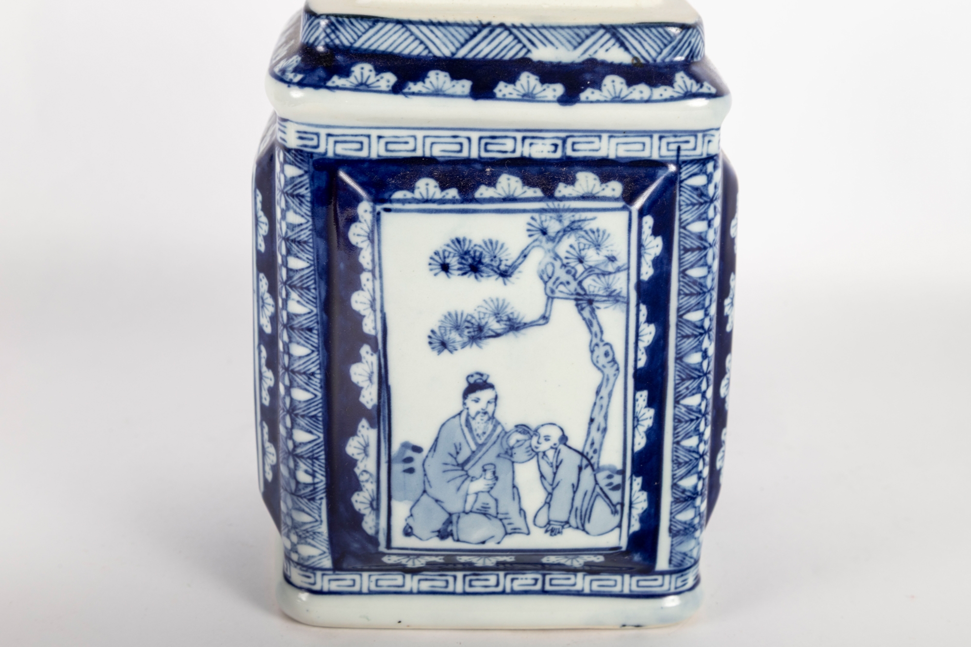 A finely painted late Qing Dynasty blue and white porcelain tea jar of square form, each side decorated with traditional landscape scenes featuring scrolling designs and sitting nobles in rich cobalt tones.