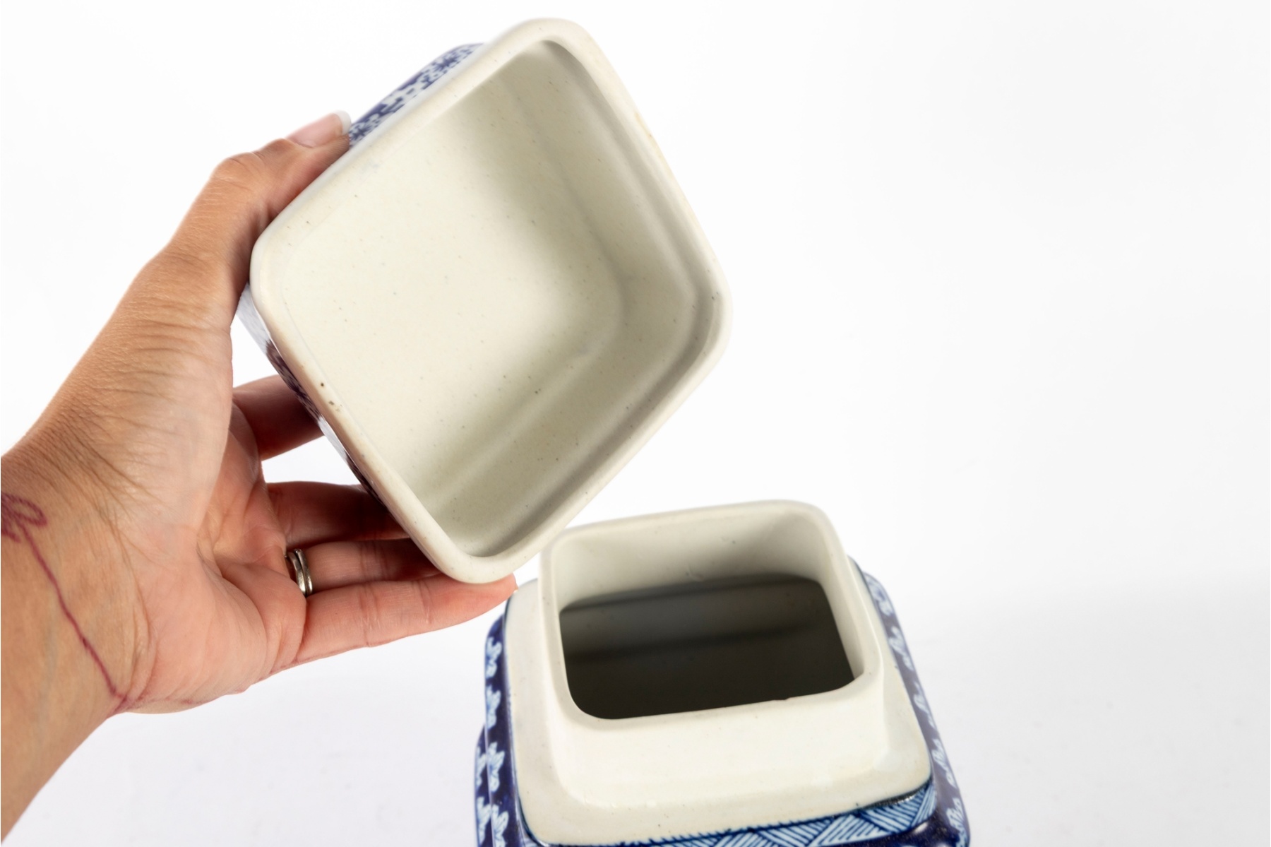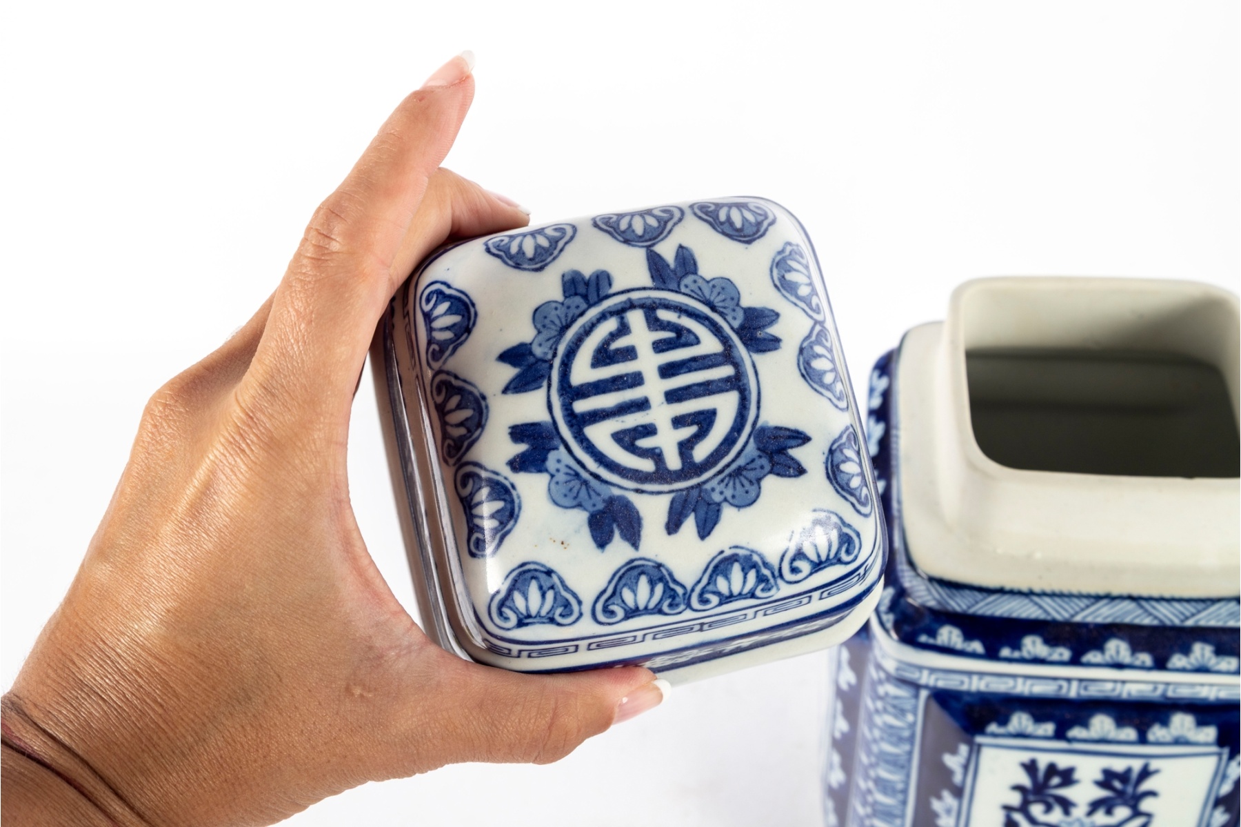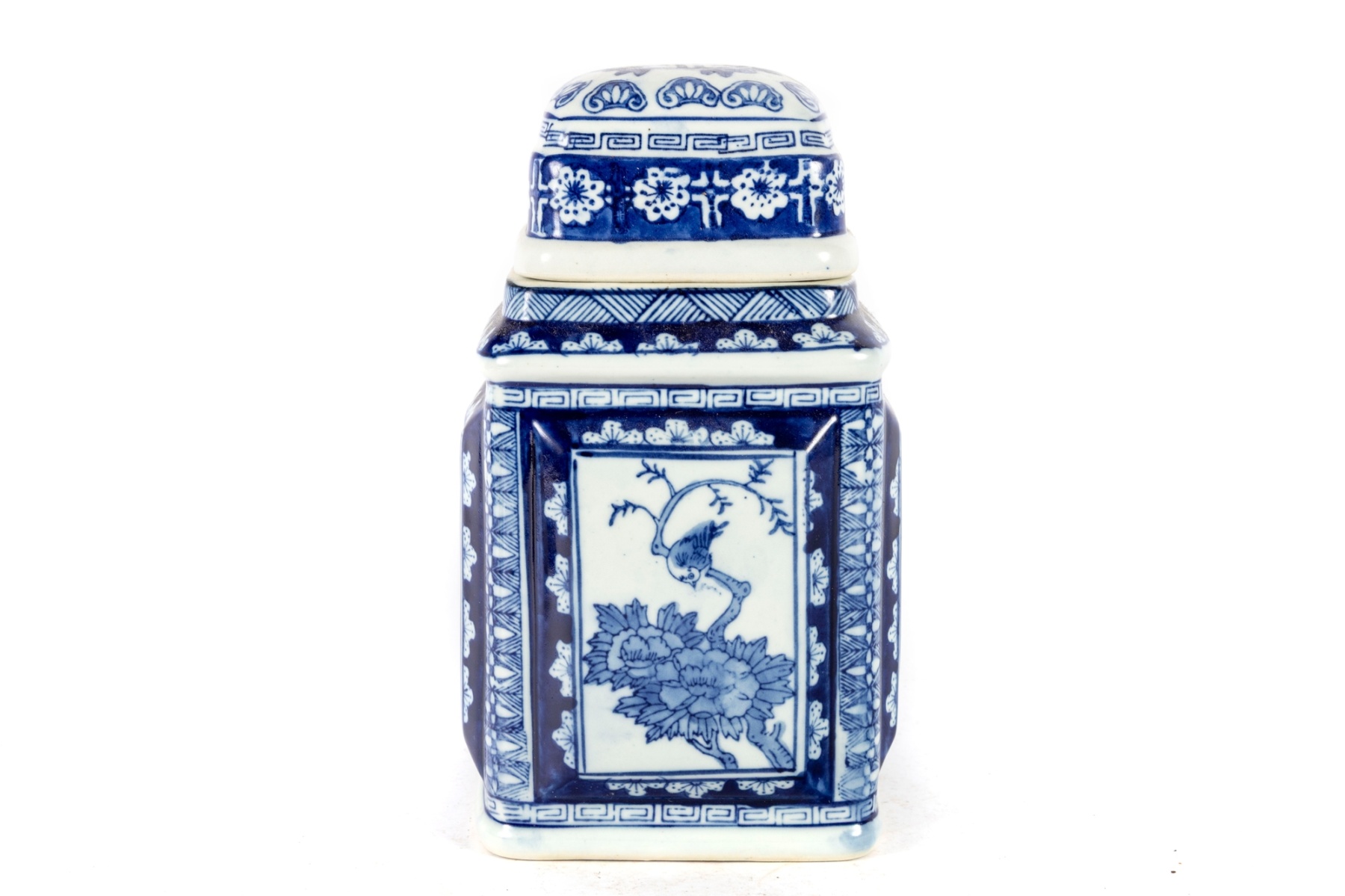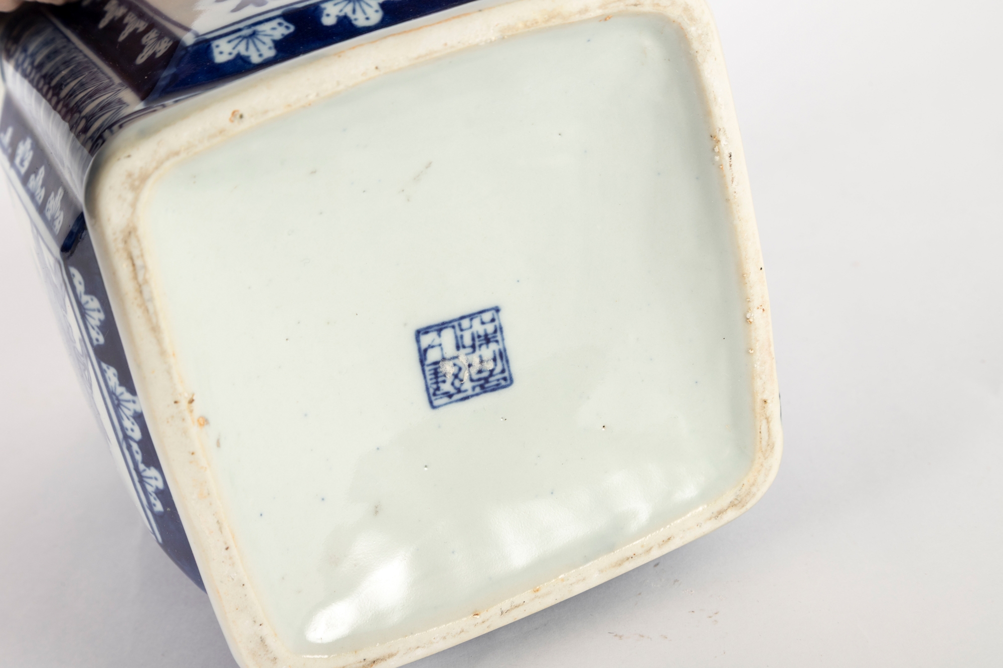 A finely painted late Qing Dynasty blue and white porcelain tea jar of square form, each side decorated with traditional landscape scenes featuring scrolling designs and sitting nobles in rich cobalt tones.