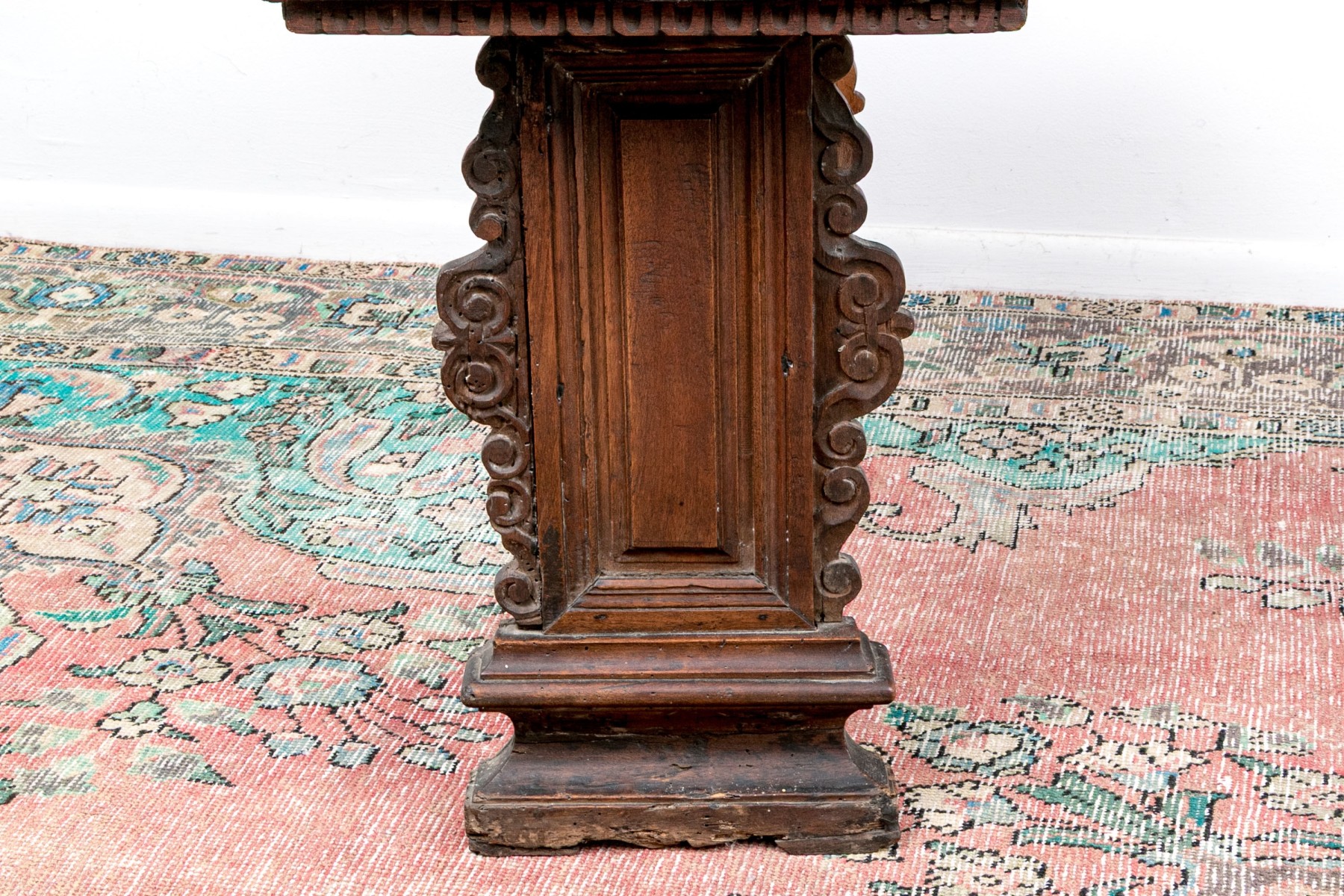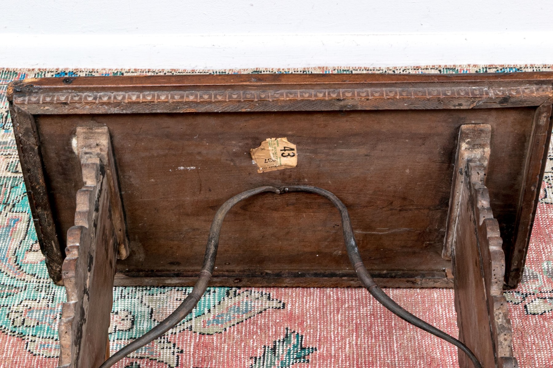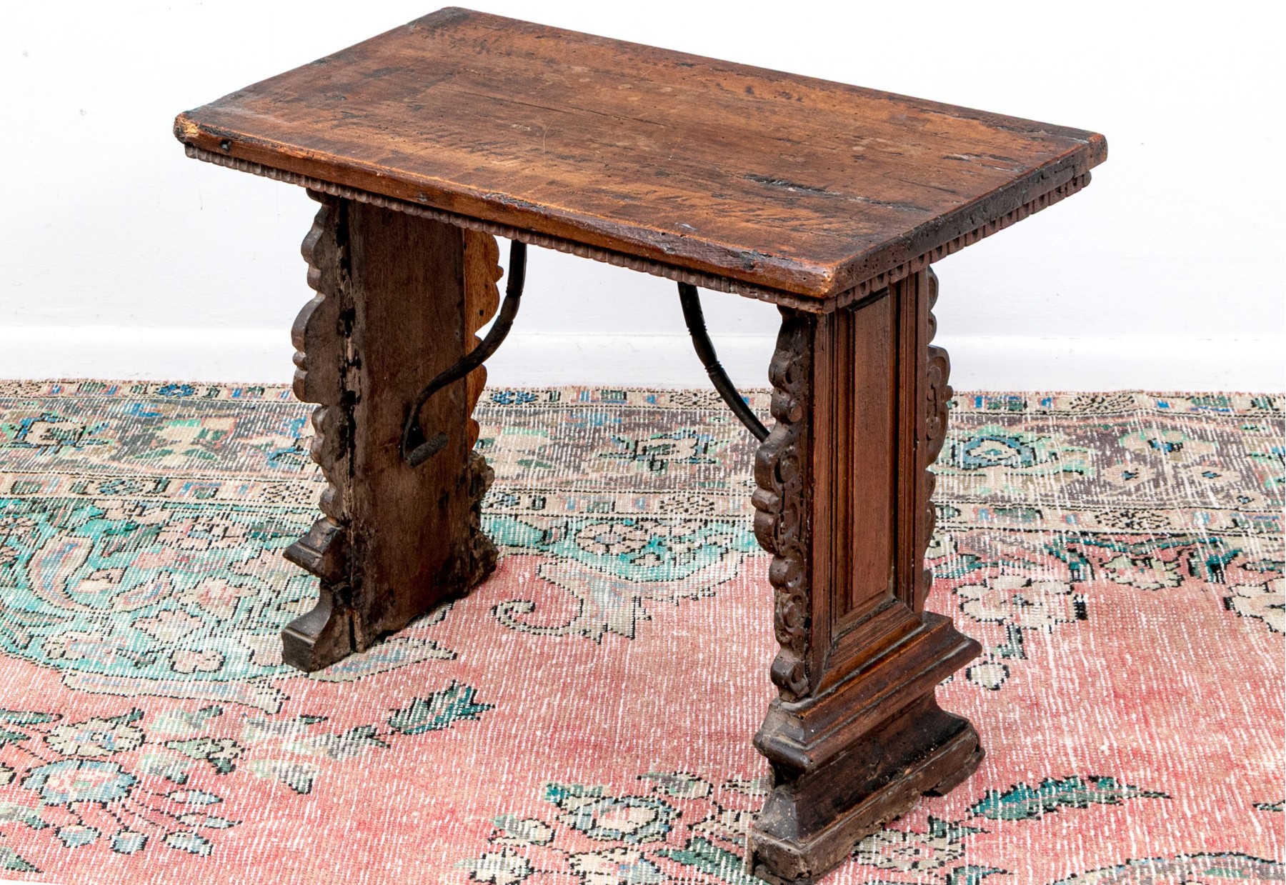 An impressive 17th century or earlier Italian Renaissance table crafted in warm-toned medium brown walnut. The table sports a rectangular top with a decorative recessed edge beneath, supported by trestle style legs with rectangular paneled centers flanked by stunning carved scrolls. Trestle sides are supported by a wrought iron stretcher with a dramatic U-form curve.