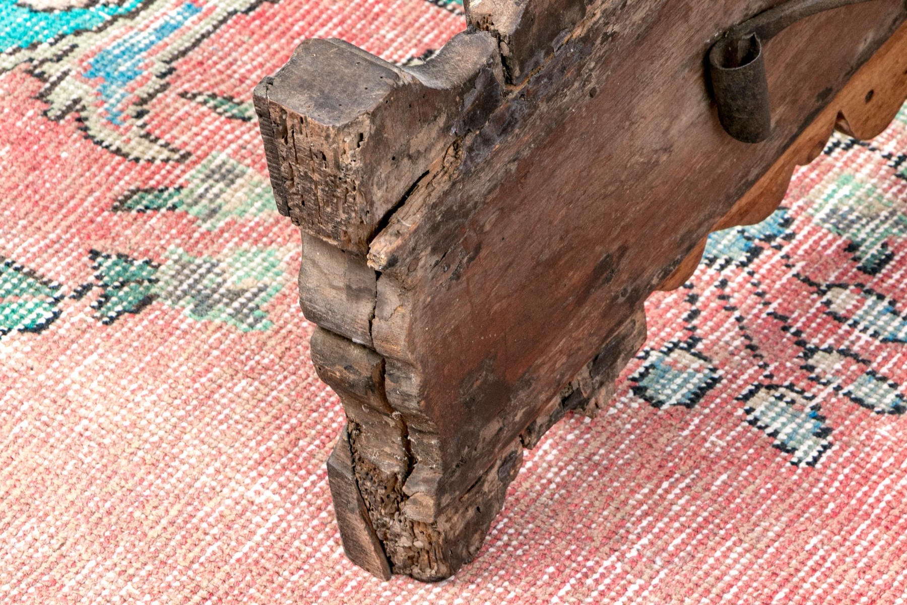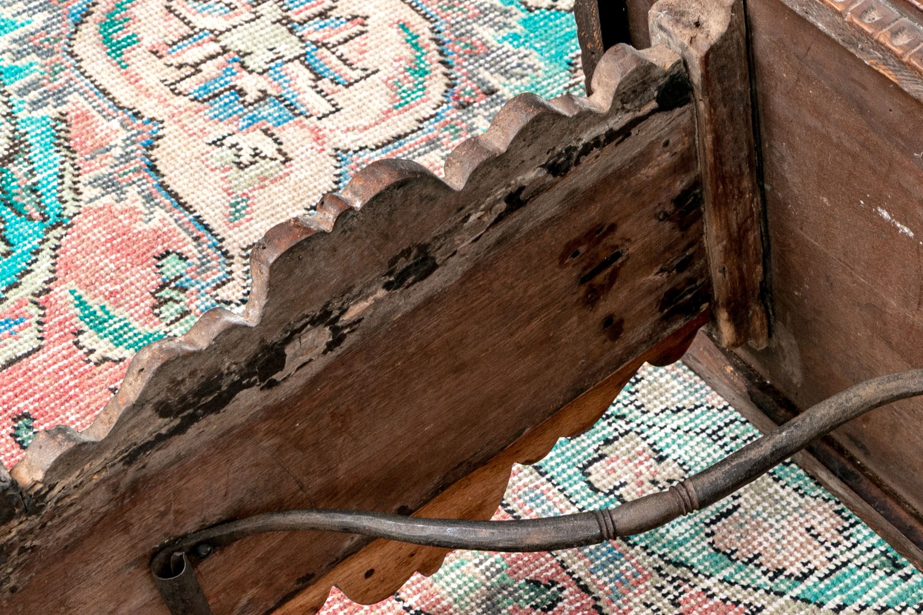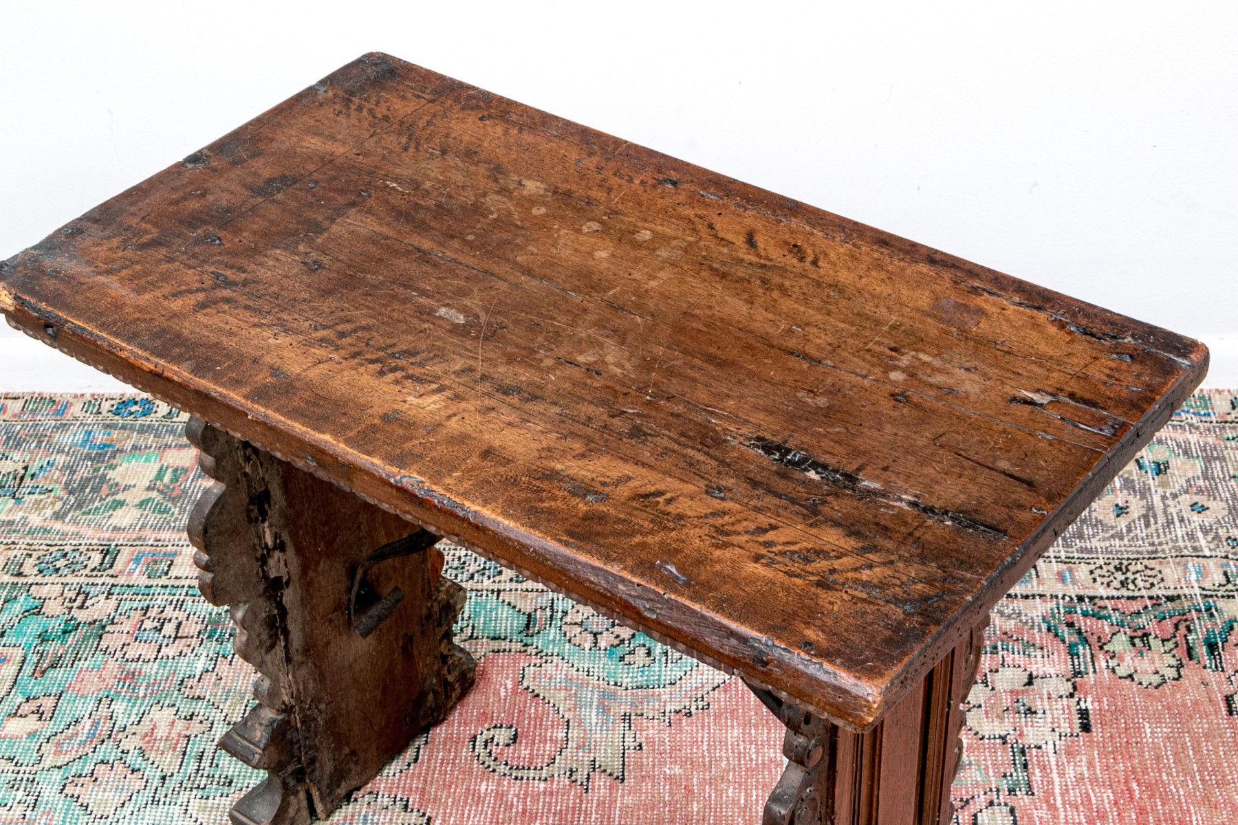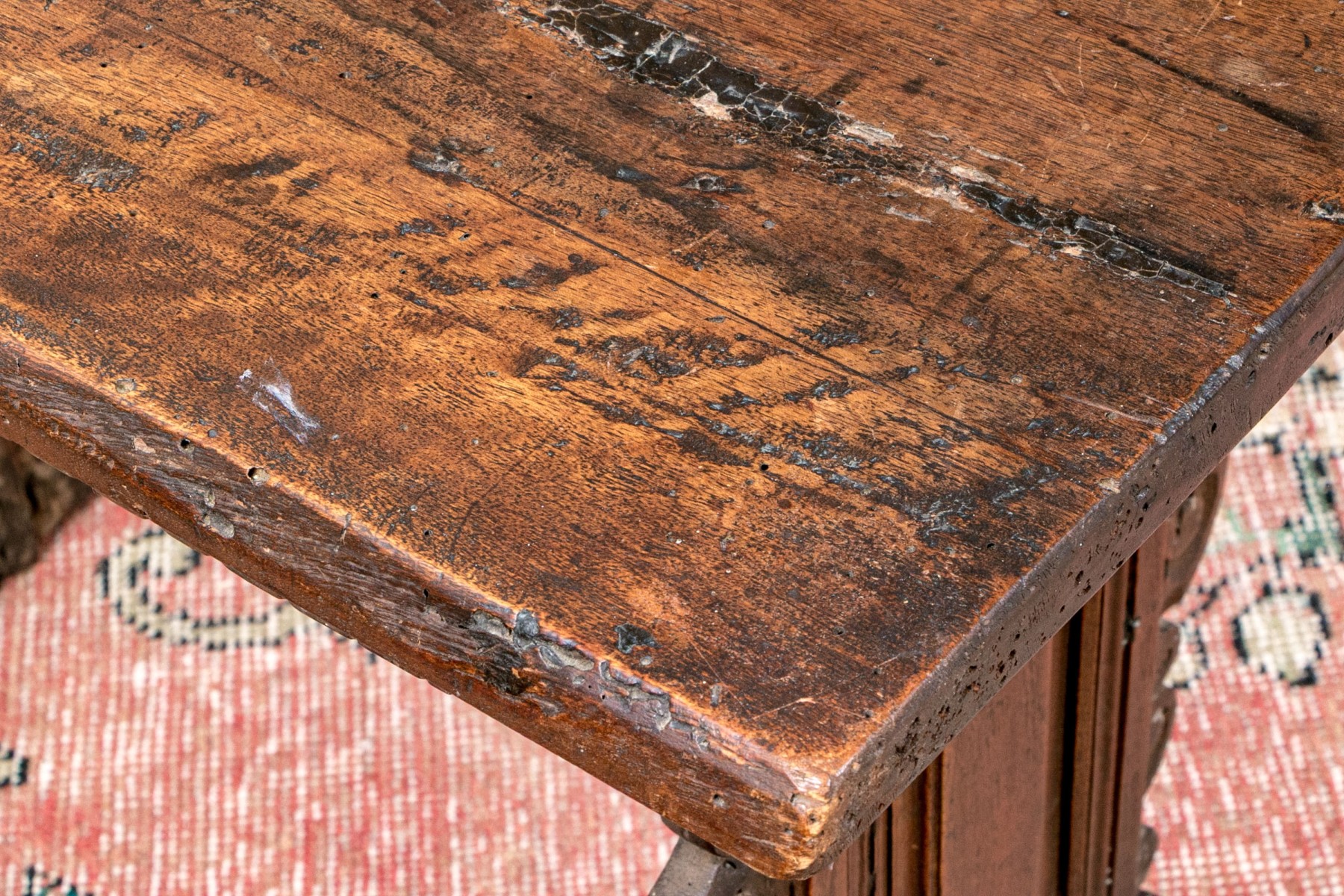 An impressive 17th century or earlier Italian Renaissance table crafted in warm-toned medium brown walnut. The table sports a rectangular top with a decorative recessed edge beneath, supported by trestle style legs with rectangular paneled centers flanked by stunning carved scrolls. Trestle sides are supported by a wrought iron stretcher with a dramatic U-form curve.