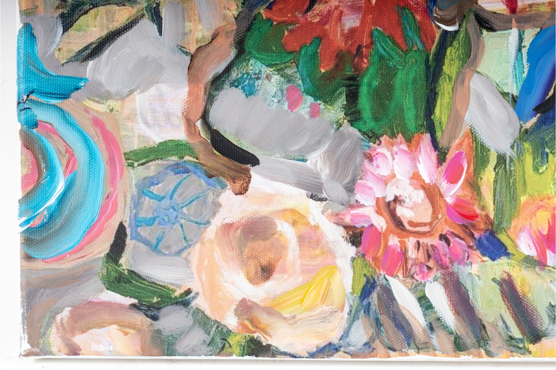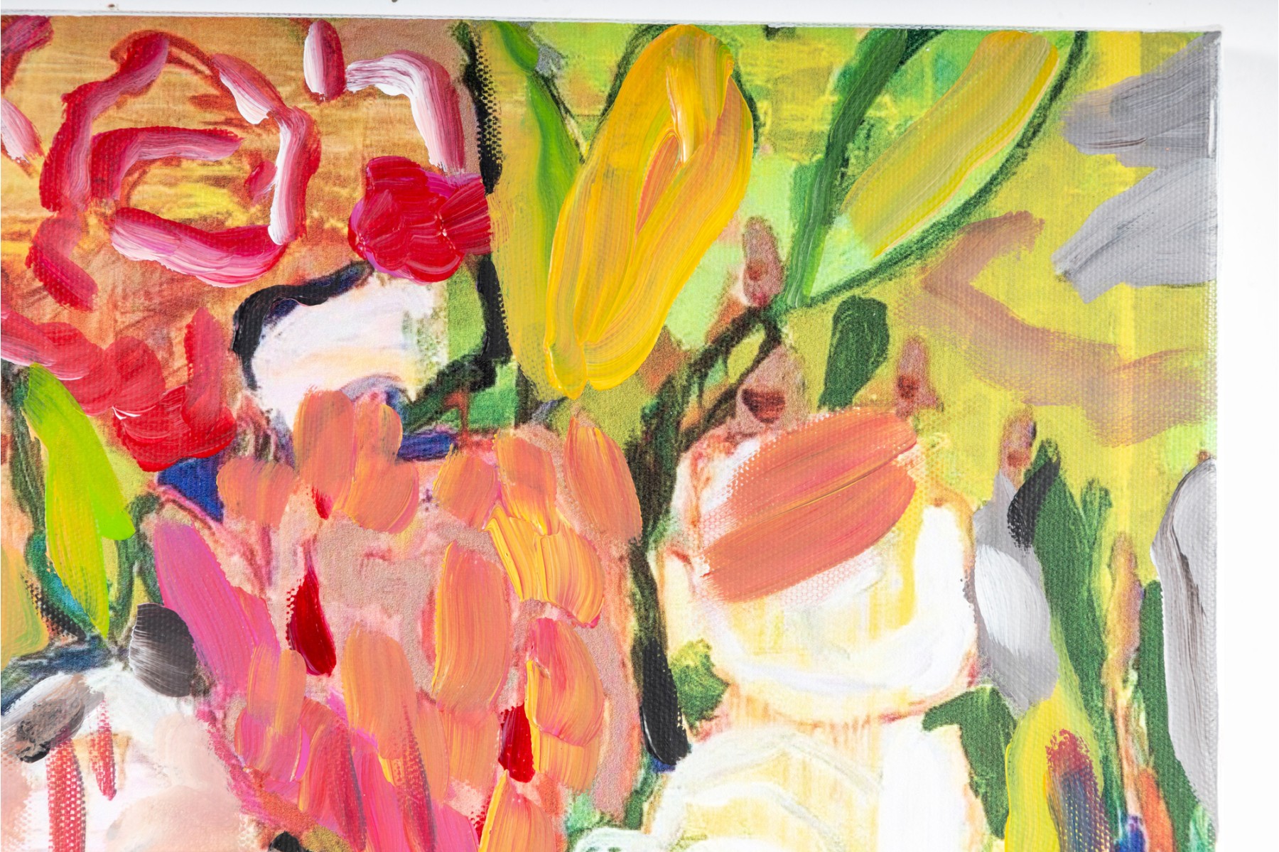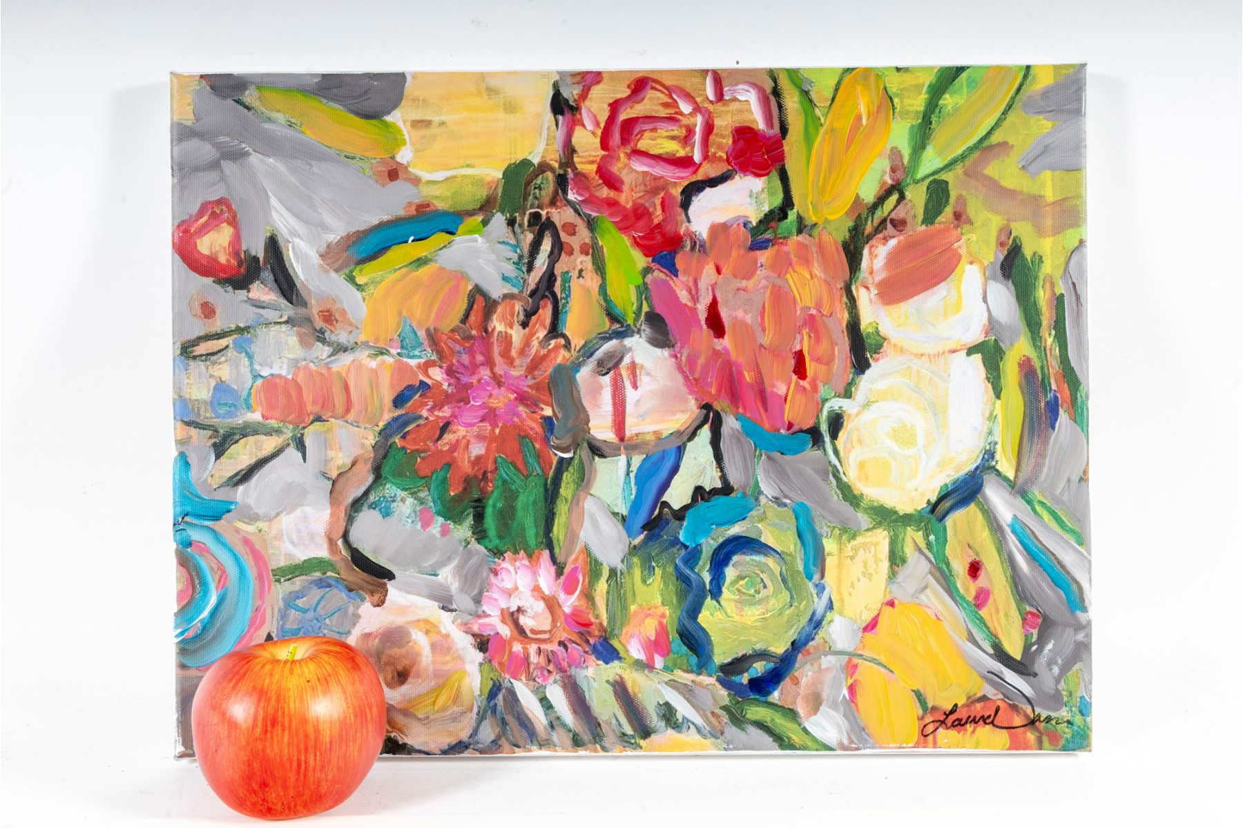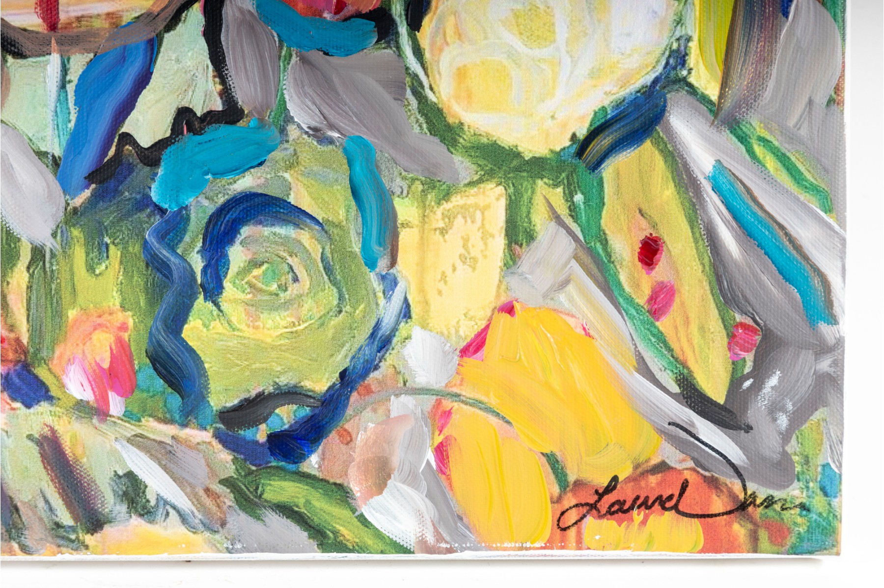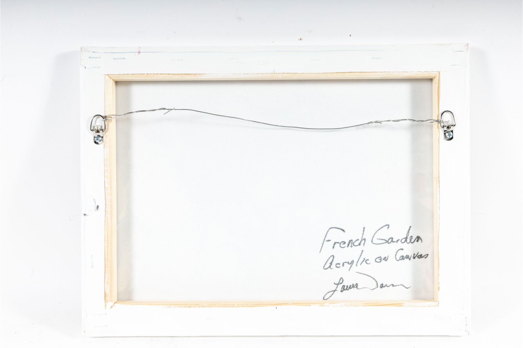 Laura Davis (American [NC], 20th C.) original acrylic on canvas painting entitled, "French Garden" showcasing a vibrant setting of flowers run thick with acrylic brush strokes. The piece is unframed, signed on canvas and en verso.